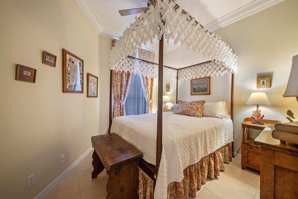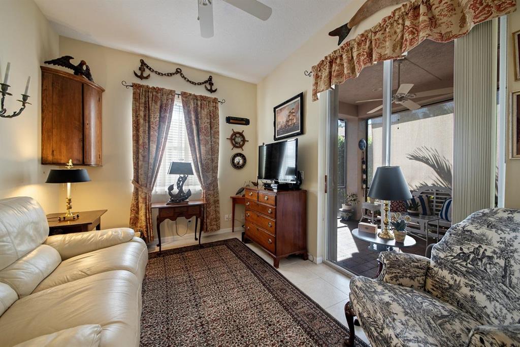 This is one GORGEOUS Villa in Cul De Sac!! no traffic noise! Accordion shutters on this Sunny, 2 bedrooms + Den. Oversized lot .18 acre, Present owner made Extra wide custom driveway, put in a backyard custom paved patio seating area, created an entire private with garden, partly fenced property, Rheem A/c =2011. Custom roller shades in enclosed patio seating area. Upgraded kitchen with granite + S/S appliances. HOA fee includes roof cleaning, exterior painting, basic Comcast cable, lawn maintenance, alarm monitoring. Complex has Tennis, Olympic pool, playground, security gate staffed 24/7, centrally located community. 10,000 sq.ft. clubhouse w/party room, prep-kitchen, manager on site. State of the art gym. No age restrictions. Pets OK. Private road to Publix.