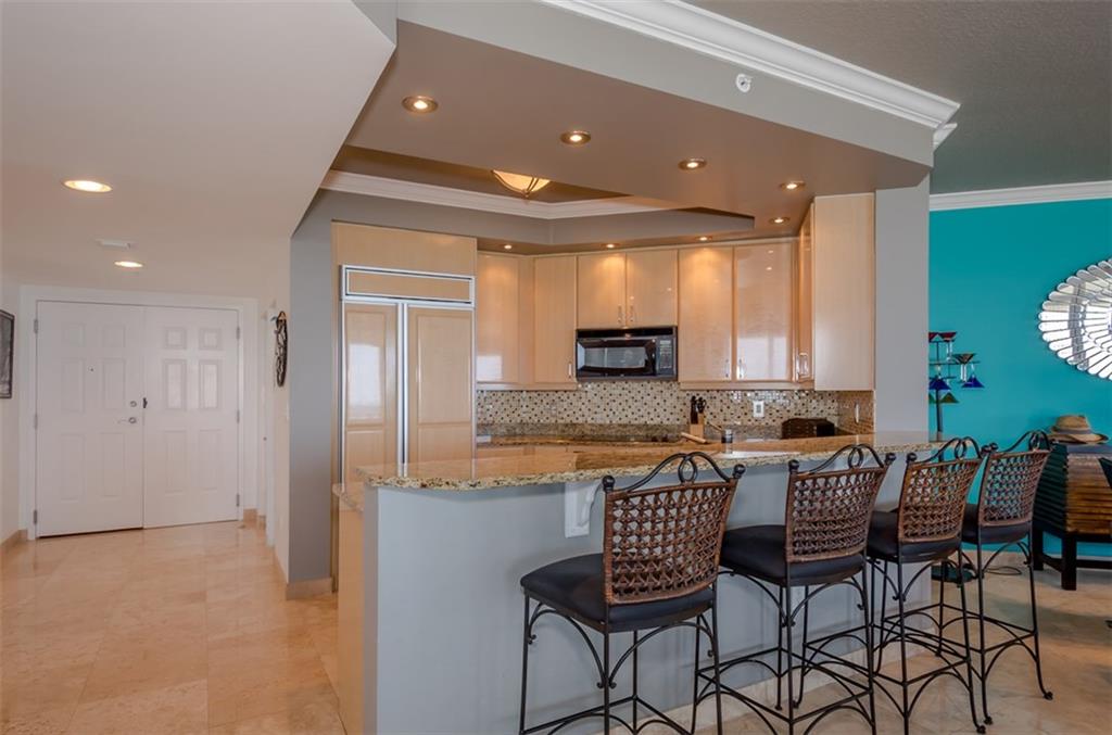 Southeast corner unit w/ incredible wrap around balcony. This sought after 01 unit has direct elevator access from the lobby to your private foyer. Marble floors throughout & on the balcony. Floor to ceiling sliders frame the awesome ocean views. Great ki tchen w/ granite counter tops. Master bedroom has 3 closets & luxurious bath. Great guest quarters at the end of the hall with ensuite bath. 24 hour security, gym, pool, spa, & valet. 2 pets welcome! Can be sold fully furnished!!