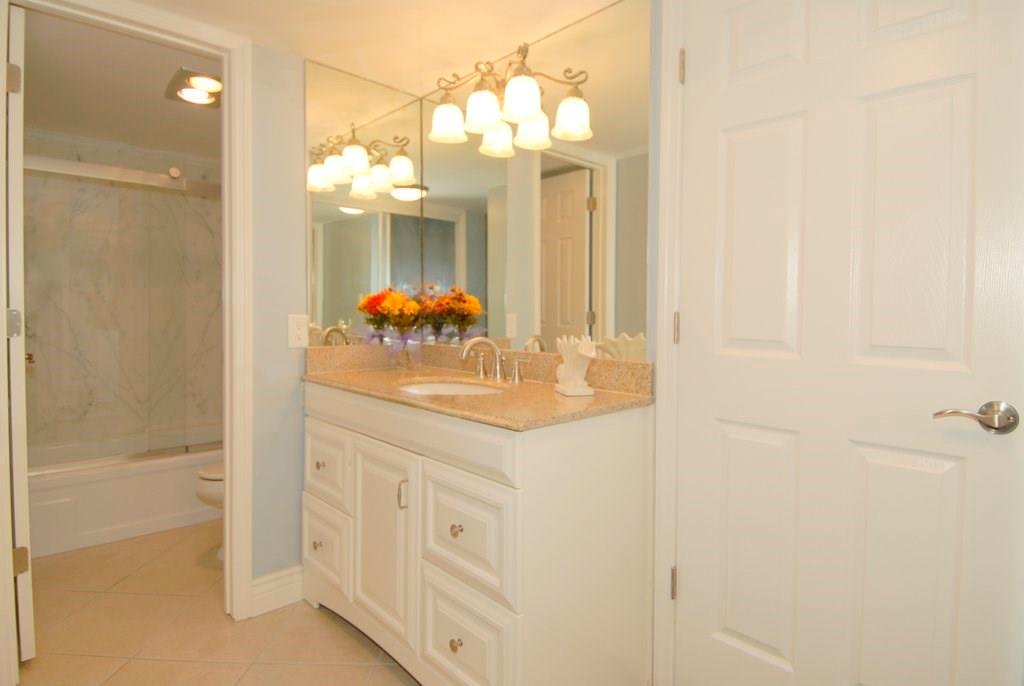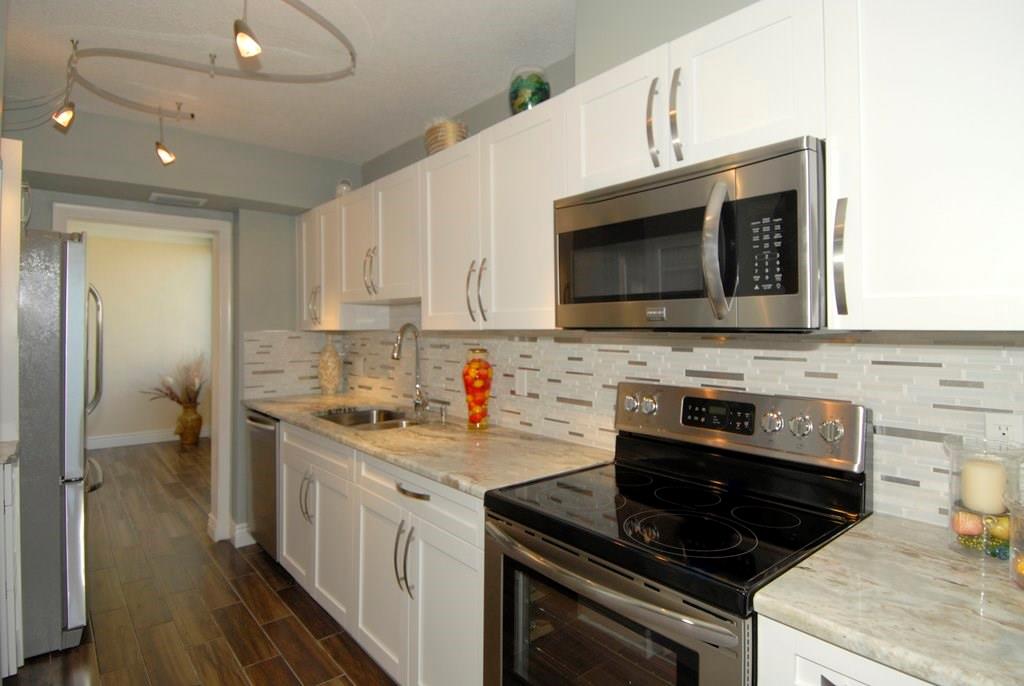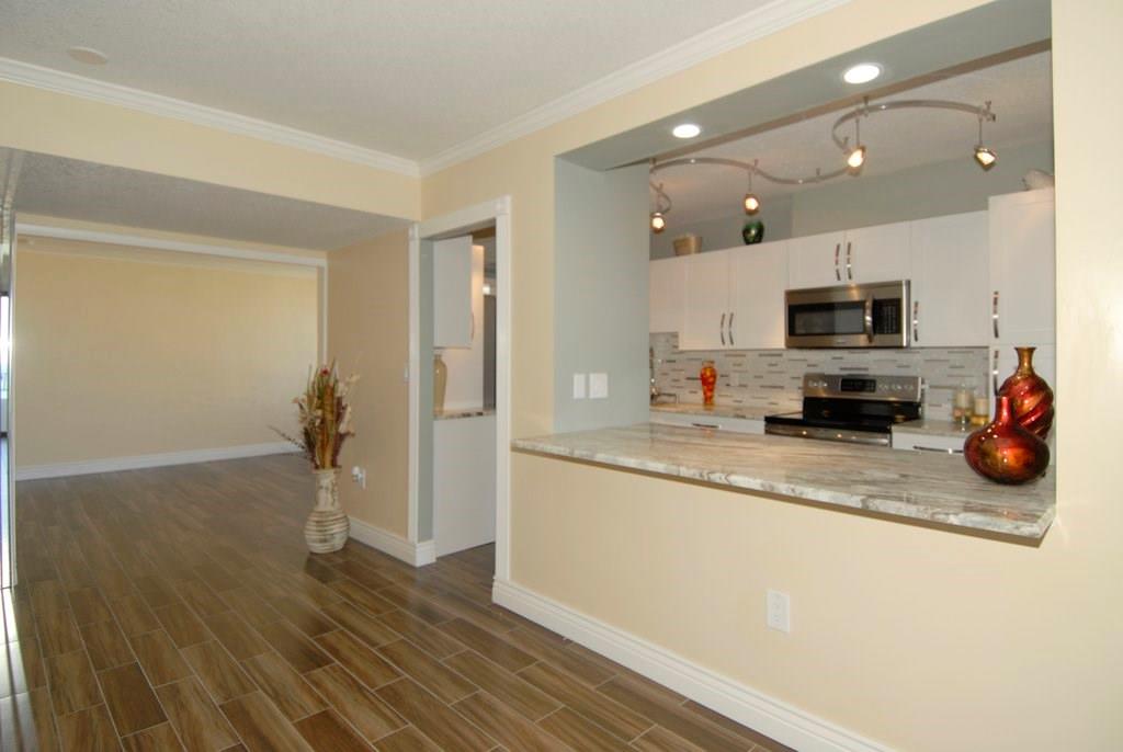 Beautiful direct east ocean view thru 2 big rt angled sliders. 2/2 PLUS 12x14 DEN. Remodeled top 2 bottom! New Hurricane Windows. White Shaker Cabinets, upgraded granite & Backsplash, SS Appliances, kitchen open to living room, wood look tile throughout, New 6 panel doors & hardware, 5" baseboards, crown molding, ceilings done, fresh paint, frameless glass shower doors, new light fixtures & more. Washer/Dryer hook up inside. Private Deeded Beach Club, boat docks when avail, garage, low maint. Must see!
