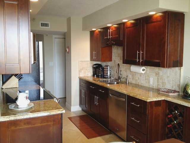 Beautifully & totally remodeled (2008), corner unit. Granite countertops in kitchen & baths. Entertainment center/murphy bed in living room for extra sleeping space. Impact windows. View of ocean, intracoastal & city. Building on the sand. Split bedroom plan. Formal dining room could be used as den, office or make a 3rd bedroom. Breakfast area off living room & kitchen. Laundry/storage room in unit. Beachfront pool. Fitness center, sauna, community room w/kitchen facilities. Small pet welcome..