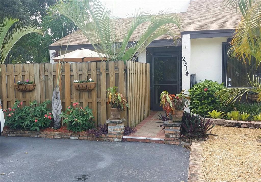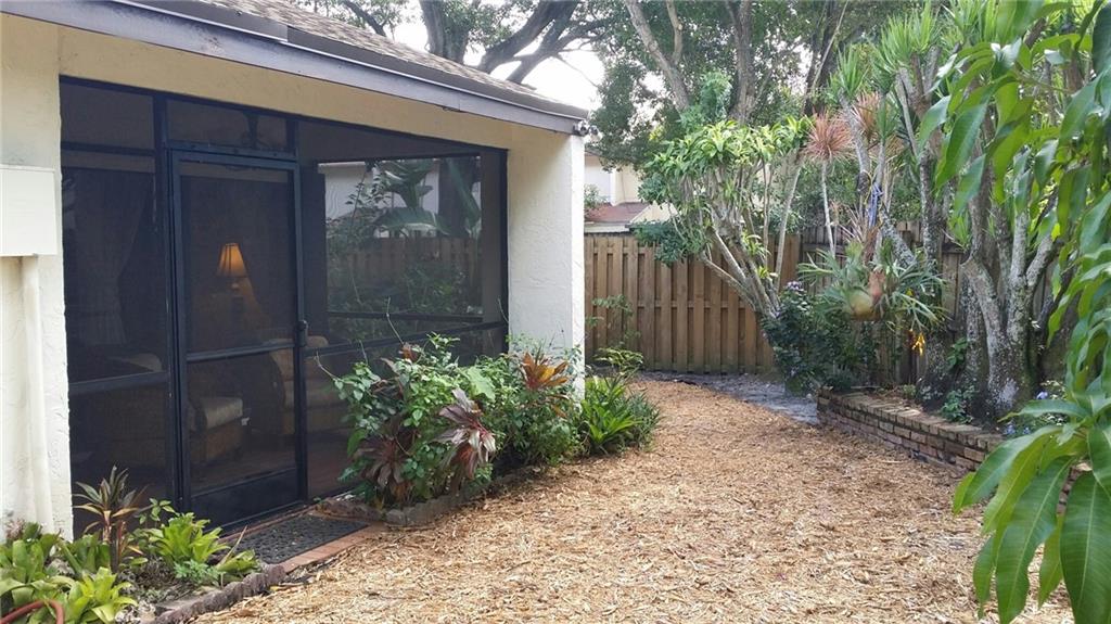 Spacious 2/2 with open floor plan.vaulted beamed ceilings and beautiful brick fireplace in the living room. Completely renovated from top to bottom! 2015 new roof, renovated kitchen and bathrooms..the list goes on. Master bedroom has a newly renovated ensuite bathroom. Sliding glass doors leading to the brick pavers in privately fenced tranquil back garden with built-in-barbeque area perfect for Florida entertaining. Steps from the community park. Storage shed is included.
