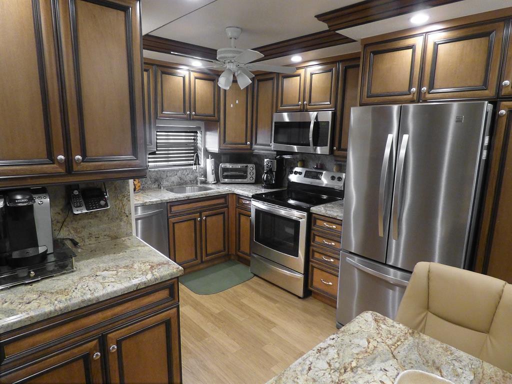 Upgraded full 2 bed in bldg 1 near clubhouse. Incredible Kitchen w/ custom built cabinets,stainless & granite & crown molding. Washer/dryer inside. Redone bathrooms w/raised toilets. Beautiful PGA golf view. Laminate floors in foyer, kitchen and living room. Newer hot water. Bedroom furn available. Paid up rec lease. Free golf, 14 tennis courts, 7 pools, theater, fitness center, restaurant , 24 hr security, Housing for older persons authorized (HOPA).. See Broker Remarks for occupancy qualifications.