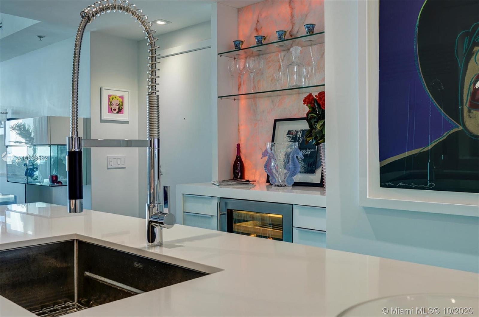 WOW! This impeccably renovated direct ocean view 2BE/2BA apartment features the best of interior design: gorgeous porcelain floors, top of the line kitchen; Poggenpohl glass veneer cabinets, Subzero & Miele appliances, quartz & onyx multi color changing center island & bar w/built in wine cooler. Master Suite w/walk in closet & chic "noir" bath w/Jaccuzzi tub. Both bath's cabinets & tile by Porcelanosa. Upgrades include; living room fireplace, recess lighting, black out & sheer window treatments, top line faucets, Toto toilets. Porcelanosa wave tile accent wall in the foyer. Mosaic is a luxury resort style building minutes from Faena district w/top notch services & amenities including infinity pool, hot tub, club room, theater, valet & concierge. Chandeliers excluded.