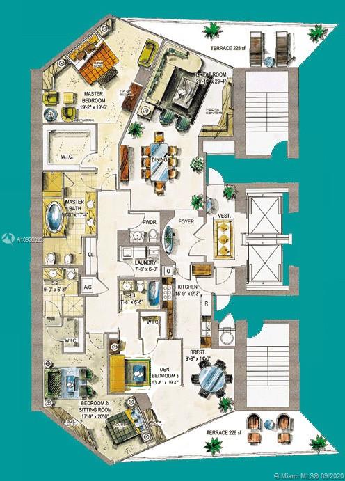 Incredible opportunity to own a luxurious villa in the sky on high 19th floor. Step off a private elevator through double doors into this large flow-thru condo with oversized North and South balconies. Panoramic ocean and Intracoastal views from every room through floor-to-ceiling glass. Beautifully finished with bamboo floors, granite counters, Italian cabinetry, high-end appliances, Jacuzzi tub, frameless glass shower and built-in closets. Two parking spaces by elevator. Unique modification to floor plan creates open den. Ocean Palms is a majestic and modern tower located on 240 feet of beautiful Hollywood Beach. The five-star amenities include a two-story fitness center, spa with sauna and massage rooms, media room, party room, billiard room, ocean-side pool, hot tub, and tennis courts.