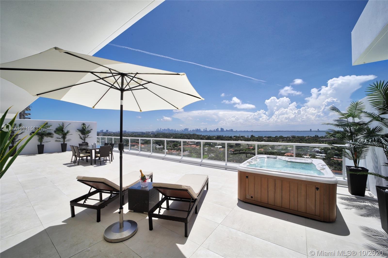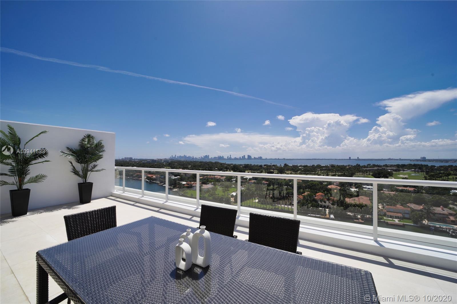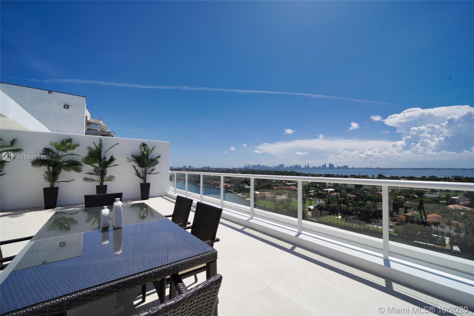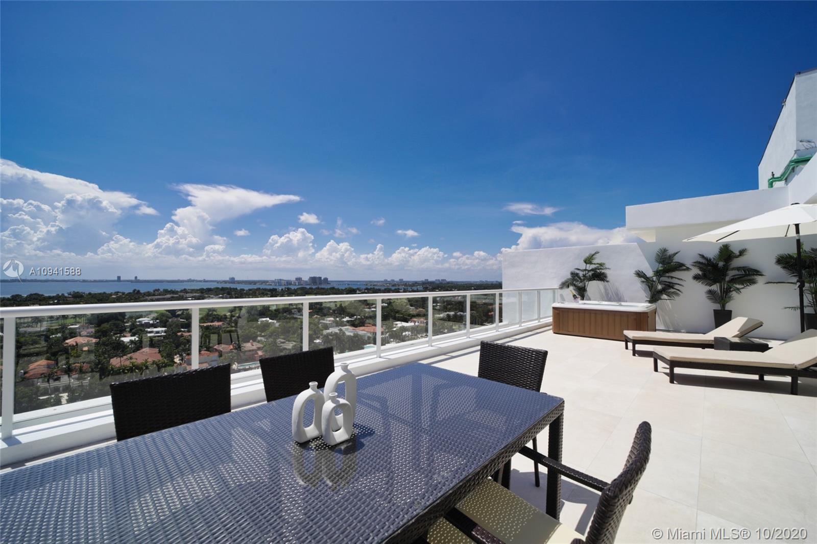 THIS LUXURY 3 BEDROOMS, 3 FULL BATHROOMS PENTHOUSE IS DESIGNED FOR YOU. 2,100 SQUARE FEET UNDER AIR CONDITIONING & AN ADDITIONAL 1,200 SQUARE FEET OF TERRACE W/ GORGEOUS VIEWS OF THE INTRA-COASTAL, BISCAYNE BAY, LA GORCE GOLF COURSE, & DOWNTOWN MIAMI AND THE SUNSET. AMAZING JACUZZI ON TERRACE. THIS UNIQUE PENTHOUSE INCLUDES A POOL-SIDE CABANA W/DRESSING ROOM & FULL BATH. THE RESIDENCE COMES FULLY FURNISHED, FEATURING ITALIAN SNAIDERO CHERRY WOOD KITCHEN CABINETRY, MIELE APPLIANCE & MEDIA CENTERS. CHERRY WOOD FLOORS. MARBLE BATHROOMS. LAUNDRY ROOM WITH SINK. PRIVATE STORAGE ON THE APARTMENT FLOOR. PRIVATE WINE CELLAR. 3 PARKING SPACES ASSIGNED. BUILDING HAS BEEN COMPLETELY RENOVATED WITH NEW GYM, POOL AREA, ELEVATORS, LOBBY AND HEATED POOL. BUILDING HAS PRIVATE MARINA. BOATERS DREAM.
