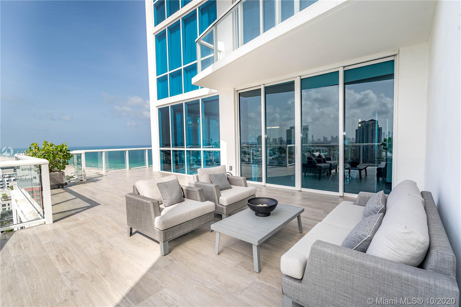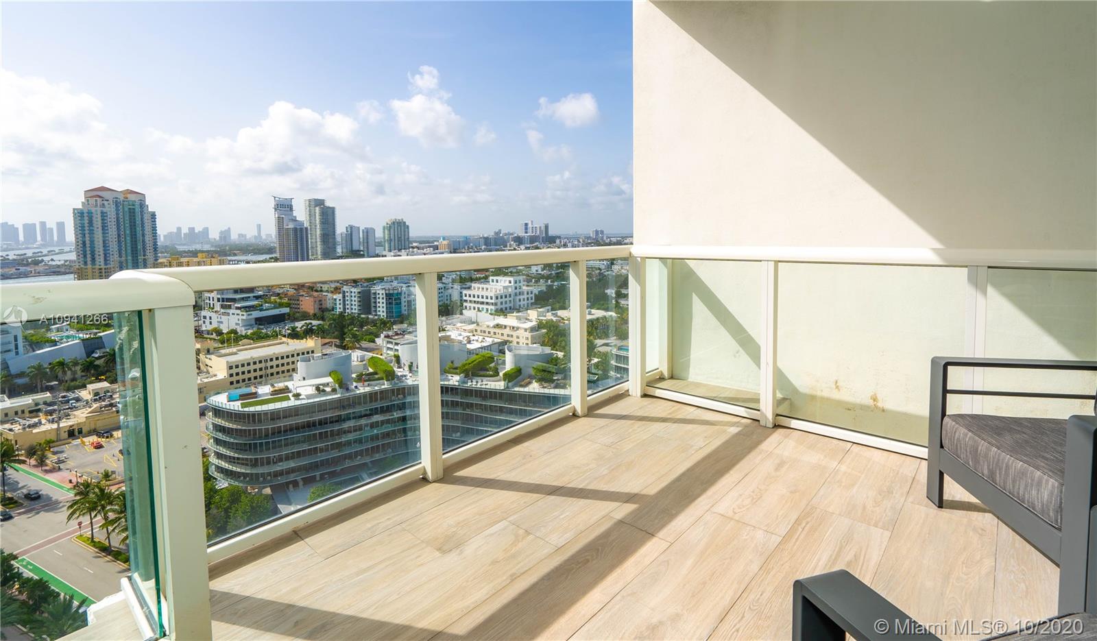 Extremely rare & unique (only 4) with 1000+ SFT spread over 3 covered terraces with sweeping views of the ocean, coastline, SoBe, Bay & Brickell. YES, you get the best of all worlds, from breakfast sunrise to romantic sunsets! Spacious DOUBLE corner unit, tons of 10 ft floor to ceiling impact windows, desirable split ensuite master bedrooms each with a private balcony. 92 inch projection TV with surround sound in living & master. Chef's kitchen w Subzero, Miele Appls. Marble & bamboo wood flrs, 2 wine coolers. Private fingerprint elevator direct to your unit. Over 12 lush acres of 5-star amenities incl 24-hour security, 3 tennis courts, private beach pavilion, 2 lagoon style pools, 23K SFT fitness, spa & lap pool. Turn-key furniture included, simply unpack & enjoy! Space for home office.