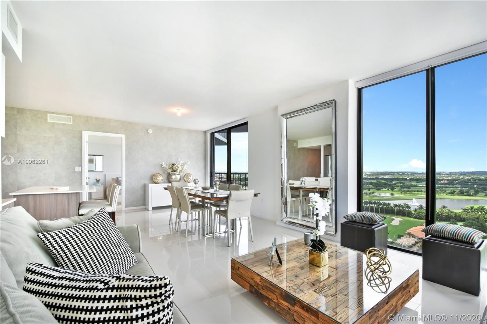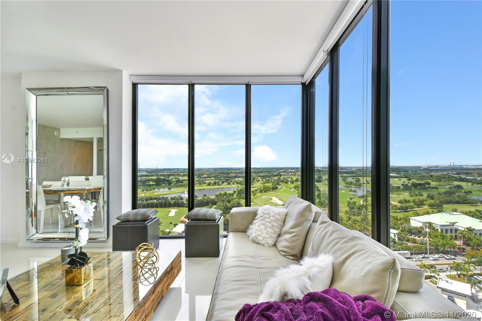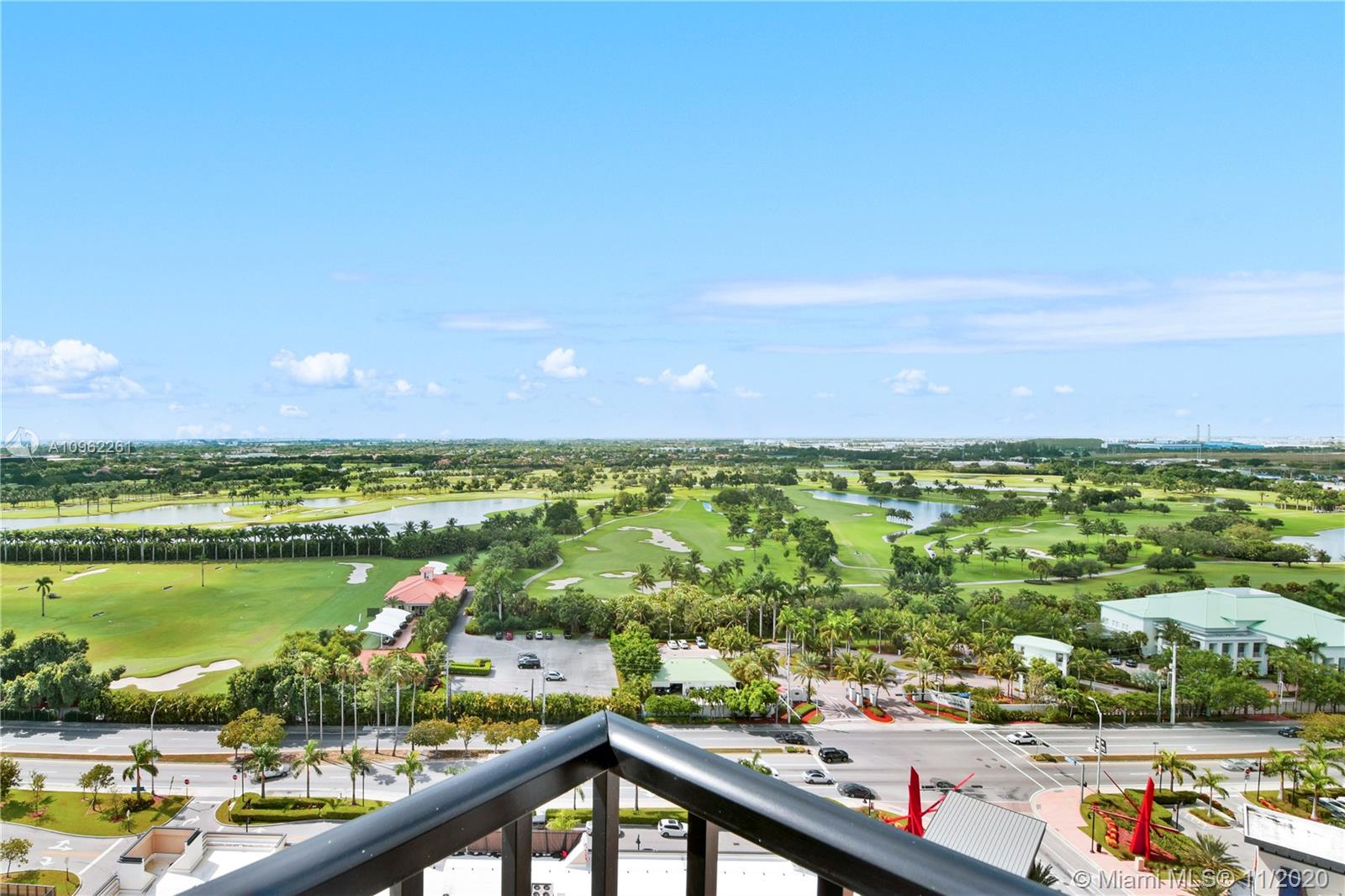 Location, location, location plus incredible WOW! views from this elegant corner residence on the 18 floors!!! 3 bed/2 baths PLUS A DEN!! Yes, a DEN!!! w/panoramic views, overlooking the Gulf course and City Skyline! Porcelain floors, built-in Italian closets, modern kitchen w/quartz countertops, S.S. appliances, washer/dryer & nice balcony with w/breathtaking views! Excellent amenities including 24 hr concierge, valet parking service, pool, conference room, lounge, children playroom, modern gym w/spinning room & massage room. Centrally located near Miami Airport, Downtown Doral Charter School, Restaurants, Malls & highways! The den is currently used as a family room to watch TV and it has a wall unit. Offering 2 parking spaces, storage!! Property in mint condition and a pleasure to Show!