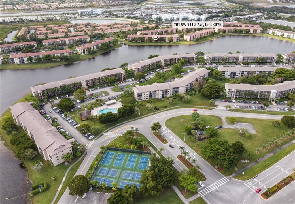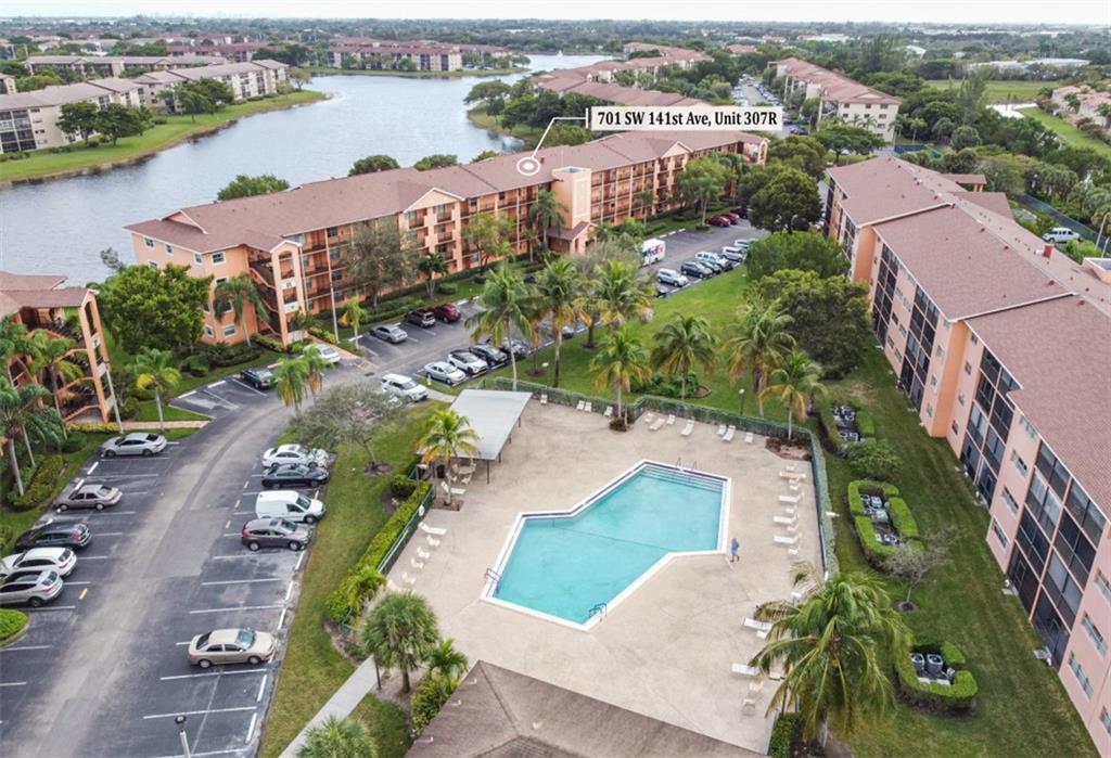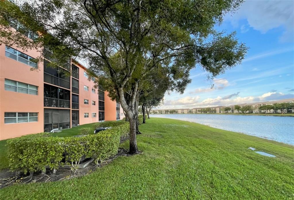 Perfectly placed Century Village home with gorgeous lake views! Offering easy access to the community pool, health club, and clubhouse and only steps from the elevator this third central location has it all. The light and bright interior features updated laminate wood flooring that perfectly complements any decor and makes daily cleanup a breeze. Enjoy serene lake views from your screened balcony offering the ideal outdoor expansion to the living room.