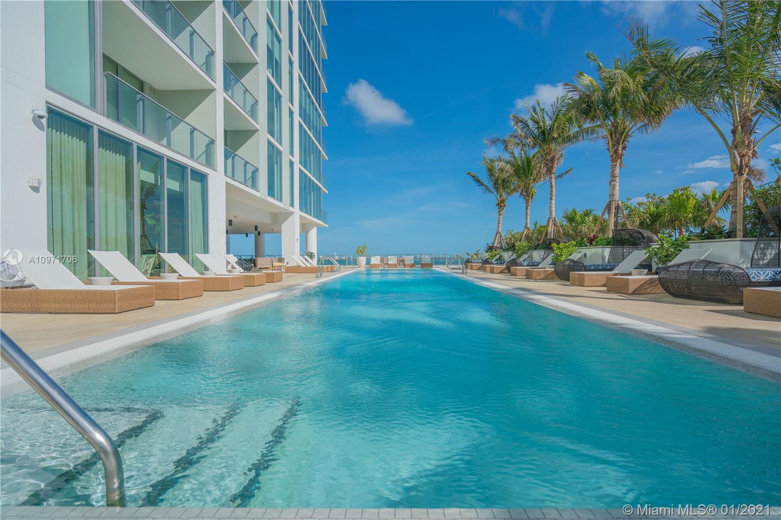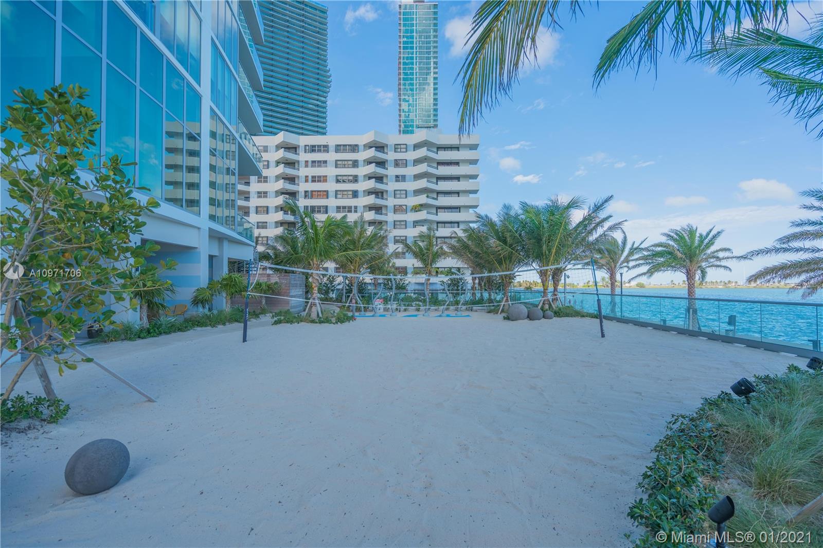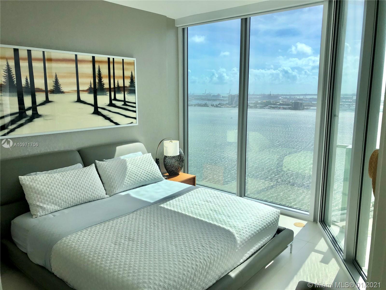 Beautiful upgraded 1 bed + den (enclosed with murphy bed) and 2 baths at luxury building. Professionally decorated by Brazilian designer Myrna Porcaro. Upgrades include kitchen island and wine fridge, wallpaper, vertical garden pillar, murphy bed, & electric shades. Tile floors throughout. Beautiful VIEW OF BISCAYNE BAY, Edgewater & Downtown Skyline, and sunset view. Private Elevator with private foyer entrance; Snaidero Kitchen with Miele appliances; 10 ft ceilings with floor to ceiling glass windows; spacious balcony. Amazing AMENITIES with a Beach Club, elevated sand/beach area, bayfront pool, sauna & steam room, 2 massage rooms, tennis & basketball courts, beach volleyball court, state of the art gym, 6th floor with 2nd pool, bbq area, 2 party rooms. Assigned parking (#233)