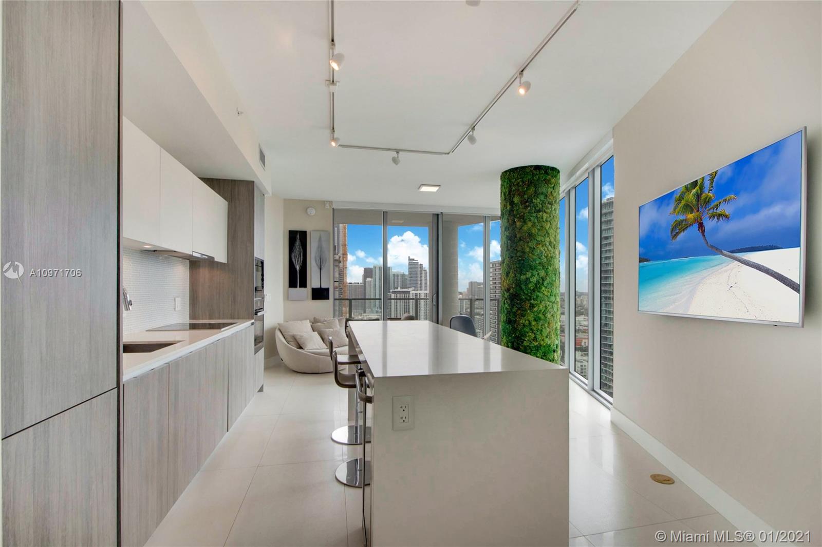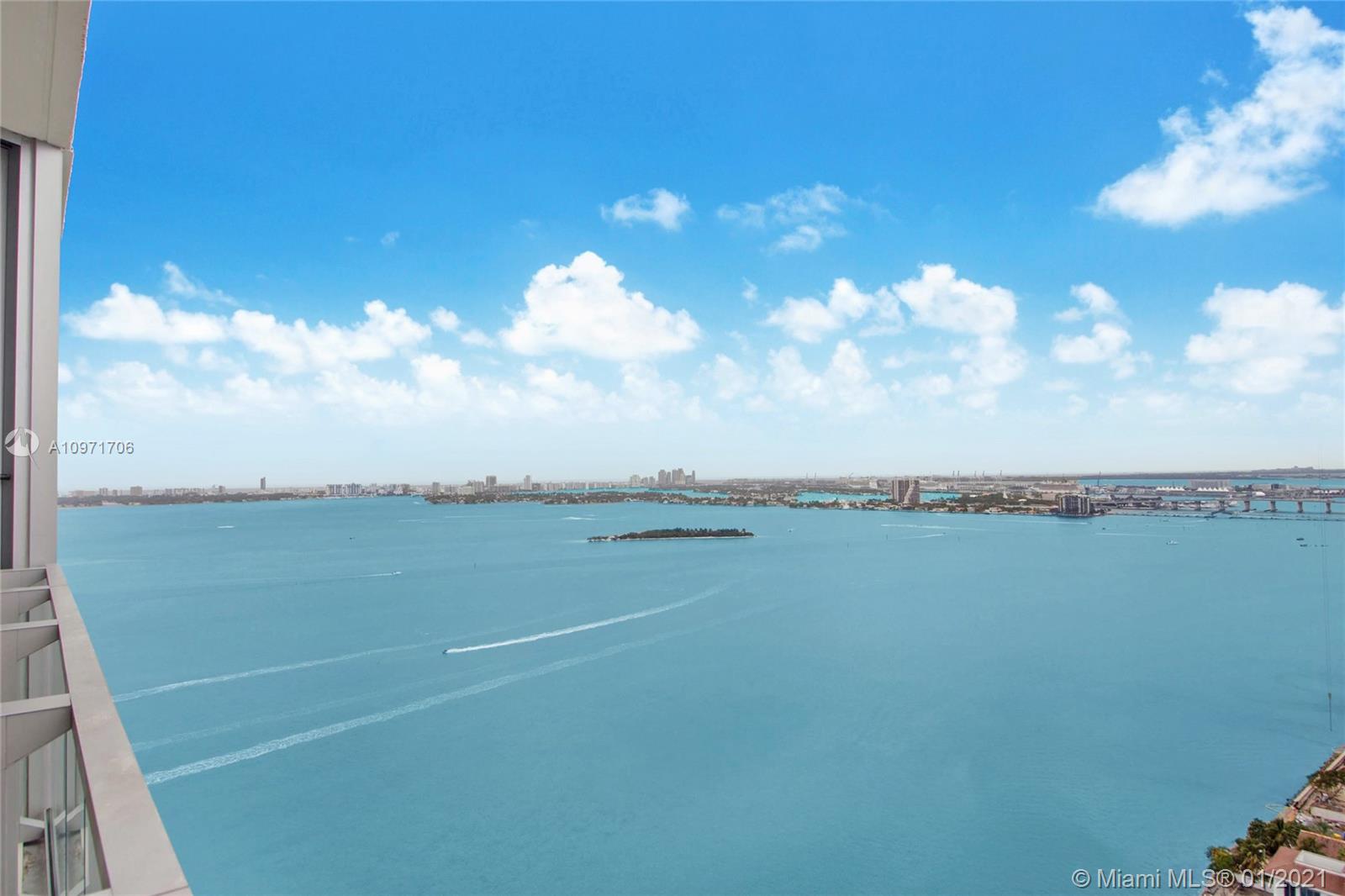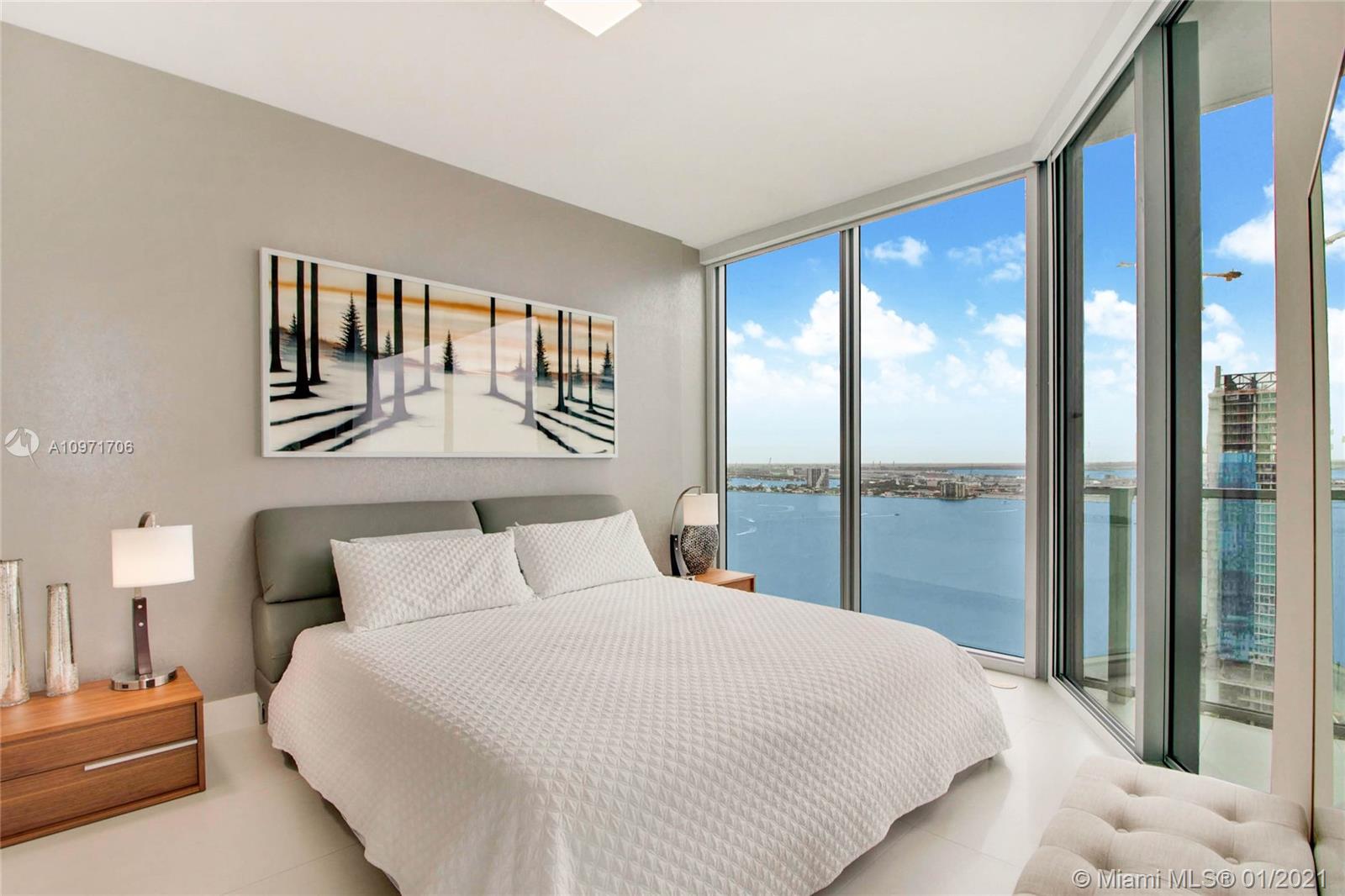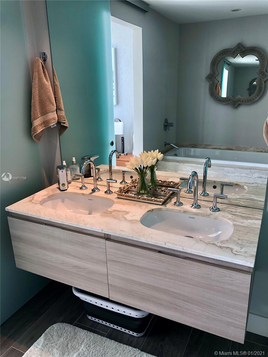 Beautiful upgraded 1 bed + den (enclosed with murphy bed) and 2 baths at luxury building. Professionally decorated by Brazilian designer Myrna Porcaro. Upgrades include kitchen island and wine fridge, wallpaper, vertical garden pillar, murphy bed, & electric shades. Tile floors throughout. Beautiful VIEW OF BISCAYNE BAY, Edgewater & Downtown Skyline, and sunset view. Private Elevator with private foyer entrance; Snaidero Kitchen with Miele appliances; 10 ft ceilings with floor to ceiling glass windows; spacious balcony. Amazing AMENITIES with a Beach Club, elevated sand/beach area, bayfront pool, sauna & steam room, 2 massage rooms, tennis & basketball courts, beach volleyball court, state of the art gym, 6th floor with 2nd pool, bbq area, 2 party rooms. Assigned parking (#233)