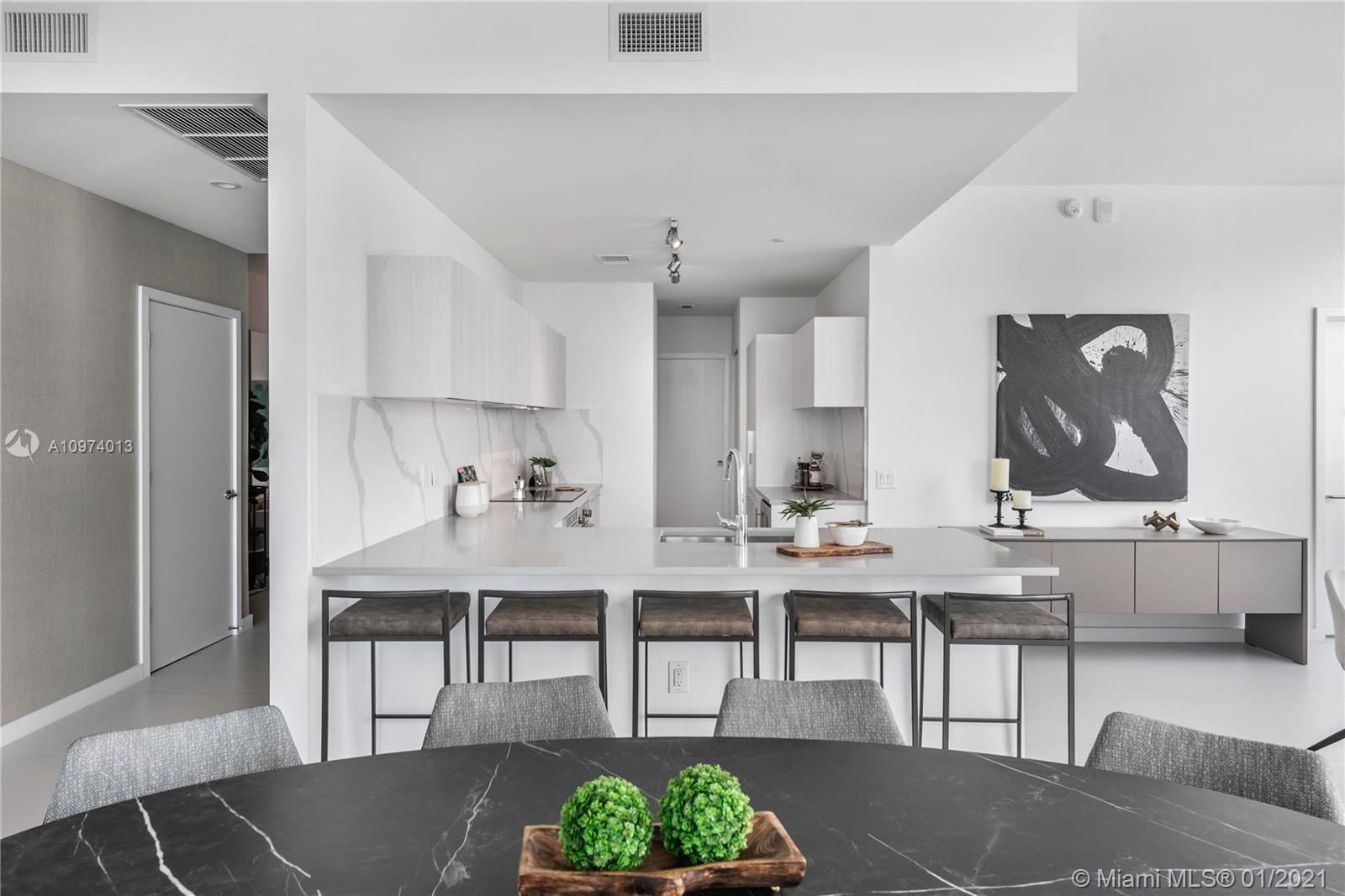 Enjoy spectacular views from each room in this never-before-lived-in luxury residence at Paraiso Bayviews. Penthouse 4301 is a stunning 4-bed/4.5-bath residence with 11’ ceilings, a beautifully split floor-plan with two ensuite master bedrooms, upgraded kitchen, 2 living areas perfect for entertaining and a wraparound balcony for enjoying the breathtaking sunrise/sunset views over the city and bay. Includes 2 deeded parking spots and boundless amenities such as a rooftop pool and hot tub with panoramic views and outdoor kitchen, gym, spa, tennis, movie room, kid’s playroom, gourmet restaurant and beach club provide opulence and enjoyment like none other. Within walking distance from the Design District, Midtown and Wynwood, PH4301 makes it easy to enjoy the Miami lifestyle at its finest.