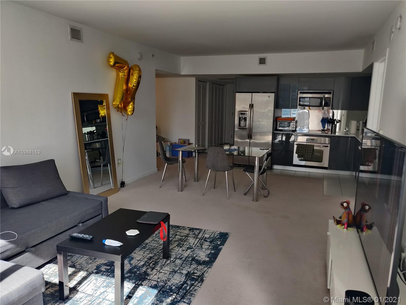 Beutiful SPLIT unit. 2 bed, 2 bath (one bathroom with tub - the other with shower)+ DEN. 1086 sq ft living area + 70 sq ft balcony. TOTAL 1156 sq ft. Nice size living room with exit to good size balcony, open kitchen. Carpet floors in living room and in the bedrooms. Very bright unit. Skydeck swiming pool, party room and gym. Valet parking only. TENANT OCCUPIED until JUNE 2021