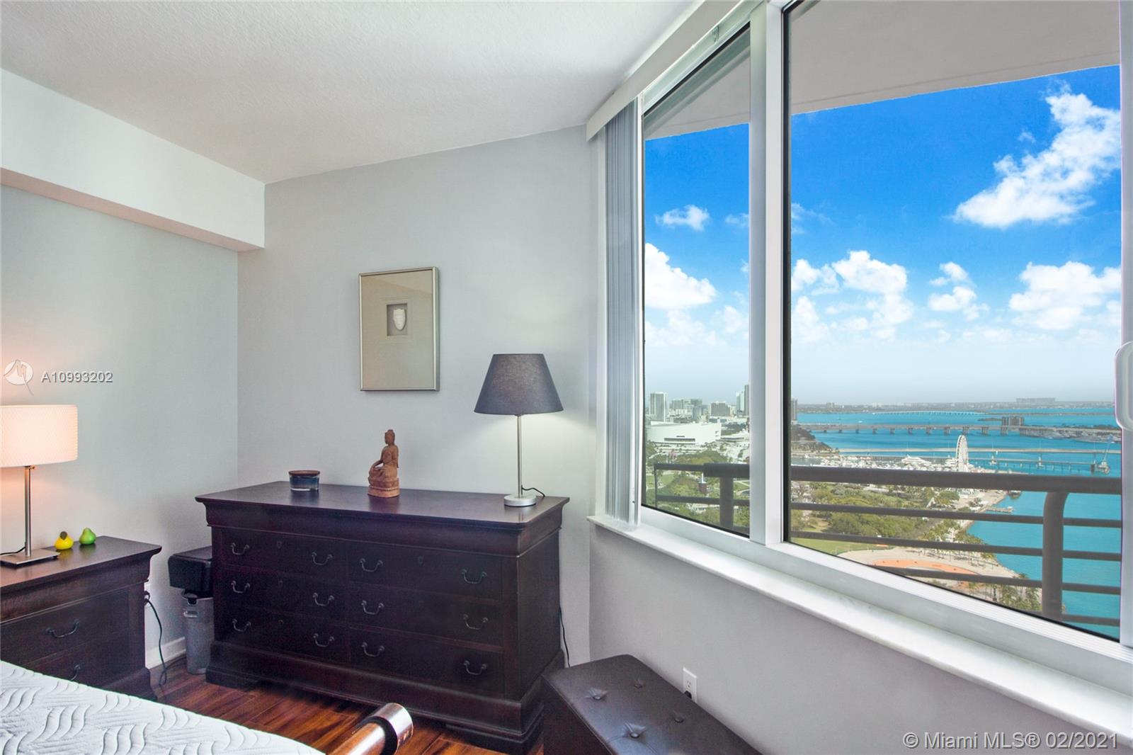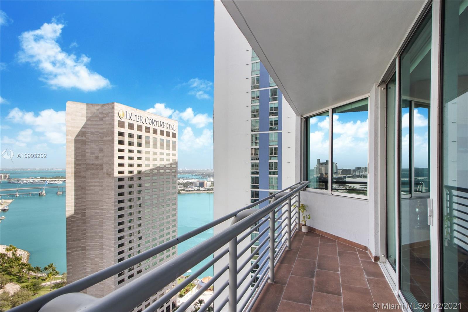 Best location in Downtown/Brickell area. Beautiful fully renovated 2 beds/2 bath unit on the 31st floor with spectacular views of Biscayne Bay and Downtown Miami. Open floor plan – best 2 bdrm layout in the building. Beautiful flooring throughout. Bedrooms are situated on opposite sides of unit, each with its own bathroom for full privacy. Bathrooms have been completely renovated. Kitchen updated with new appliances. Contemporary cabinetry added for sleek, modern look and tons of storage space. Full-service building with gated entrance and secured access. Amenities include 24 hour security, valet, parking garage, 2 swimming pools, 2 fitness centers, Jacuzzi, Sauna, waterfront Party Rooms, and Convenience Store.