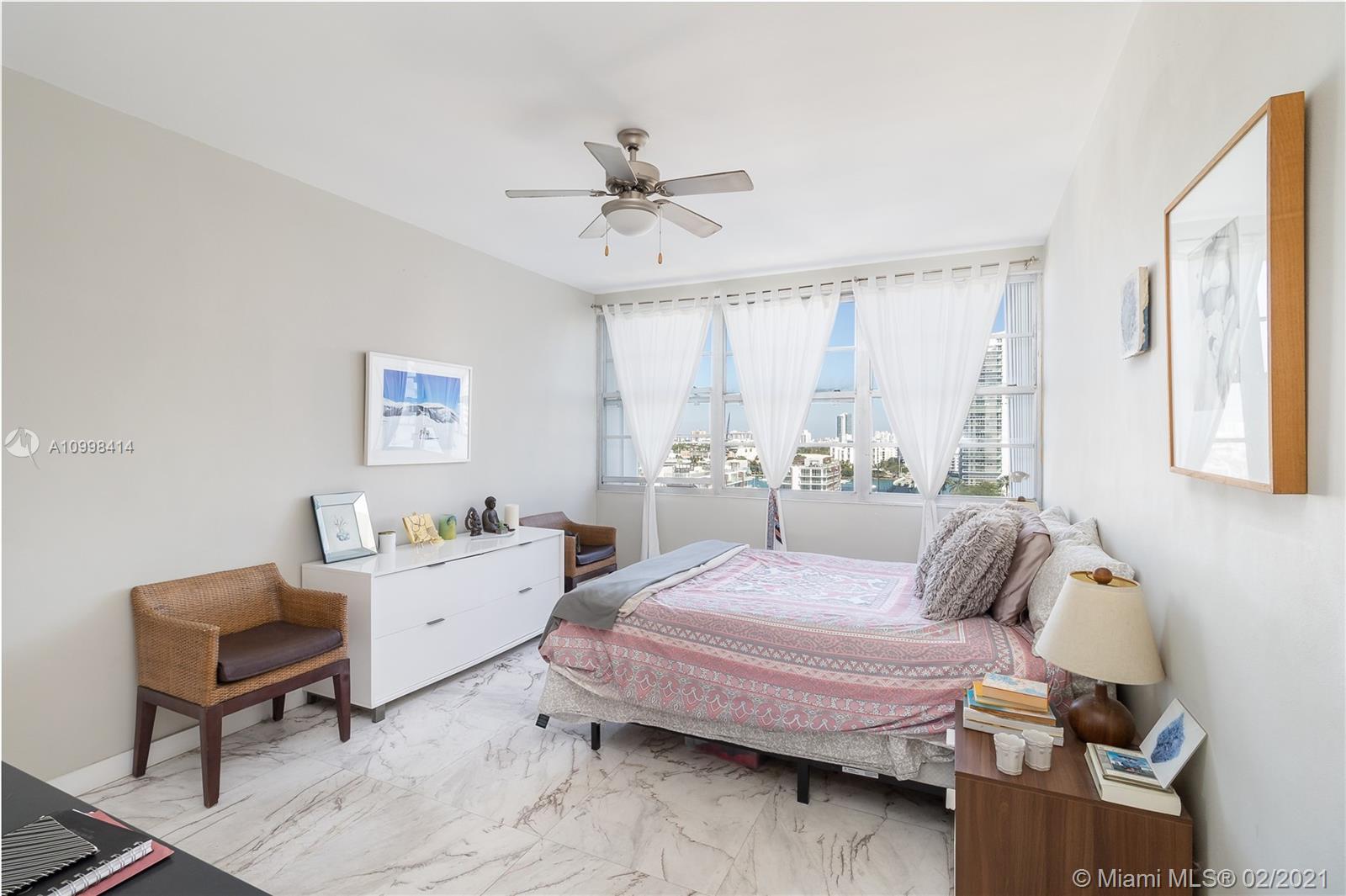 Bright and fresh 1 bedroom apartment in cool and newly condo converted Morris Lapidus building in Belle Isle. Renovated with sleek carrara marble floors throughout with semi-open kitchen. Spacious bathroom with opening to admire the views with natural light. Enjoy spectacular sunrises and soothing park and bay views. Condo has an spectacular pool on the bay with an enormous deck to appreciate unobstructed sunsets all year long. Fantastic location in the Venetian Causeway right across the Standard Hotel, walking distance to Lincoln Road and trendy Sunset Harbor area. Easy to show!