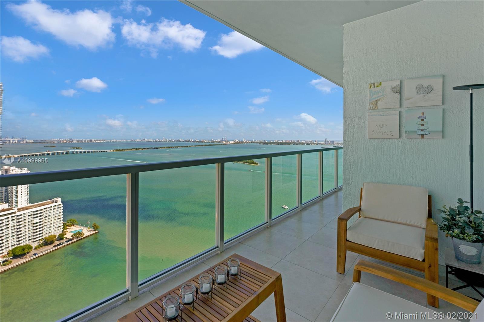 Experience a million-dollar view in this remodeled 2 bedroom + Den, with 2.5 bathrooms and 1,460 square feet of living. Spectacular sunset and sunrise views in this expansive and private wrap-around balcony with a 190-degree view. Direct unobstructed water views with an 8.5-acre public park fronting Biscayne Bay. High ceilings and tons of customized storage space and expanded closets. Upgraded marble porcelain tiles throughout with spacious bathrooms. Luxurious, quiet and private oasis in the middle of bustling Edgewater. Sale includes 1 covered parking space in a low floor #455 and use of valet service. The building is amenity rich and well managed. Central location, ideal building for any lifestyle.