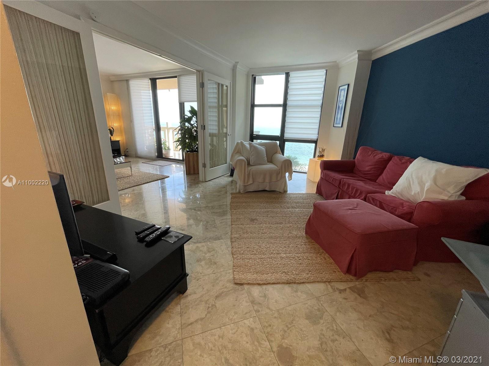 Direct Ocean and beach view from every room, fantastic opportunity to own a one-of-a-kind spectacular unit with Breathtaking views of the Ocean walking distance to the private beach; awesome unit with spanish porcelain. high impact windows, spacious bedrooms, ample closets, 1 assigned parking space on a upper level. Enjoy all Towers amenities: Private beach with Direct Beach Access, 2 pools, 2 tennis courts, two gyms, recreation room w/ pool table, 2 party rooms, meditation garden, private beach, BBQ area and more! Own a piece of paradise! A Must see!