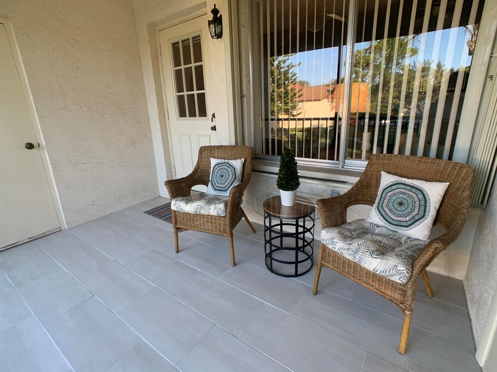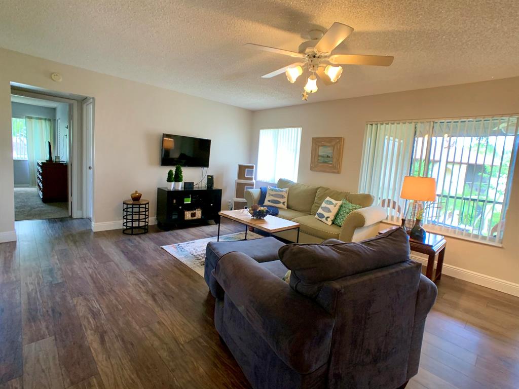 Lovely updated FURNISHED condo in a well-maintained, gated community. LOW MONTHLY FEES! Renovated kitchen with SS appliances and 42'' cabinets, full washer/dryer in adjoining laundry room complete with pantry. Beautiful luxury laminate flooring in living in dining area; each bedroom has spacious closets. New tiled flooring on balcony, which also has storage closet and new screening. Full set of accordion shutters! New roof on the building in 2019. This building is situated at the rear of the community, surrounded by lots of green space. Pine Ridge is a quiet, gated community centrally located to many points of interest, shopping, dining and major highways. This is a great starter home, a great home for those downsizing or a great investment (leases okay with no waiting time). SEE IT TODAY