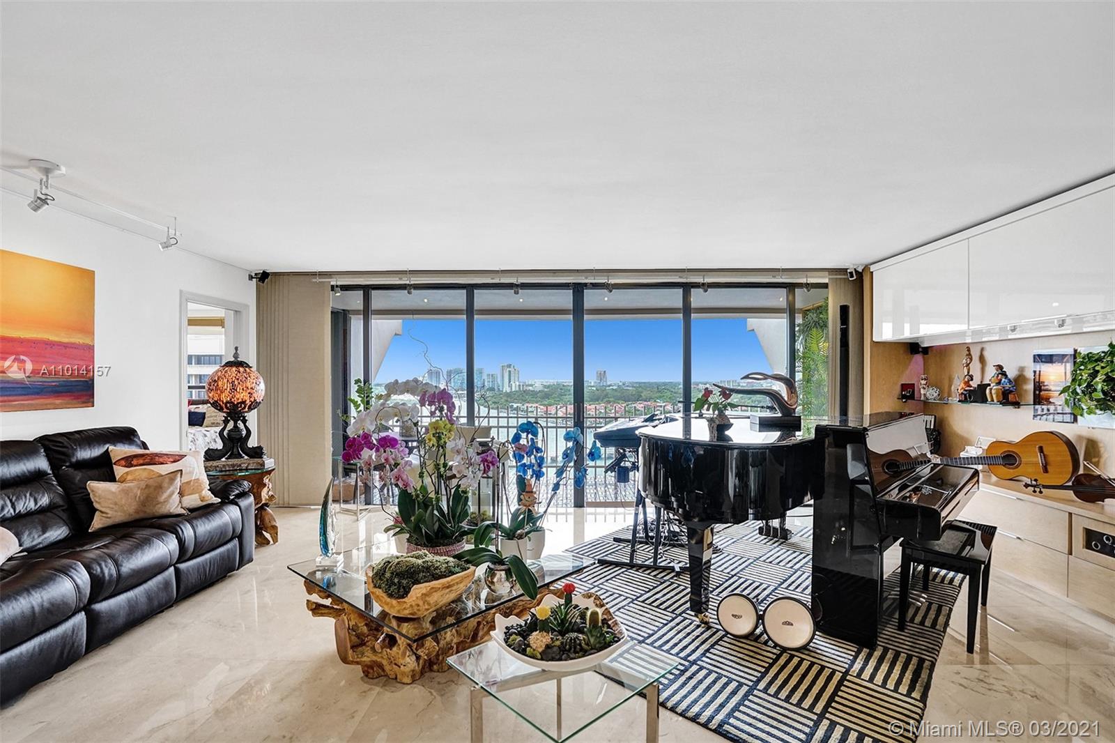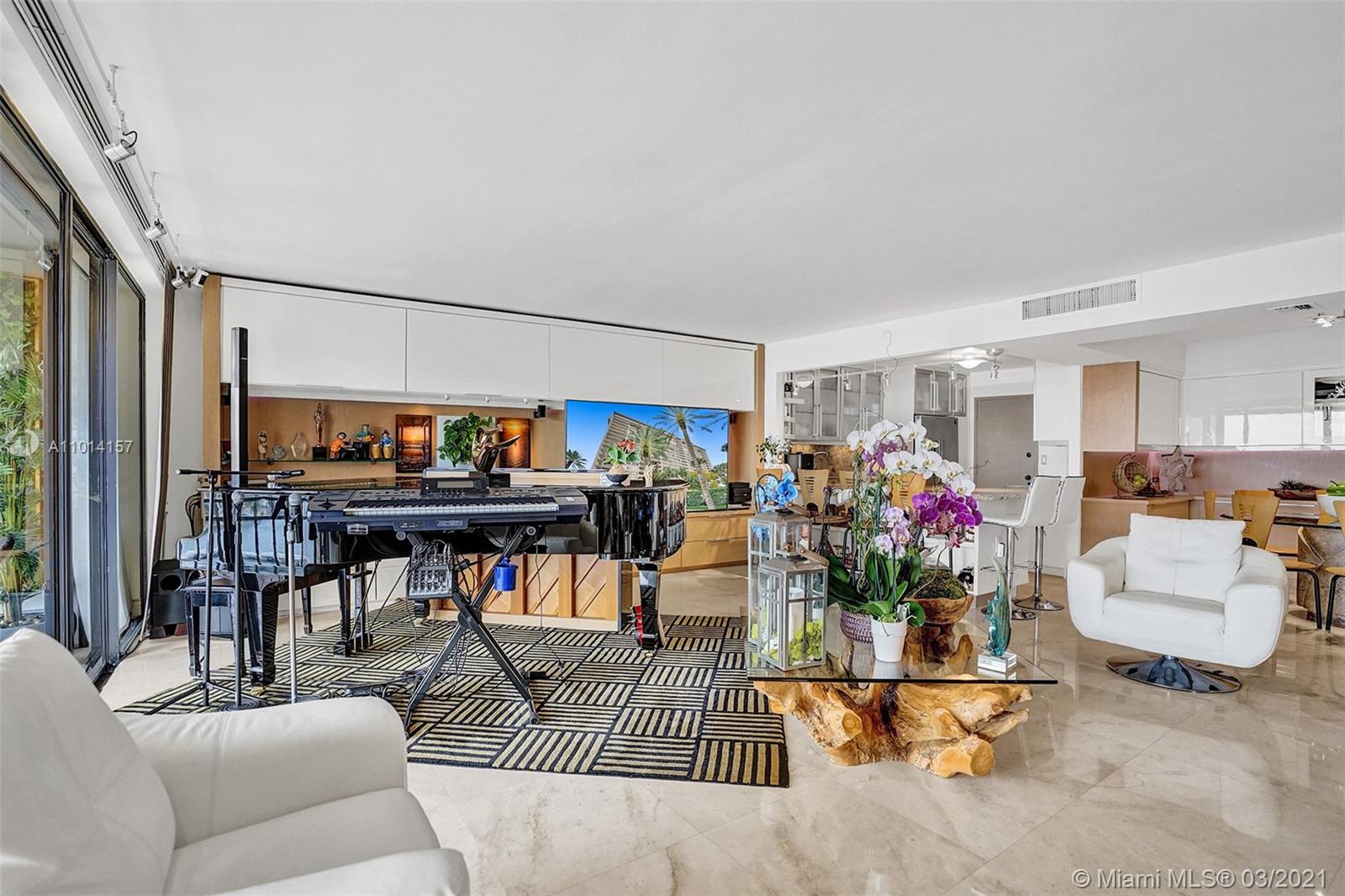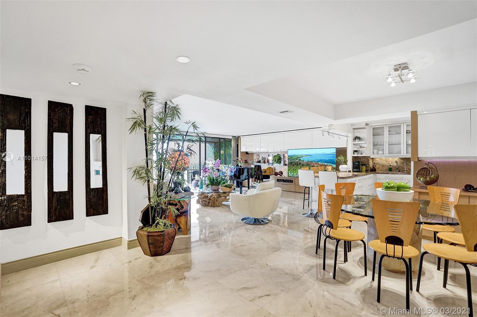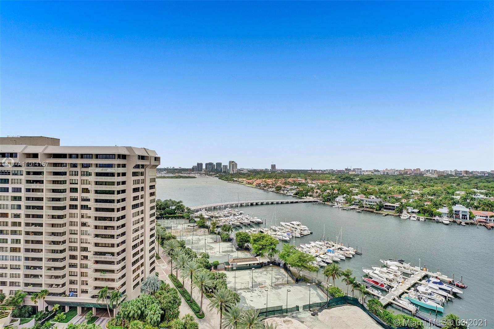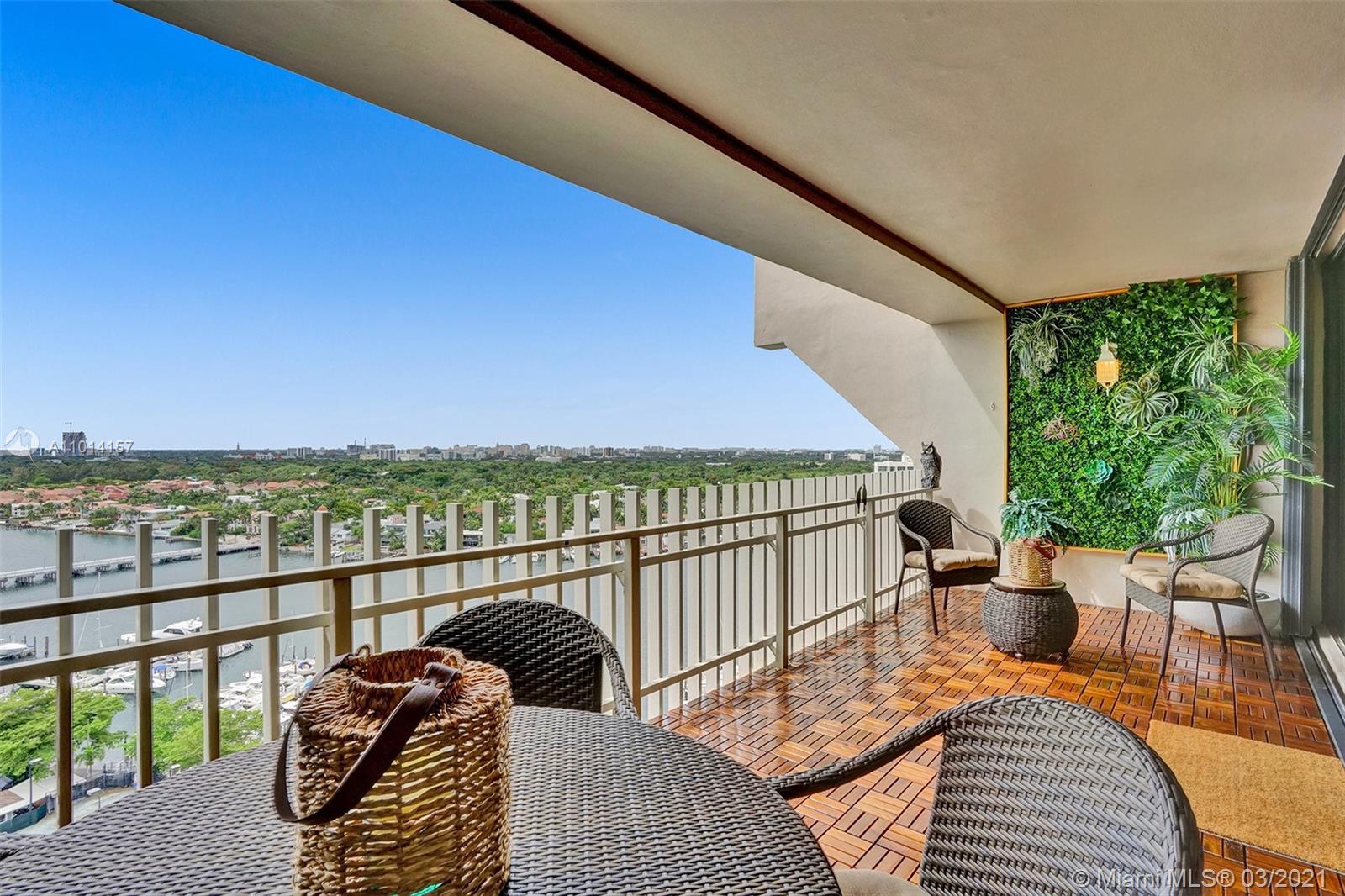 This spacious 2 bedroom, 2 bathroom offers incredible high floor views of the Bay, Grove Isle Marina, Dinner Key Marina, and all of Downtown Coconut Grove. Features include recently polished marble floors in the main living areas, a built-in bar with storage and glassware racks, recessed lighting, dining room with built-in credenza with top and bottom storage, open kitchen with granite countertops, white sleek cabinets and stainless-steel appliances. The living room has built-ins with plenty of storage space. The primary bedroom has a walk-in closet, built-in cabinets and workspace, and a beautifully updated bathroom. Watch the sailboats as you cook or enjoy sunsets from the beautifully decorated terrace. No matter what room you are in, the views will amaze you. Live at Grove Isle!