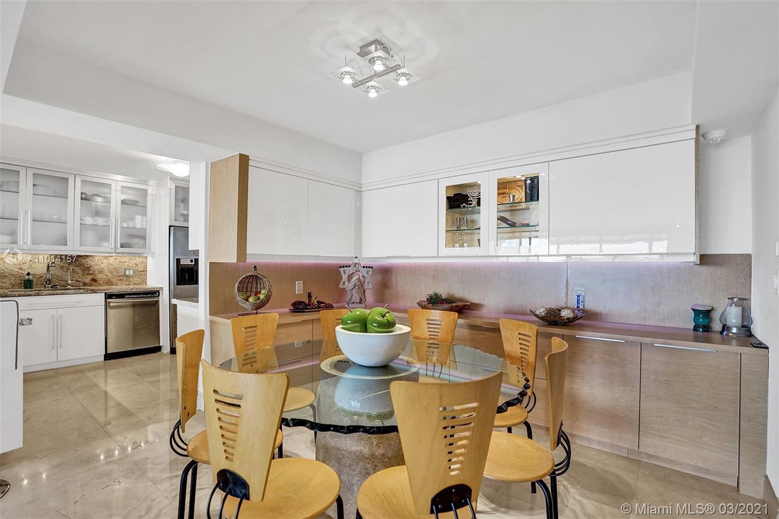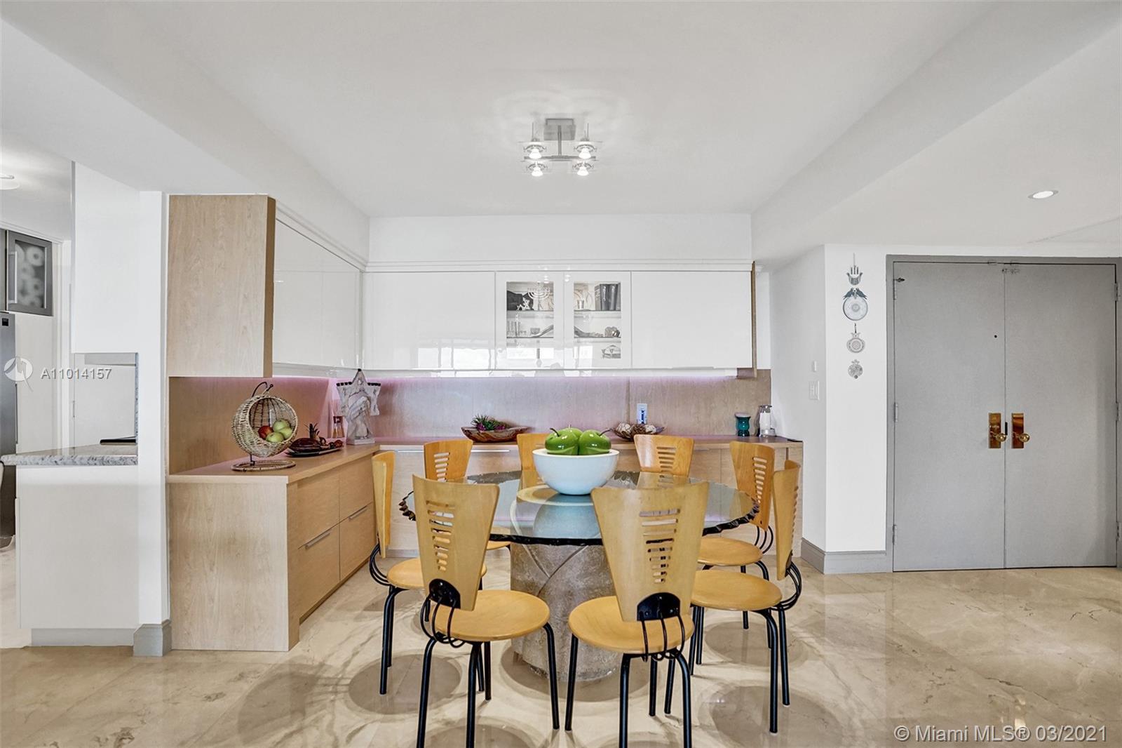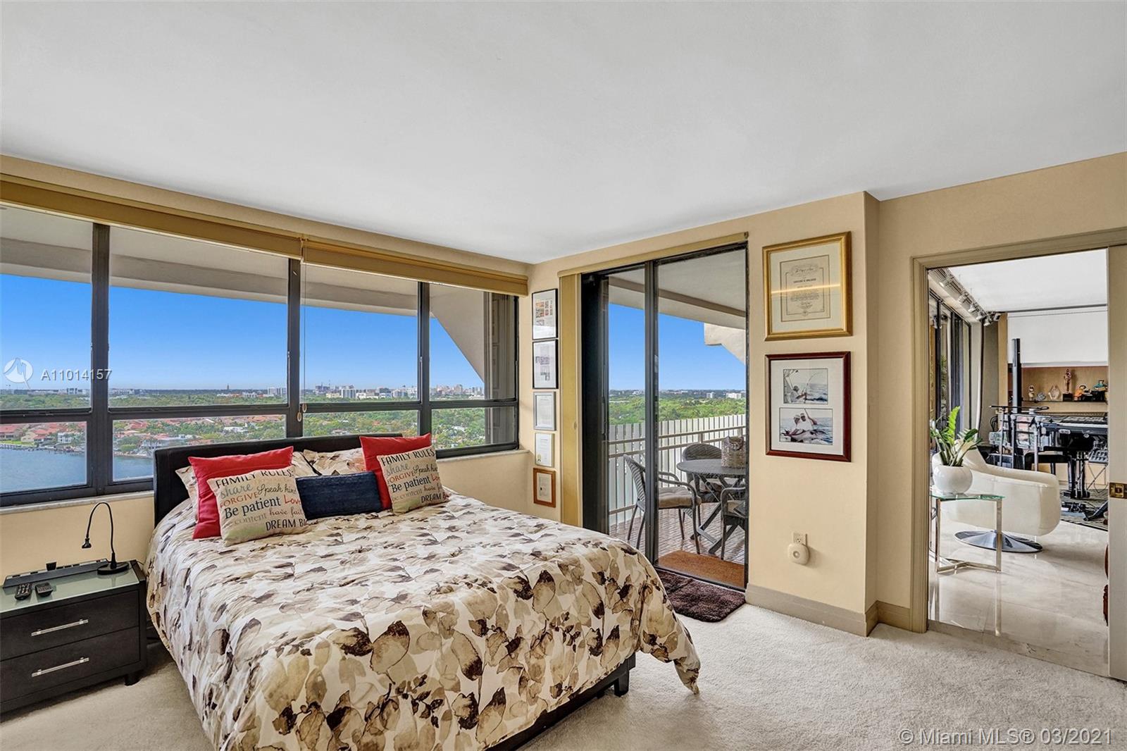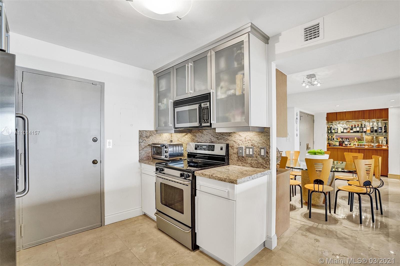 This spacious 2 bedroom, 2 bathroom offers incredible high floor views of the Bay, Grove Isle Marina, Dinner Key Marina, and all of Downtown Coconut Grove. Features include recently polished marble floors in the main living areas, a built-in bar with storage and glassware racks, recessed lighting, dining room with built-in credenza with top and bottom storage, open kitchen with granite countertops, white sleek cabinets and stainless-steel appliances. The living room has built-ins with plenty of storage space. The primary bedroom has a walk-in closet, built-in cabinets and workspace, and a beautifully updated bathroom. Watch the sailboats as you cook or enjoy sunsets from the beautifully decorated terrace. No matter what room you are in, the views will amaze you. Live at Grove Isle!