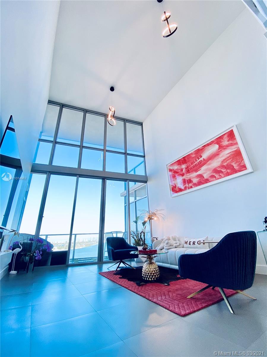 Stunning views of the Bay and Ocean from this spacious 03 line, impeccably cared for loft style 1/2 plus den/bedroom (23’ high ceiling) at the exclusive Marquis, a full service ultra luxury condo in the most dynamic area of Downtown. Kitchen boast Viking appliances & quartz countertops. Upgrades to this nearly 1,700sqft unit include brand new custom Italian kitchen upper cabinets, new custom master closet, sleek glass railing for loft and stairs, custom glass island countertop extension, modern LED lighting throughout, less than a year old high efficiency A/C unit, Custom wallpaper for a chic Miami vibe. Unit has so much more you must see. Option to purchase fully or partially furnished with just a year old modern-designer furniture. Tremendous value pricing for this home & easy to tour.