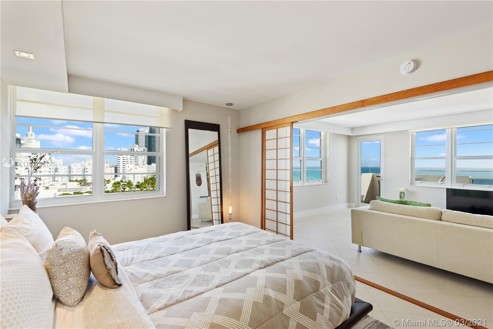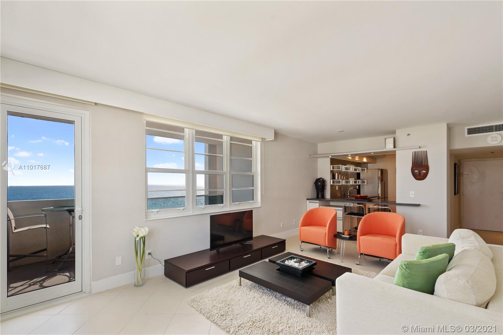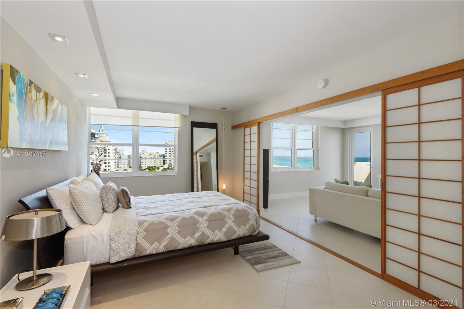 Perfect Pied-A-Terre with direct ocean views in the best location in South Beach. This spacious 2 bed/2 bath unit has been fully renovated & has spectacular views of the Atlantic Ocean. The building is located directly ocean-front on Lincoln Rd across from the Ritz Carlton & just steps from all that Miami Beach has to offer. This apartment has been meticulously updated & features a sleek contemporary kitchen with natural stone countertops & stainless steel backsplash, spa-like modern bathrooms, and furnished with high-end Italian furniture. Can be rented 12 times per year/30 day minimum. The unit features a 2nd entrance and the ability to close off the 2nd bedroom/bathroom as a studio with its own kitchenette. You are able to rent it out separately or together as one unit