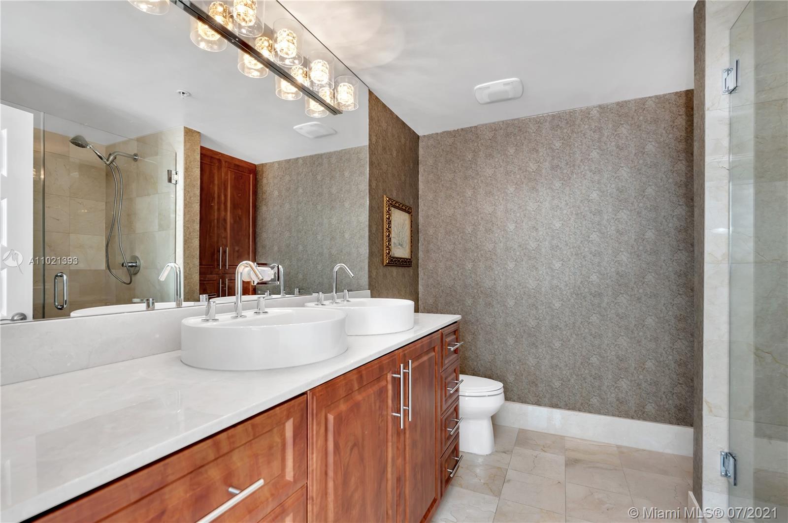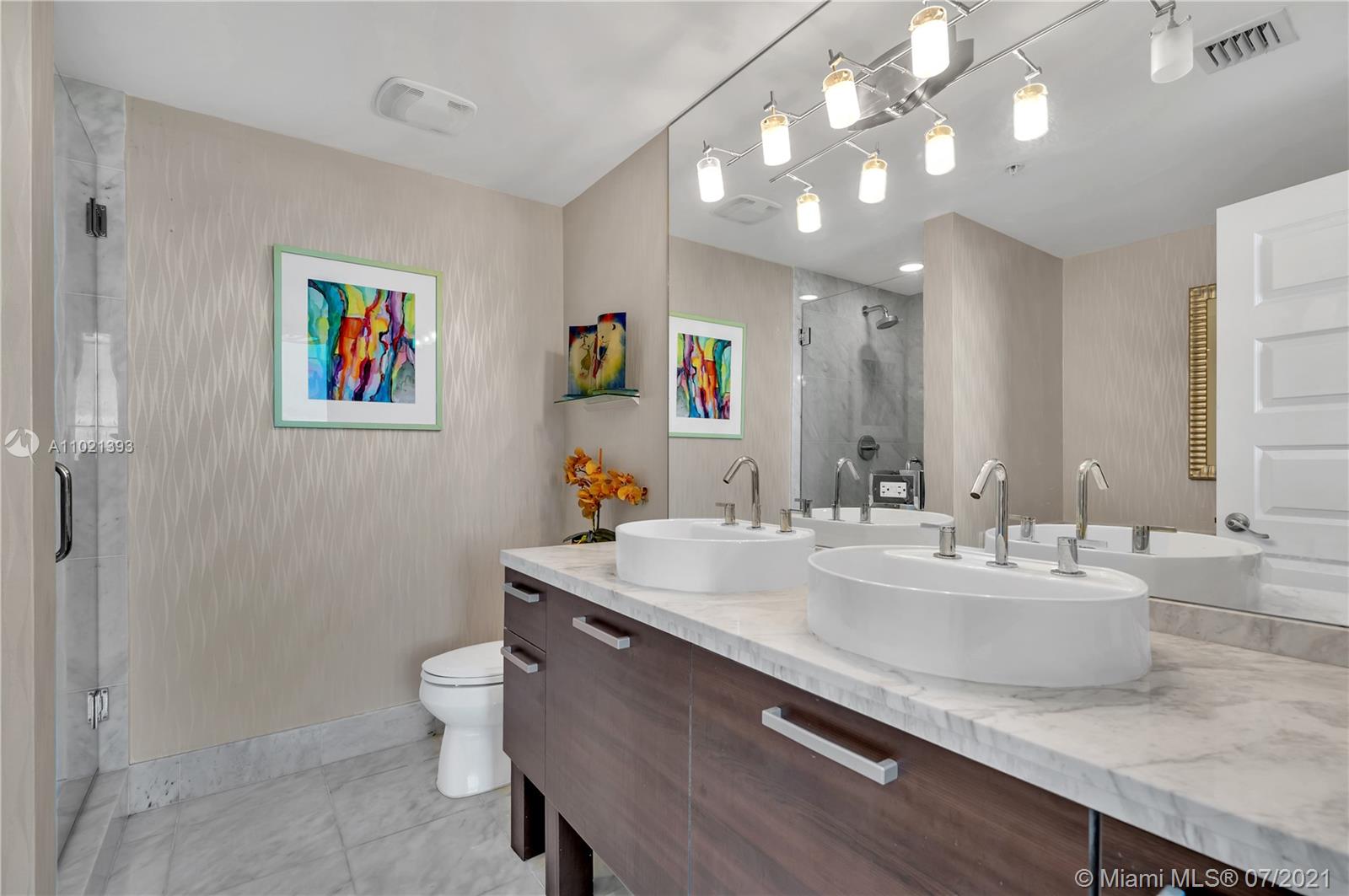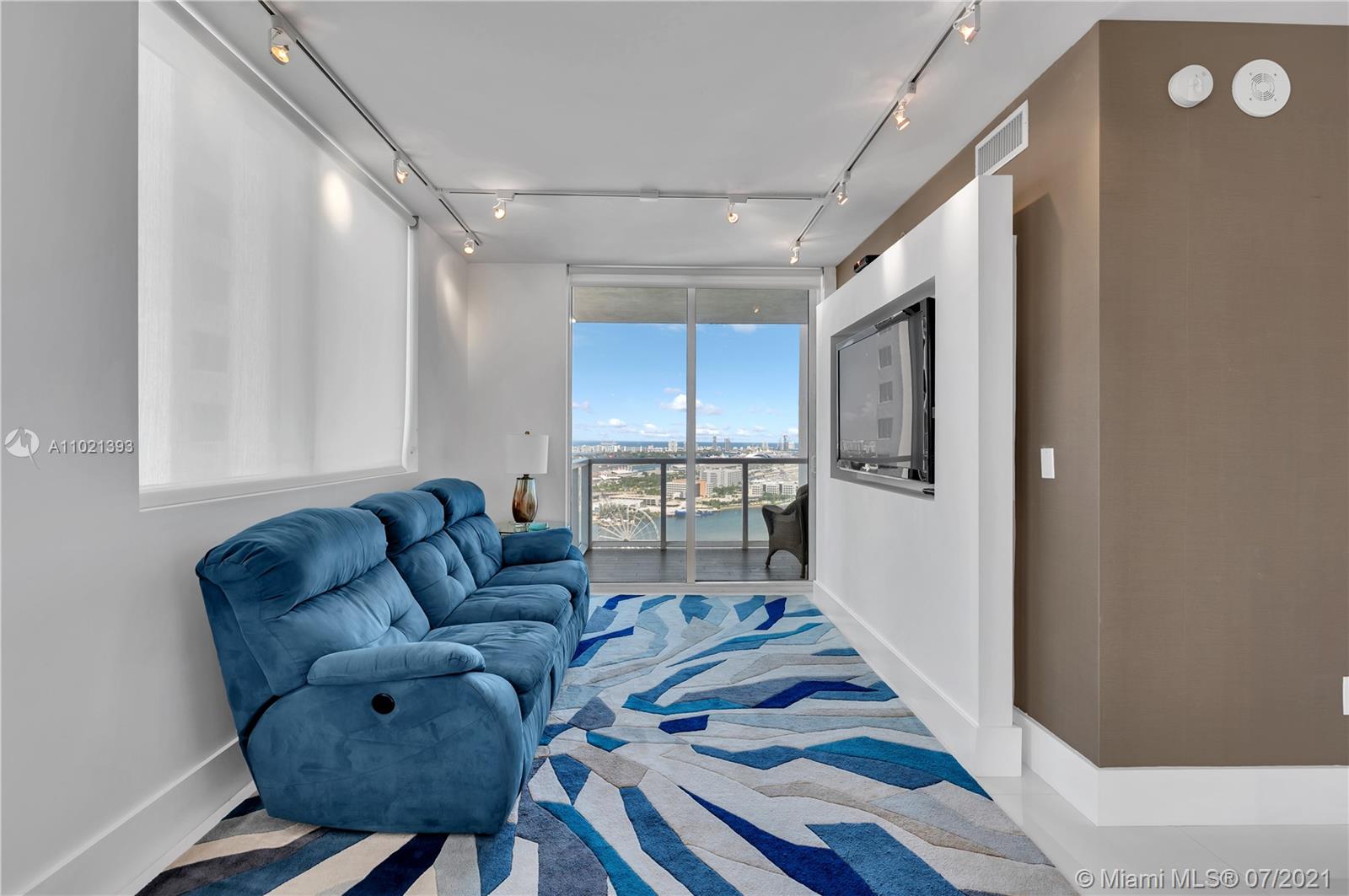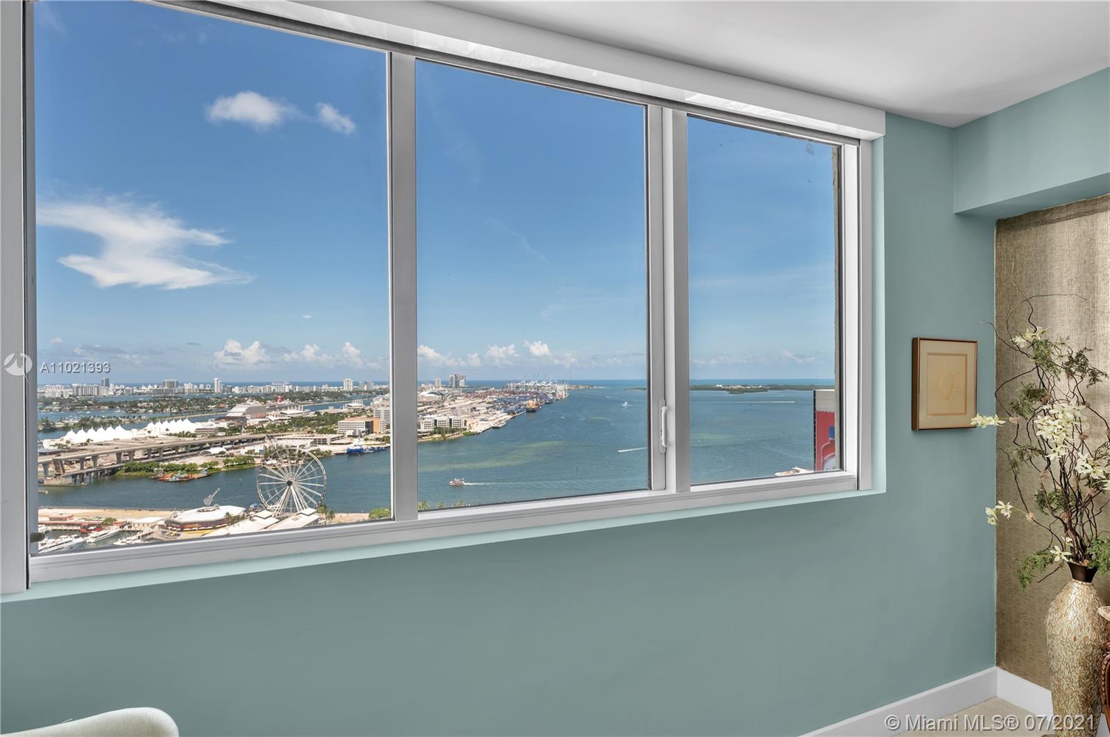 Unique, two combined units offer 180-degree panoramic water and city views! Sitting in the large living room area you can look to the East and view Biscayne Bay and the Atlantic Ocean. Turning to the West you can view Marlins Park and MIA. This custom floor plan is perfect for large families, home businesses, and entertaining. Featured is a large walk-in bar with a sink, microwave, and wine cooler with lots of room for glassware and bottles. Two expansive master suites, one with an oversized walk-in closet. All together there are 4 bedrooms and 4 baths. Vizcayne is directly across from the the Shops at Bayside and within walking distance to the American Airlines Arena and Adrienne Arscht Center for the performing arts! Visit this stunning unit today!