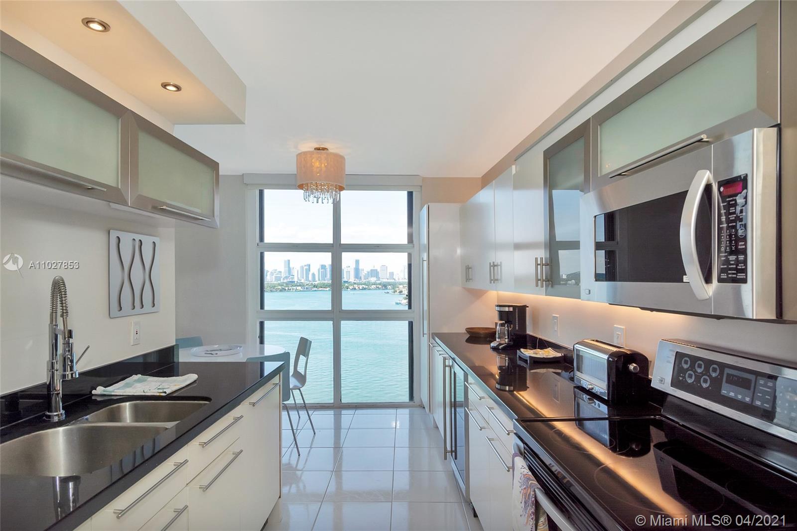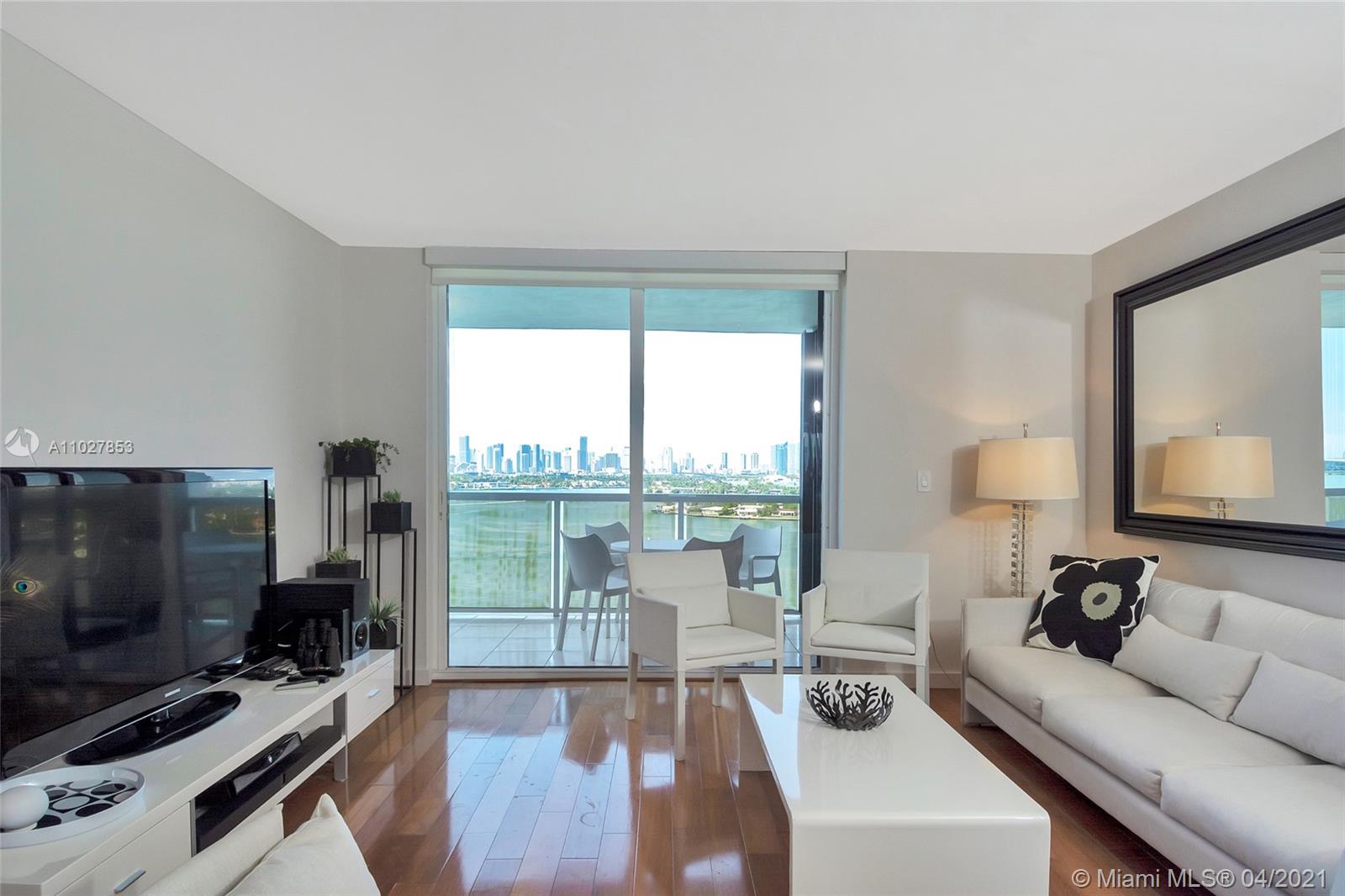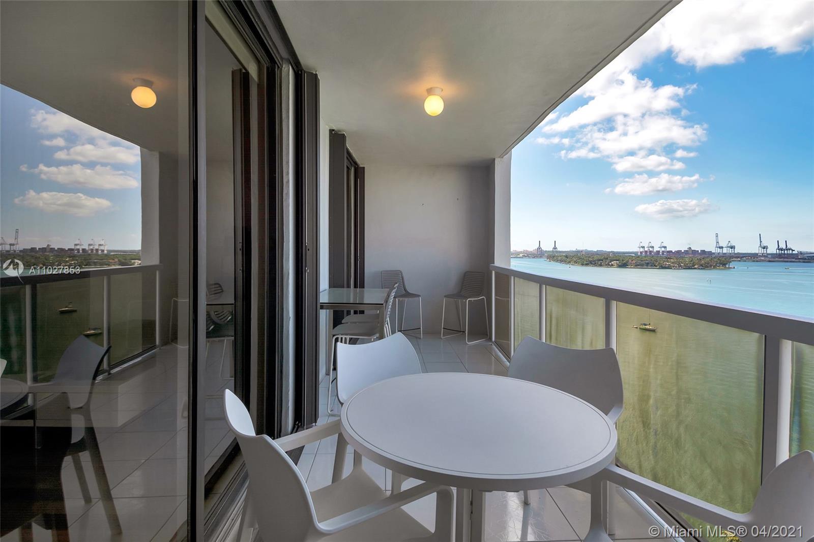 This view is absolute perfection! Finally, a fully furnished, move-in ready 2 bedroom at 9 Island, available immediately with stunning direct bay views from every window! This 2 bed / 2 bath 1,440 SF split bedroom unit has many upgrades including updated kitchen with stainless appliances, full size washer/dryer, wood floors and hurricane shutters. Master bath has dual sinks, glass shower and gorgeous marble floors. Access the oversized balcony from the living room, kitchen and guest bedroom. Unit comes with one garage space and extra storage unit. All artwork excluded except bicycle photographs and Andy Warhol print of Jackie Kennedy.