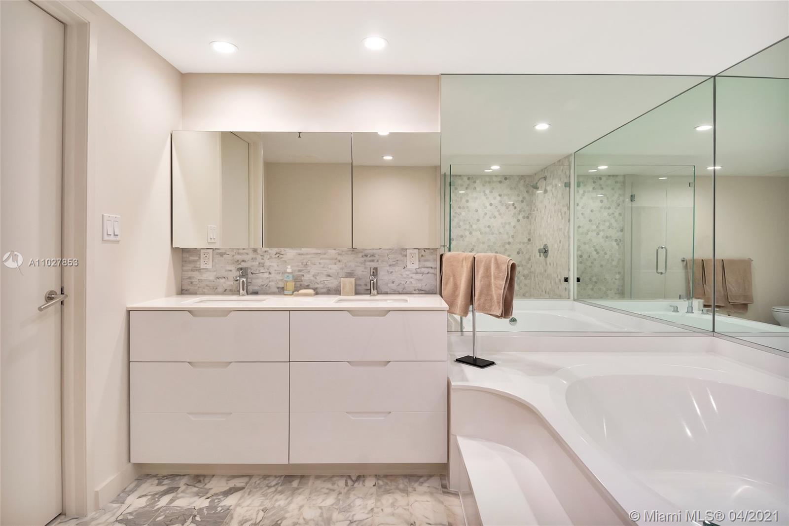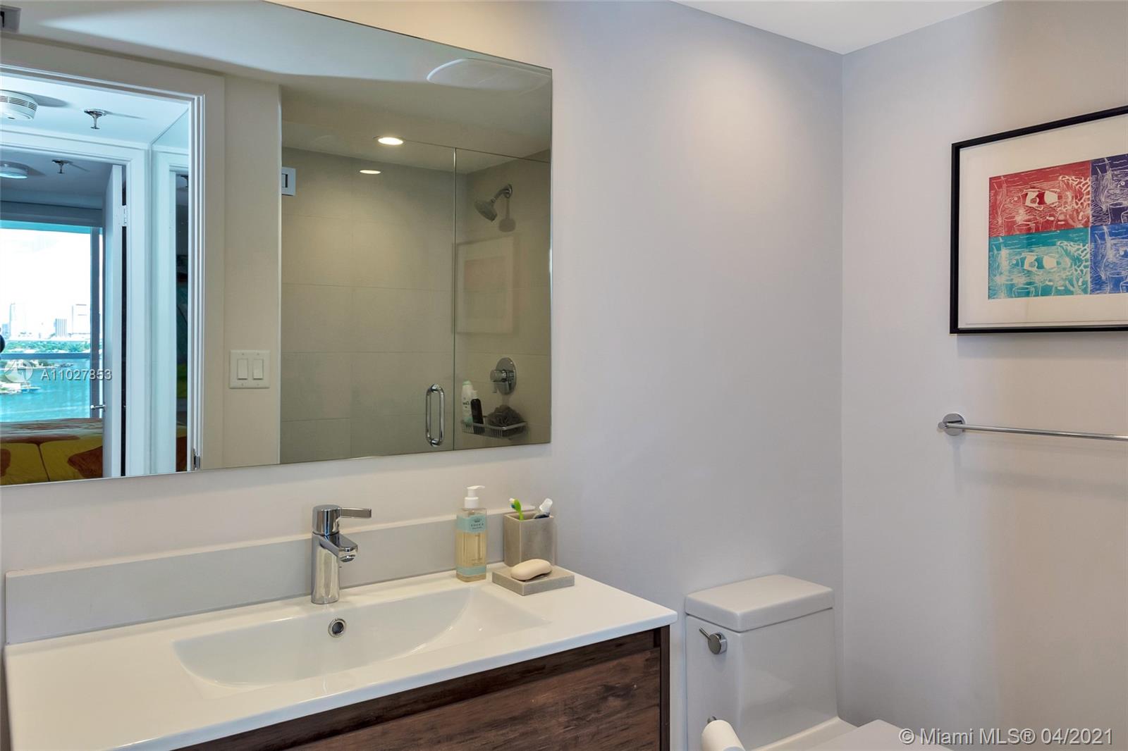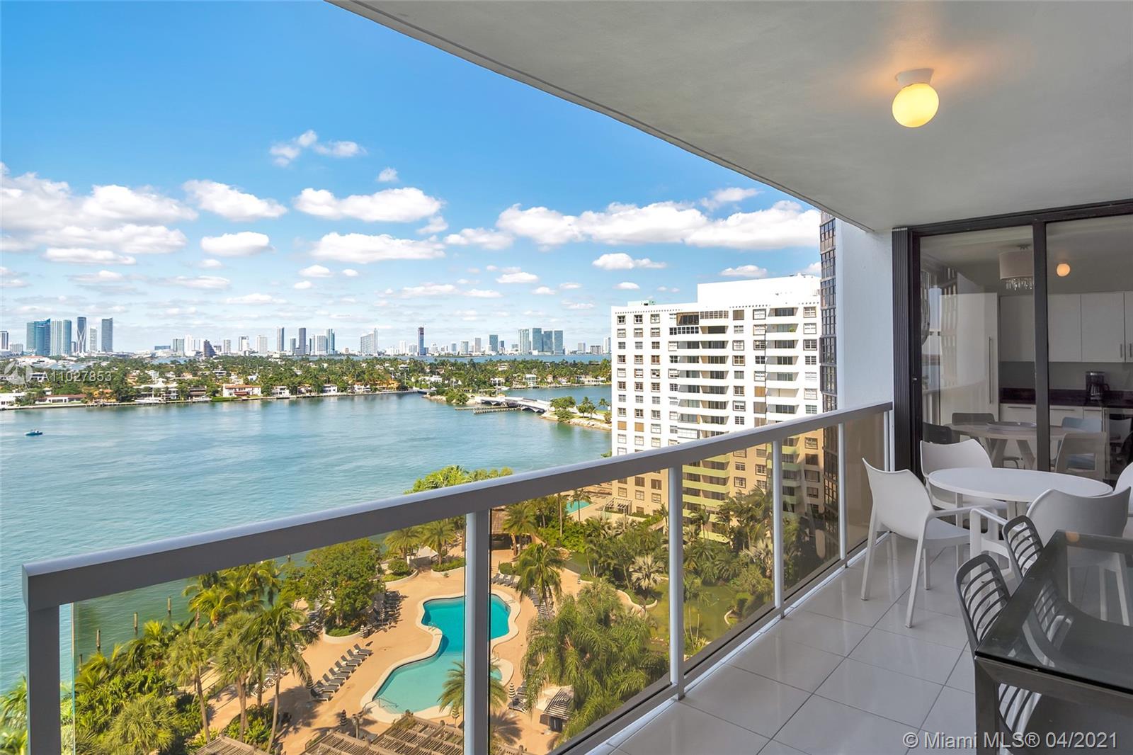 This view is absolute perfection! Finally, a fully furnished, move-in ready 2 bedroom at 9 Island, available immediately with stunning direct bay views from every window! This 2 bed / 2 bath 1,440 SF split bedroom unit has many upgrades including updated kitchen with stainless appliances, full size washer/dryer, wood floors and hurricane shutters. Master bath has dual sinks, glass shower and gorgeous marble floors. Access the oversized balcony from the living room, kitchen and guest bedroom. Unit comes with one garage space and extra storage unit. All artwork excluded except bicycle photographs and Andy Warhol print of Jackie Kennedy.