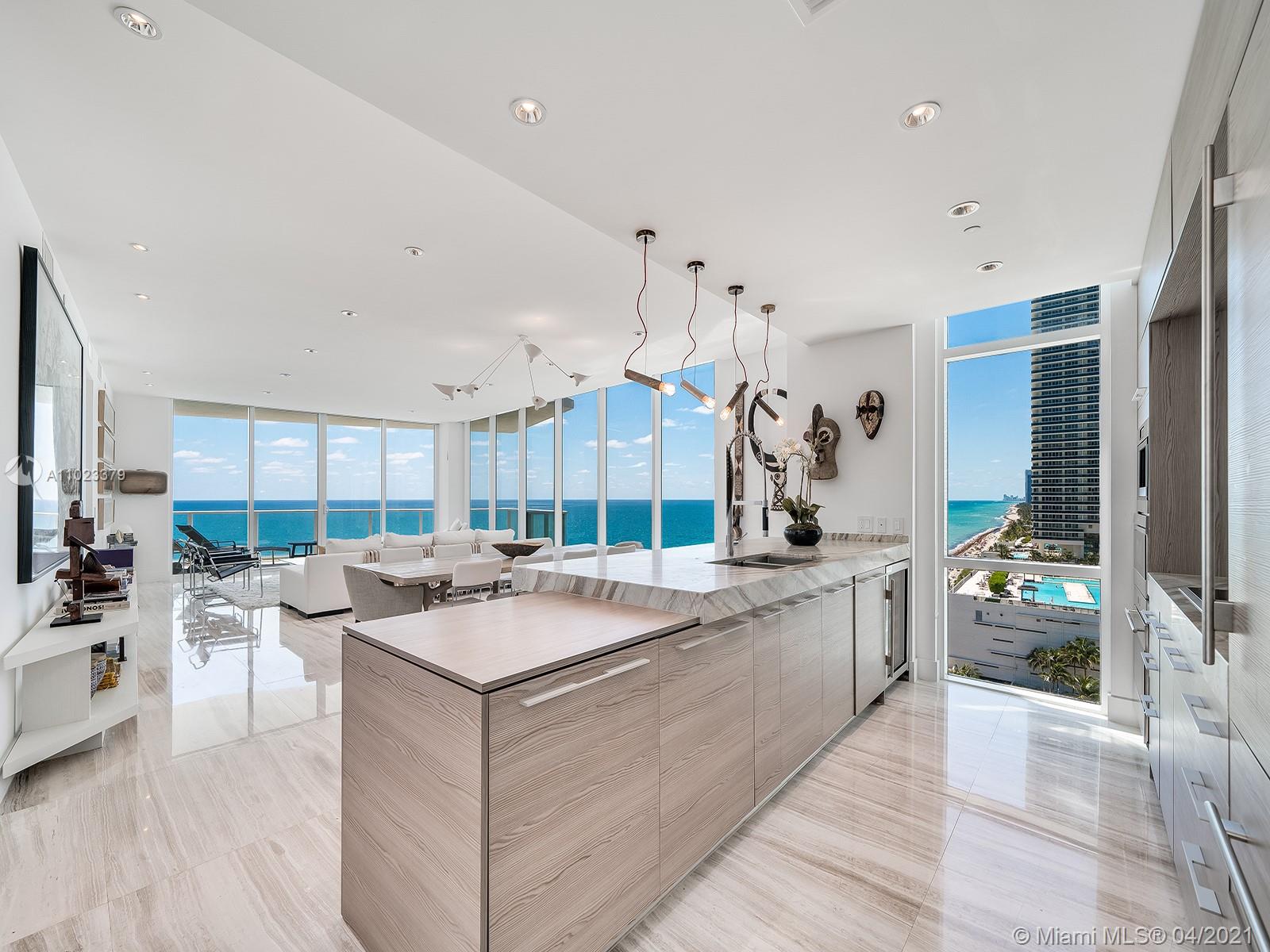 This oceanfront residence at Apogee Beach Hollywood was custom-designed by the developer with significant upgrades and alterations, including a relocated Ocean view master bath, and enlarged Great Room wrapped in floor-to-ceiling windows. With 280-degree ocean-to-city vistas and soaring 10-foot ceilings, this is a home that feels like it’s at the center of it all, but really a private oasis. The chef’s kitchen offers Subzero and Wolf appliances, including a wine fridge, and Green Paradise Marble countertops, while nearby, the family room has been acoustically upgraded for movies. Downstairs, two ground floor parking spaces, a storage unit, and a beachfront cabana come with the sale. Amenities include a 240-foot oceanfront, pool, fitness center, club room, theater, and kid’s lounge