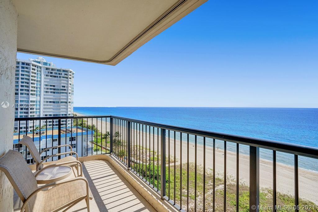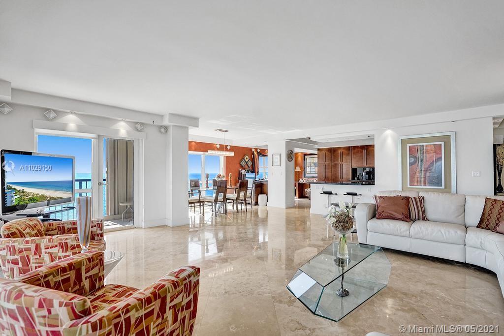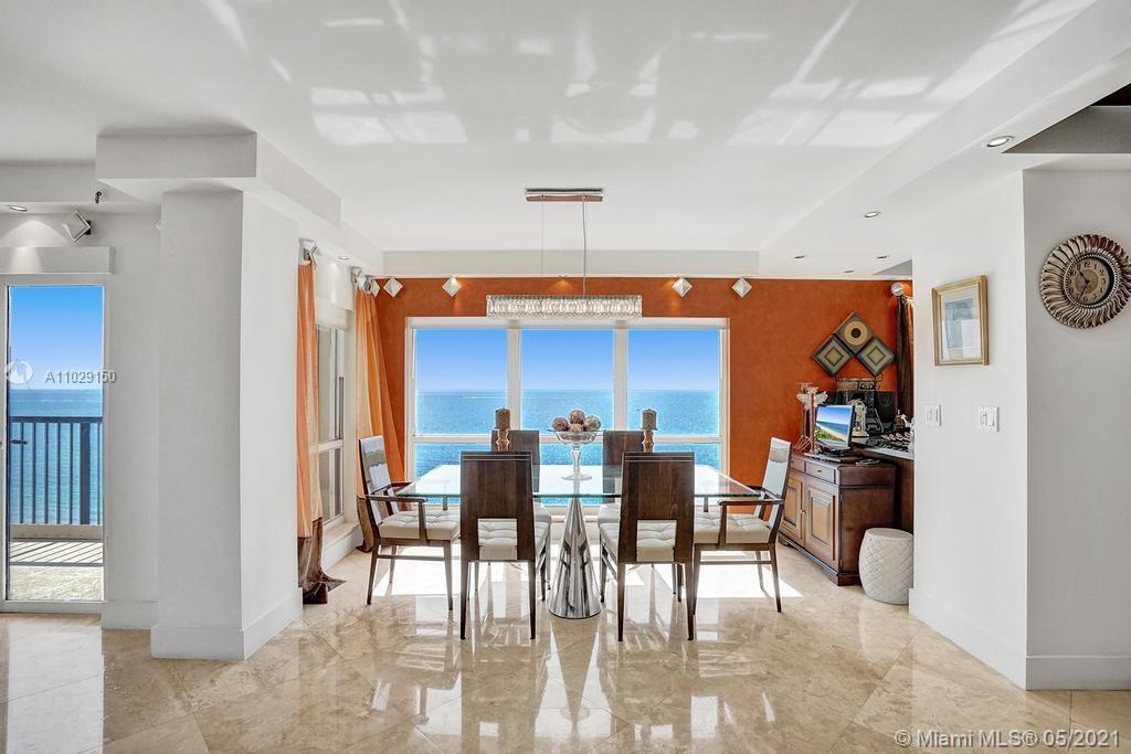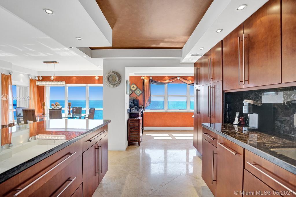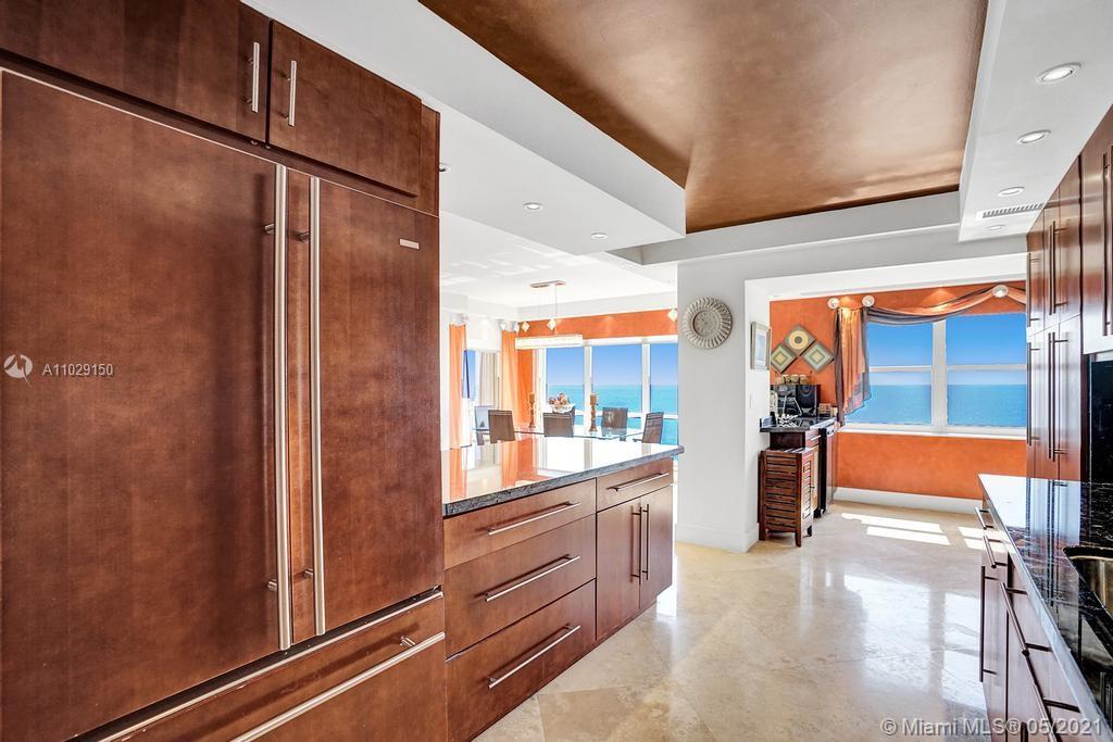 Beautiful NE corner with amazing Direct Oceanfront view.... including the Intracoastal, Skyline and stunning Sunsets. Every room has a view of the ocean! Large wrap balcony from living room. Marble floors throughout, open kitchen offering wood cabinetry, granite countertops, Jenn Aire appliances, wine cooler and breakfast nook. Foyer entry and separate laundry room. Spacious master bedroom with private balcony. Large master bath offering shower, jacuzzi tub, double sinks with onyx countertop. Second and third bedrooms are spacious. Second bath offers shower and additional cabinets for storage. Half bath with onyx countertop. Amenities include oceanfront heated pool, grill area, gym, saunas, pickle ball & bocce courts, tennis, billiards room, vehicle car wash. 24/7 security. Small pet okay.
