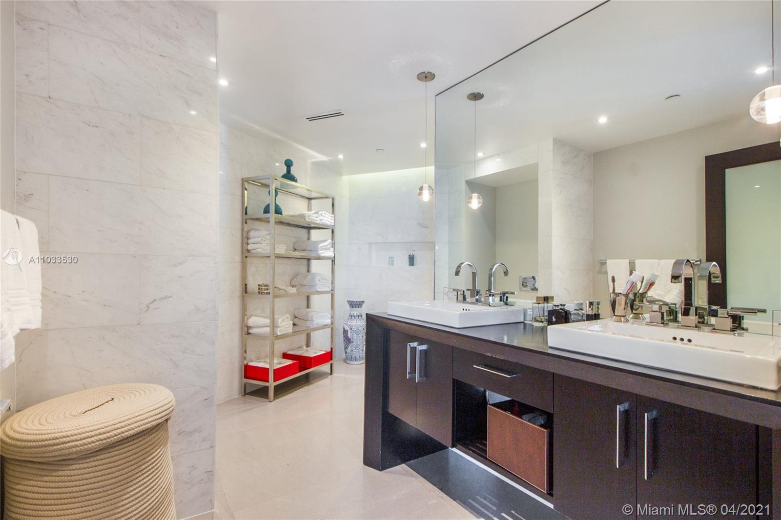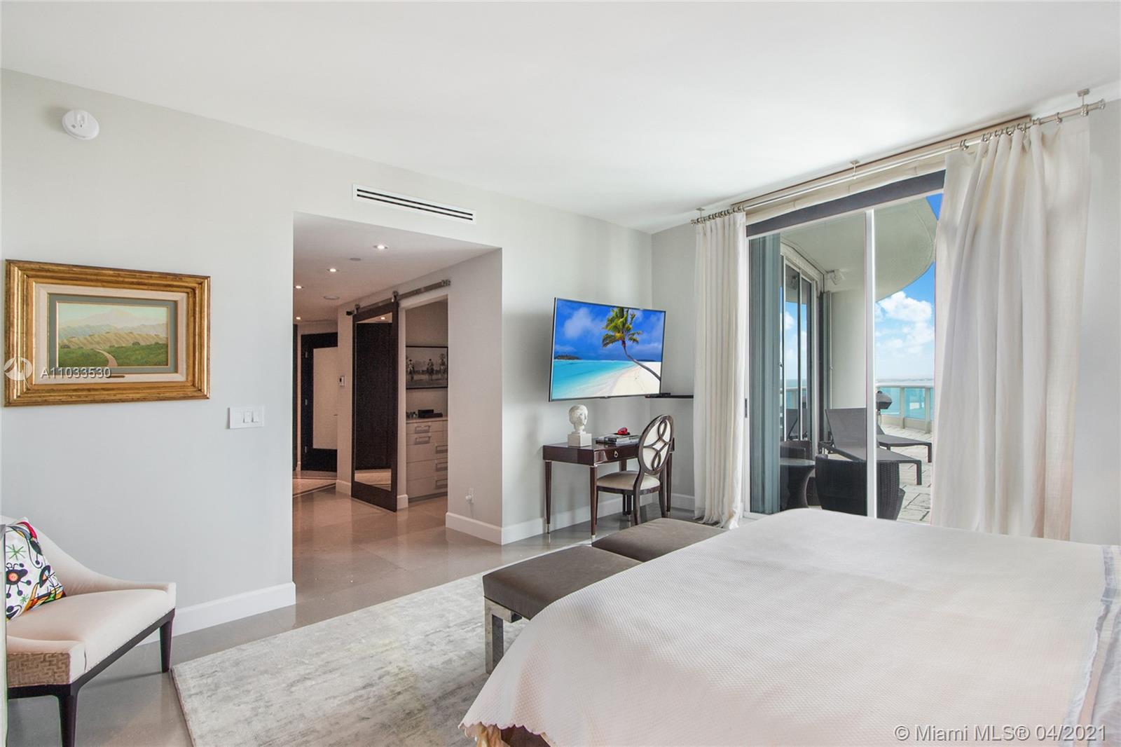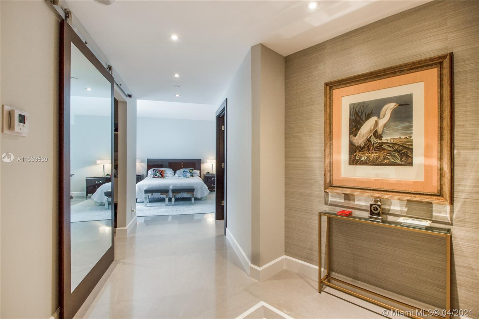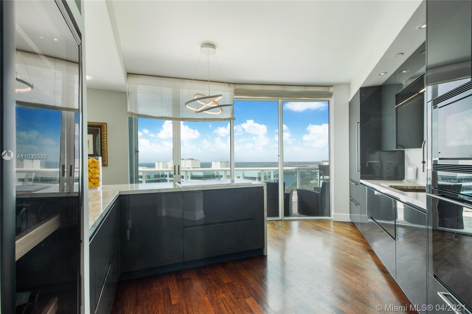 Impeccable designer remodeled residence, featuring unobstruted breathtaking panoramic views, over looking Biscayne bay. Upgrades include an open kitchen concept, blending in perfectly with the oversized family & dining rooms, including high-end appliances; Subzero and Wolf cook top, range and microwave. Private elevator foyer with beautiful Venitian plastered walls, rich finishes like mahogany herring-bone patterned floors, bled beautiful with contemporary finishes. All rooms offer water views & each room has direct access to the oversized wrap-around balcony. Designer furniture and art negotiable at a separate price, for a complete turnkey opportunity. Rare 3 assigned secured covered parking spaces included, as well as an additional storage unit convey with the property.