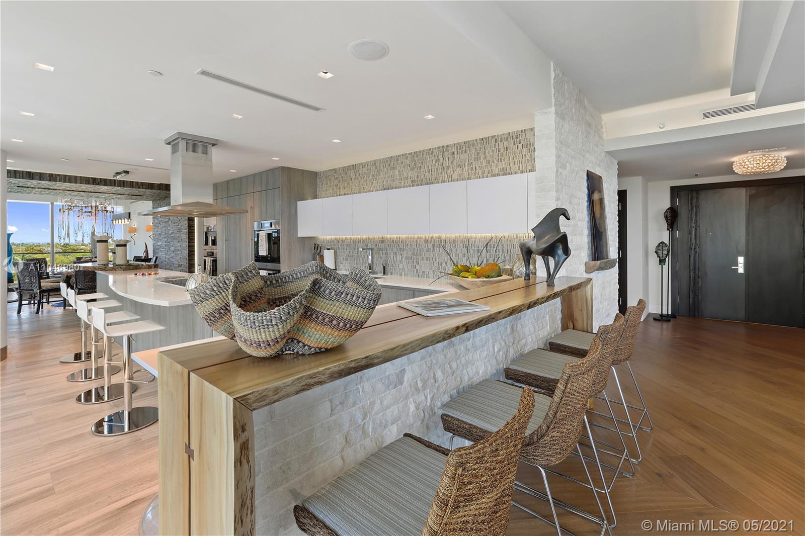 Direct ocean and bay views from this oversized home on the ocean. SE corner residence with 3791 interior sq ft and 2070 wraparound terrace. This sunlit condo with direct ocean views has been custom designed with finishes from all over the world. Crestron system controls lighting, music and shades. Snaidero and quartz kitchen, marble bathrooms with upgraded cabinetry. Floors are European white oak, Marble “Vena Grigio Honed” and Mosa black honed Mosaic Stone. All doors, door trims and hinges customer designed. Furniture and interiors designed by Santiago Bernal Design. Amenities include: Private beach, pools, Gym and spa, concierge, valet,. Includes 4 parking spots and a spot for golf cart. Oceana KB is the newest most luxurious full service building in Key Biscayne.
