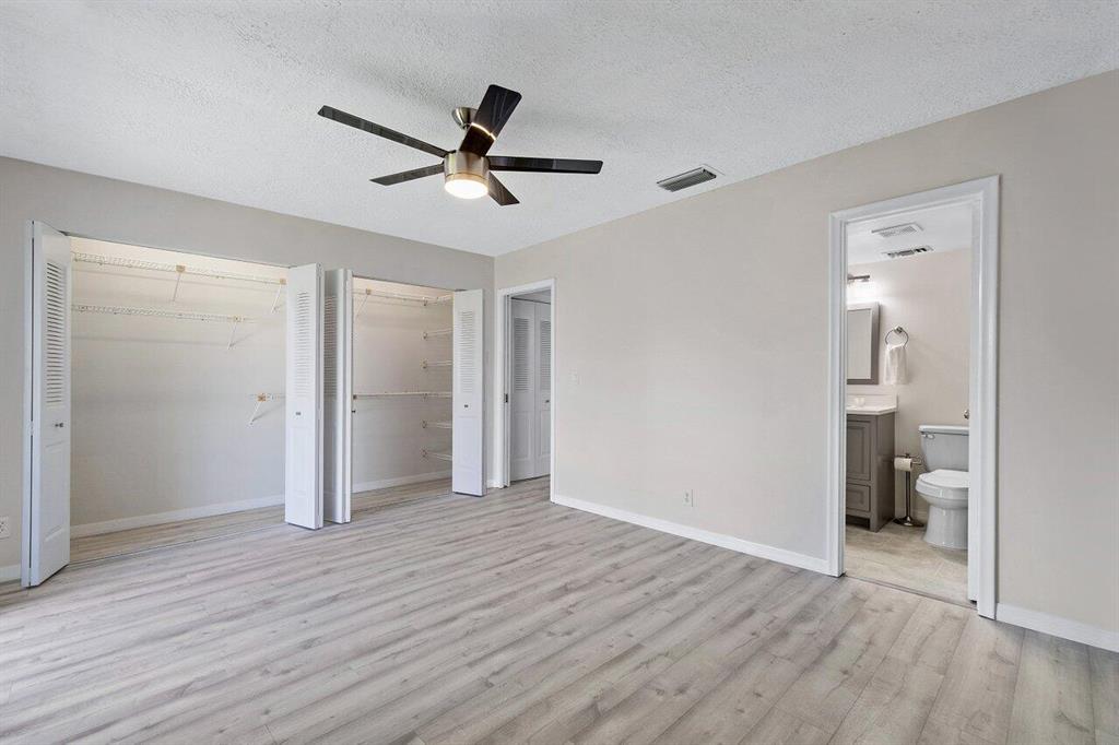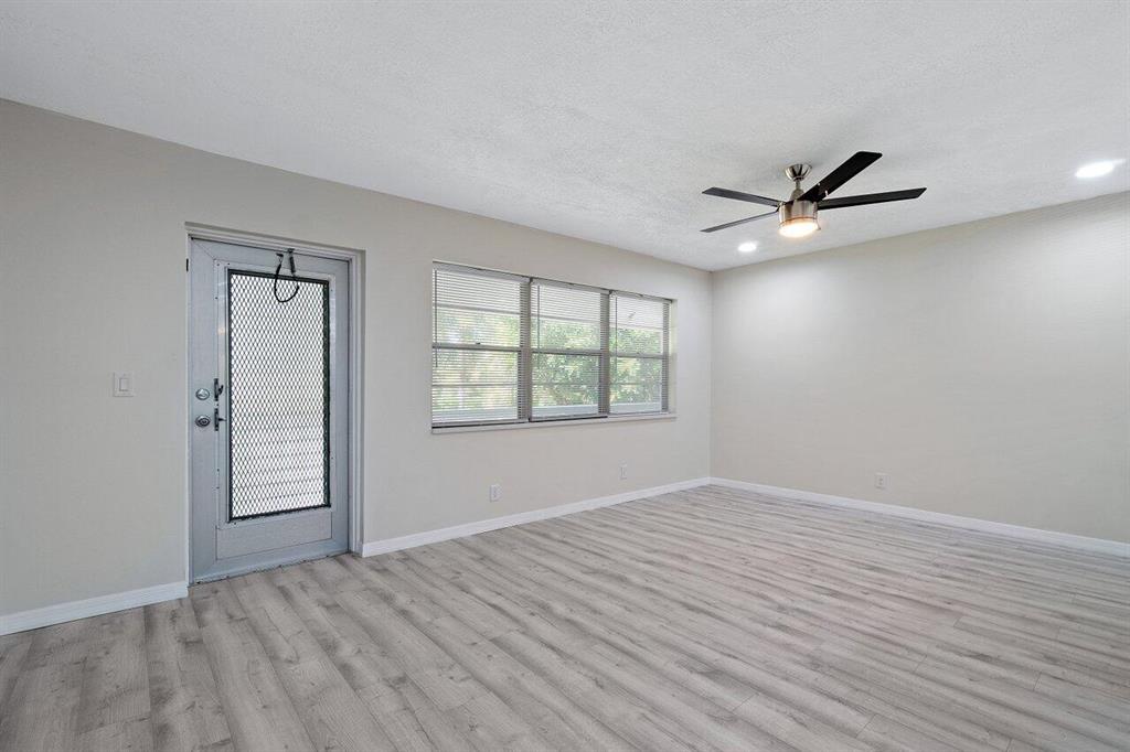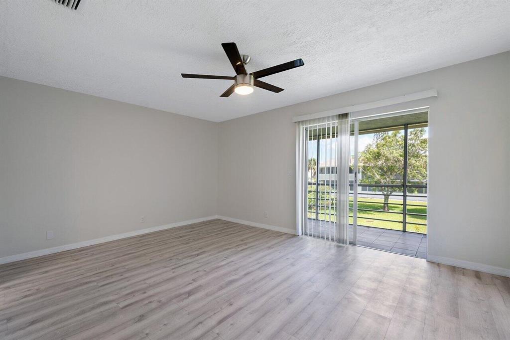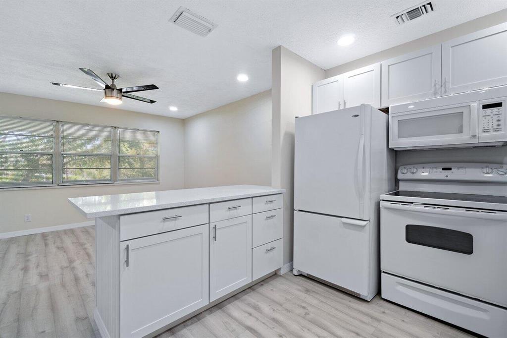 This is a gorgeous, newly renovated, spacious 1 bedroom, 1 1/2 bathroom condo tucked away in the beautiful guard-gated community of Century Village. Its bright and airy open floor plan is adorned with new wood-laminate flooring, dimmable LED recessed lighting, and remote controlled LED ceiling fans. The kitchen includes new shaker-white cabinets with a complementary tiled backsplash, along with White Diamond Quartz countertops, extra storage in the island, a top-mounted microwave, and a built-in dishwasher. The electric panel has been updated, along with a newer water heater and central air conditioner. Residents will enjoy the modernized bathrooms with all new fixtures, including a stunning shower with a glass splash guard and rain head shower in the main bathroom. This property's 2nd fl