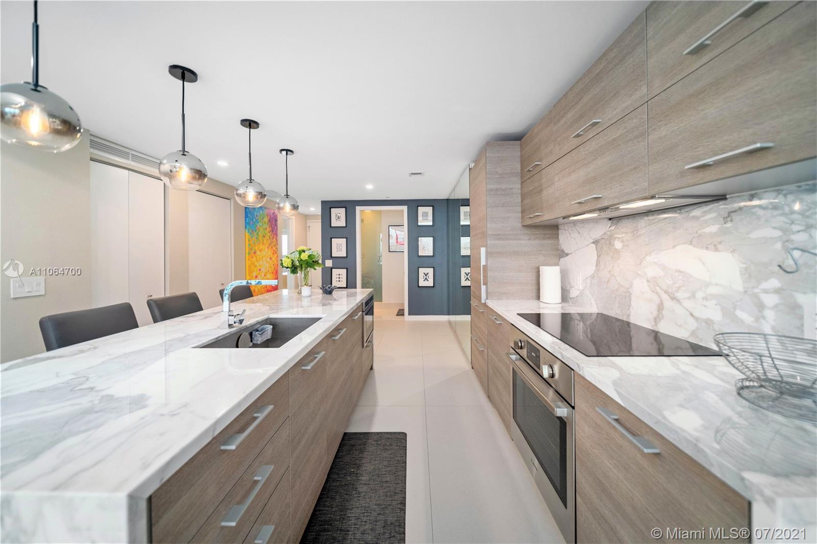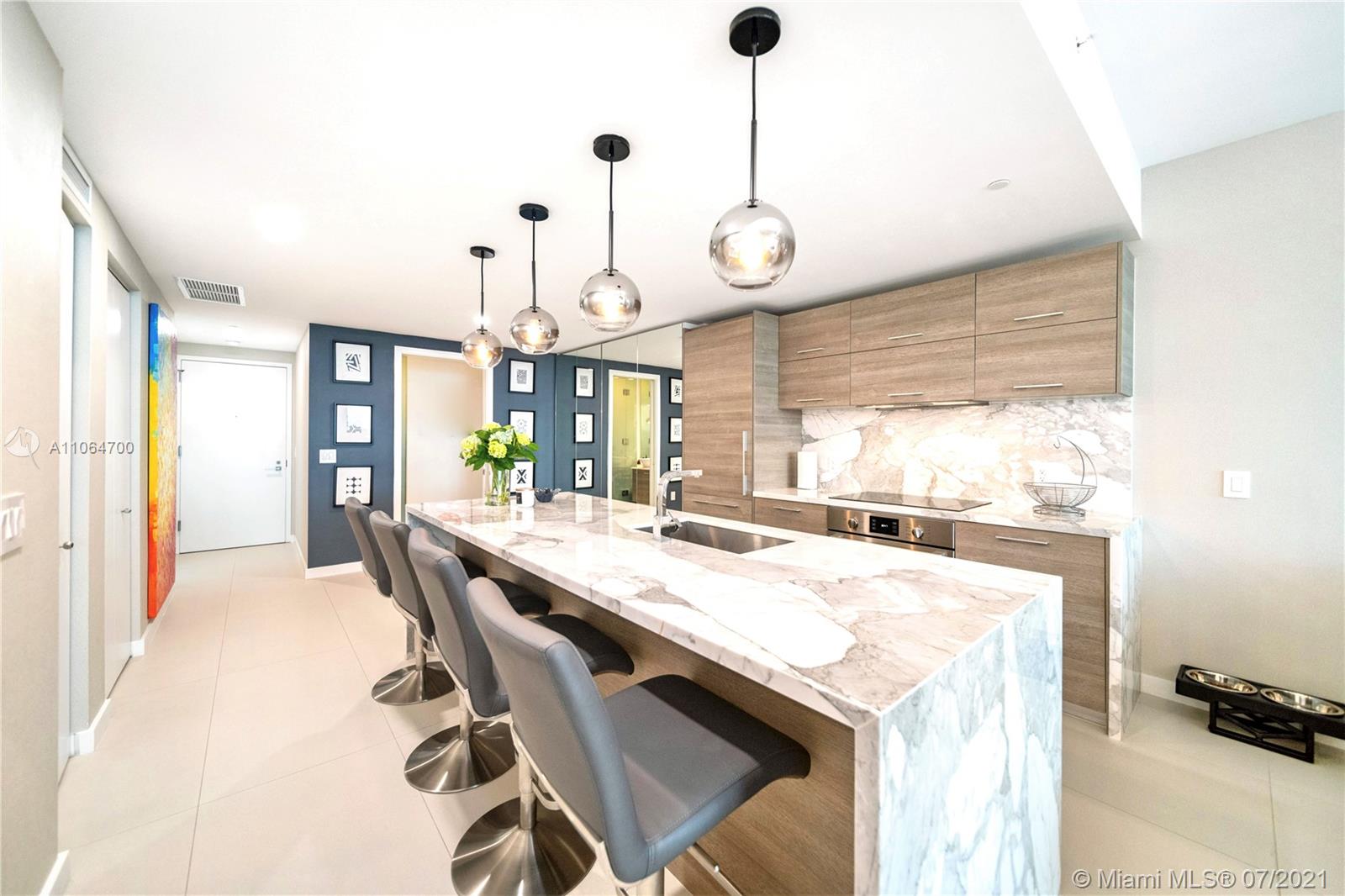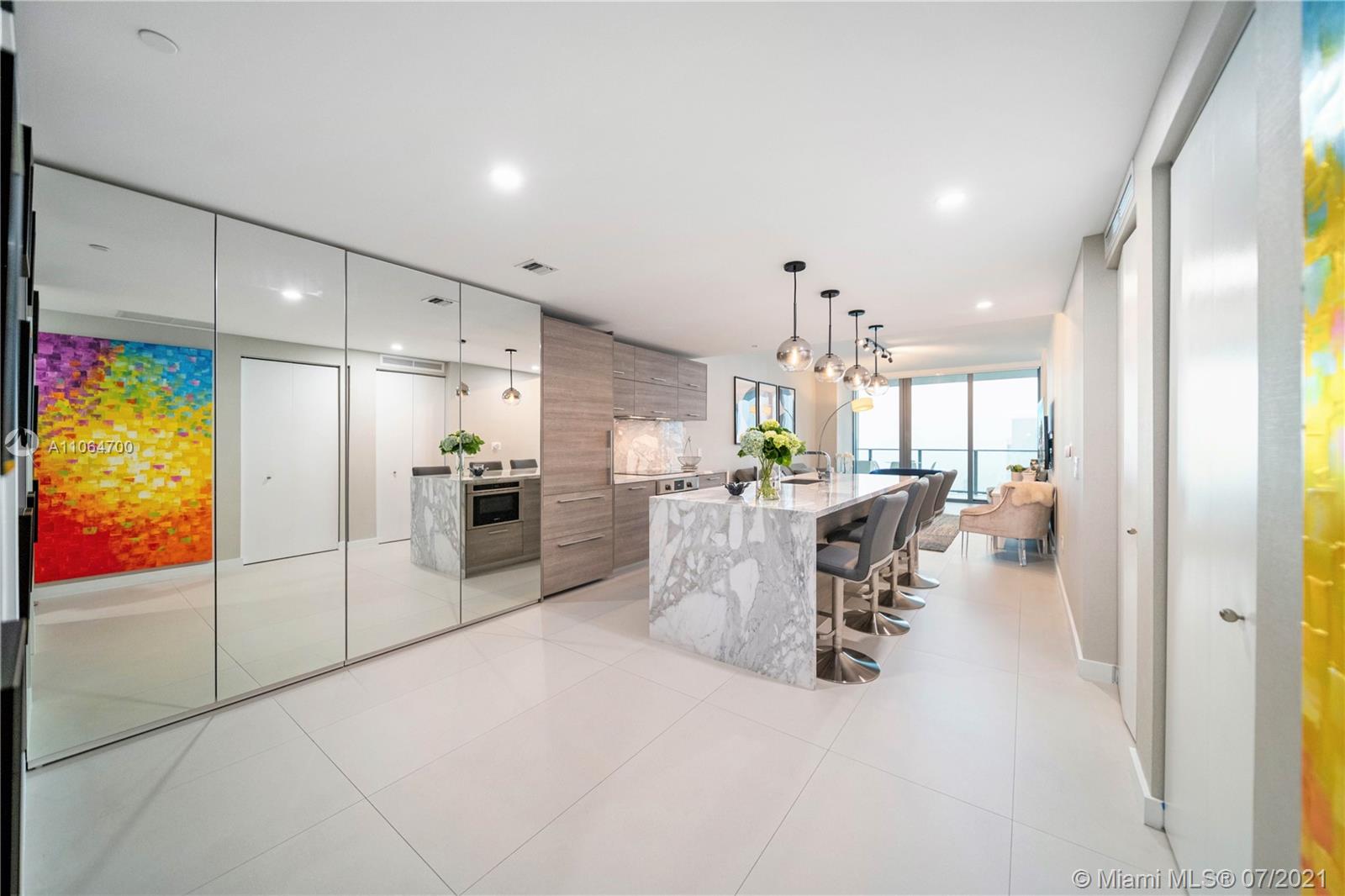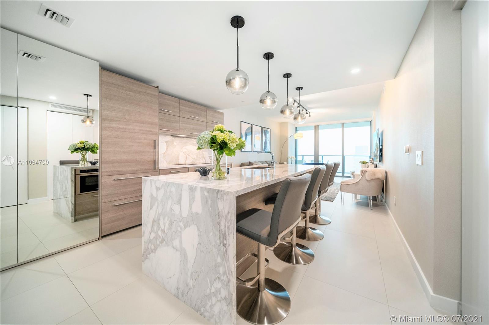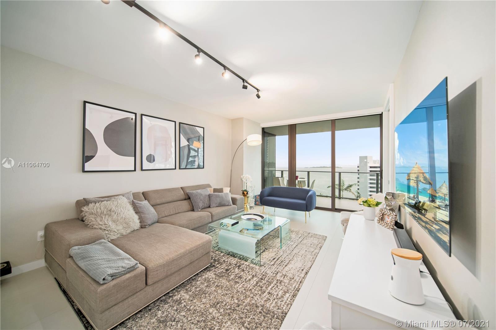 Luxurious upgraded condo w/ direct Bay views. 2 bed/3 baths +Den. Private elevator opens to unit. Foyer and living room walls covered with fine Italian wallpaper, Kitchen countertops and backsplash enhanced with luxurious Natural Stone Statuary Marble, which falls into waterfalls on all sides. Custom pantry furniture perfectly flushed to kitchen cabinets with elegant height mirror doors. Italian porcelain floors, from renowned Pininfarina Italian firm, throughout the condo including the spacious terrace, Custom walking closets, Motorized Window treatments w/blackouts and side channels. Beautiful lighting fixtures and spots throughout the unit. 1 parking & Valet for 2nd car. Gym, Spa, 2 tennis courts,Mini Golf,Wine Cellar,Cigar Lounge,Cinema,Children Lounge, bowling, Amara Restaurant & more
