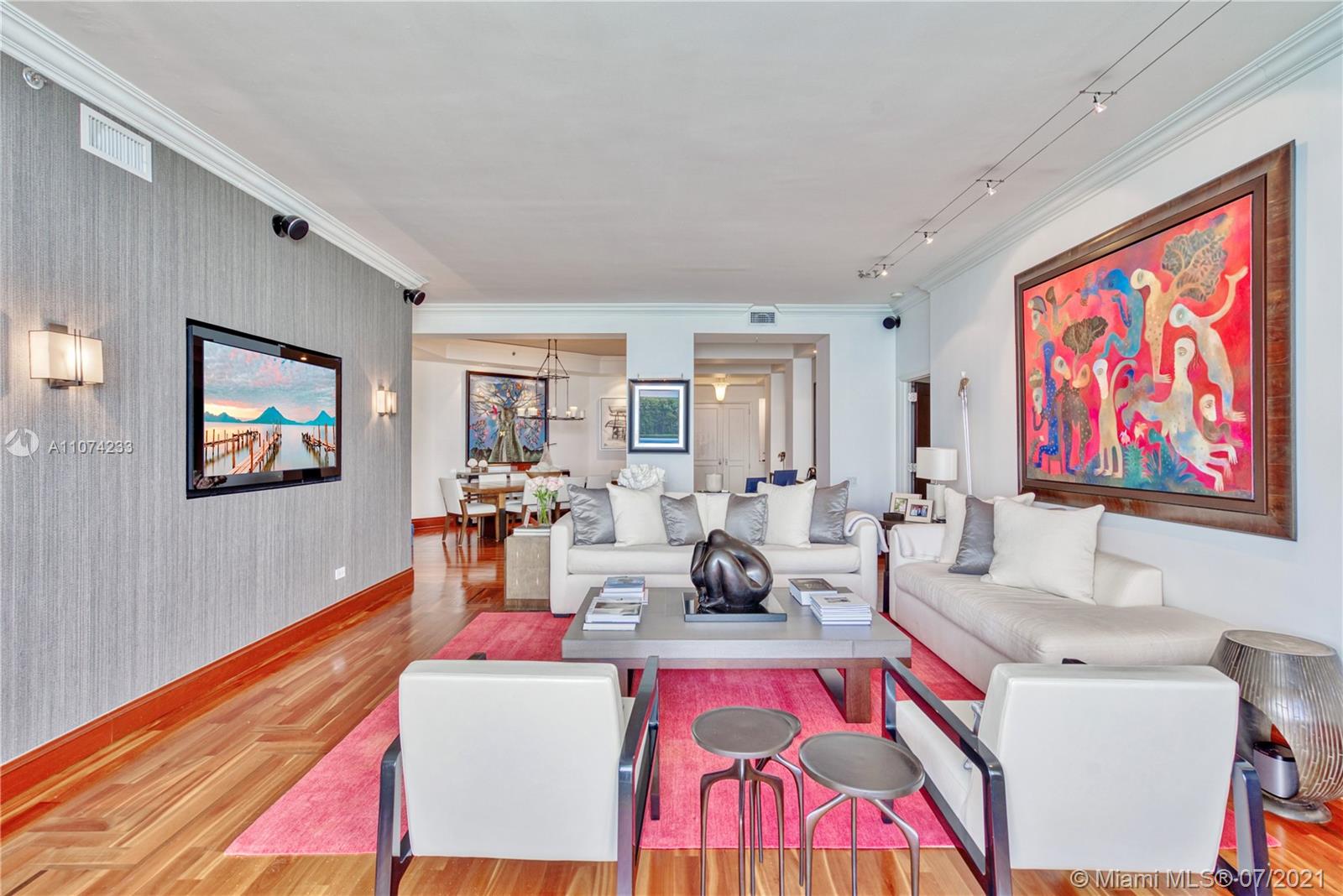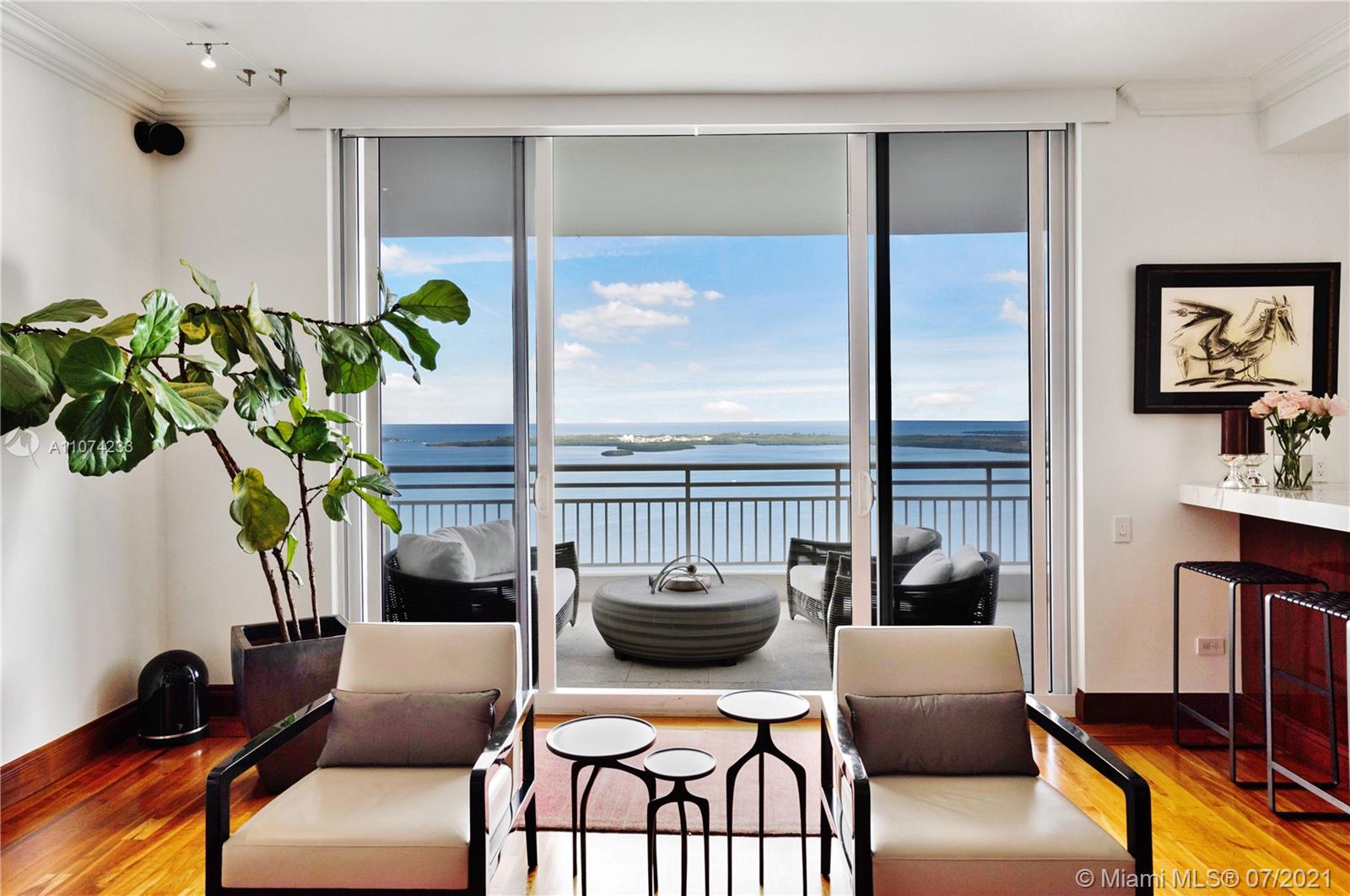 House in the Sky - STUNNING 3/3/1 at the luxurious Two Tequesta on Brickell Key - Rare high ceiling unit that feels like a house! 2 great parking spaces, 2 large storage lockers (w/ AC), stunning Bay/Ocean/Fisher Island/Key Biscayne/Miami Beach views from a massive balcony, American cherry wood floors, upgraded lighting/electronics, Phillip Jeffries wallpaper from Holly Hunt, electric blinds (in living room/kitchen/master bedroom) a stunning kitchen w/ Mia Cucina cabinetry, Italian Calacatta Marble, Sub Zero/Miele/Wolf appliances (including a giant wine fridge), an eat-in breakfast area w/ a pass through, a master suite w/ amazing views, large built-out closets, & a gorgeous bathroom w/ waterworks fixtures, a double vanity, jacuzzi tub, and Gaudi marble slab flooring. This unit won't last!