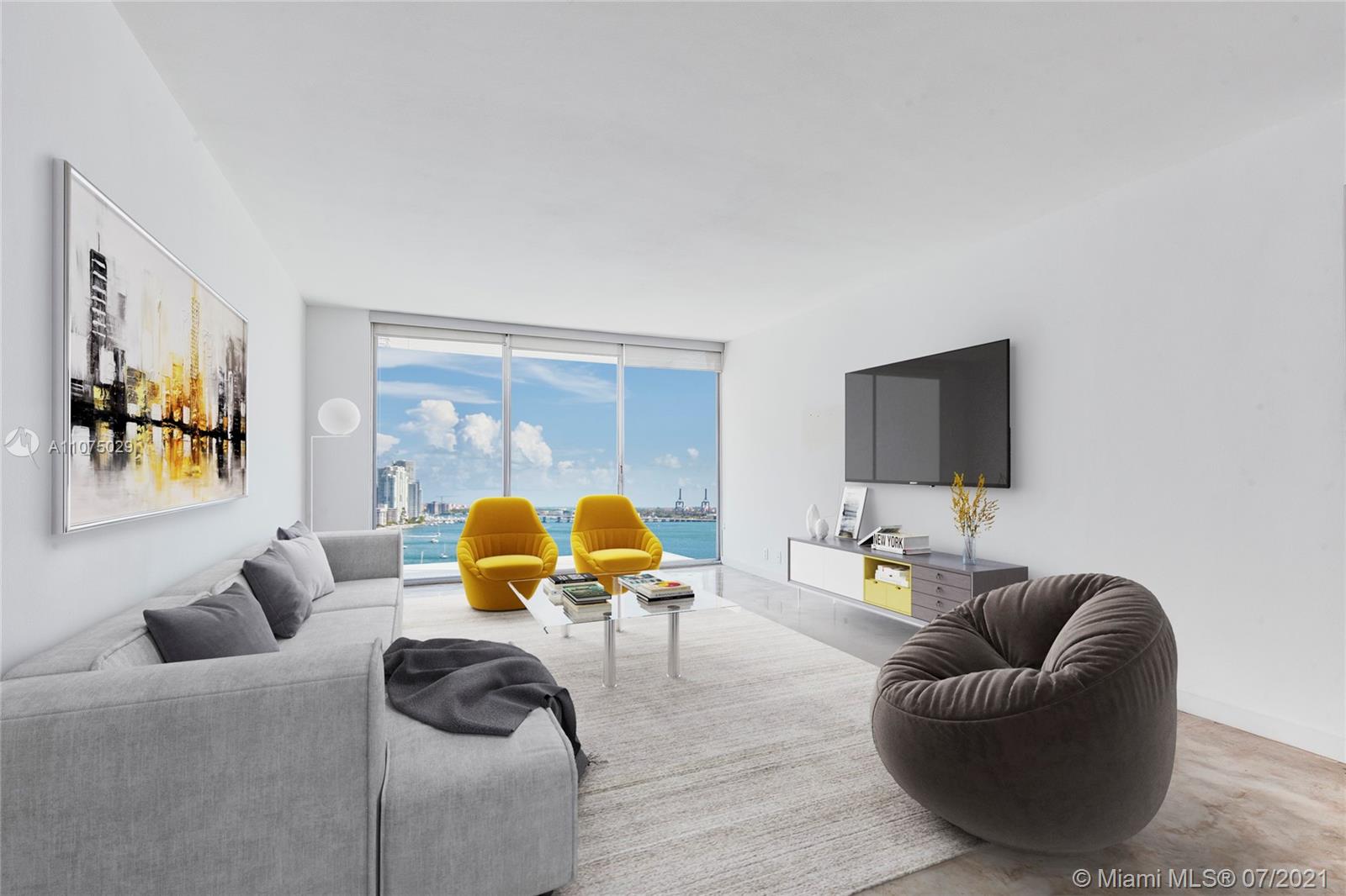 Updated, large 1-bedroom residence at Mirador South. Beautiful southwest views of Biscayne Bay and downtown Miami throughout this bright and spacious residence. Appointed with modern, polished concrete floors and renovated master bathroom with grey/white marble shower and white oak vanity. Custom closet-system in the roomy master bedroom walk-in. Telescopic glass sliding door spill out onto your terrace overlooking the bay. Full-service amenities including valet, 24-hour front desk/security, heated pool & hot tub, state-of-the art fitness center, and convenience store. Cable and high-speed internet included in HOA.