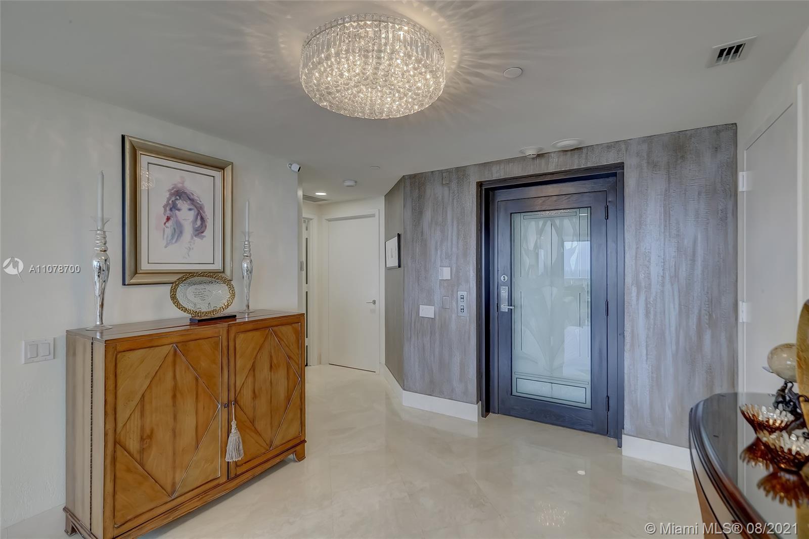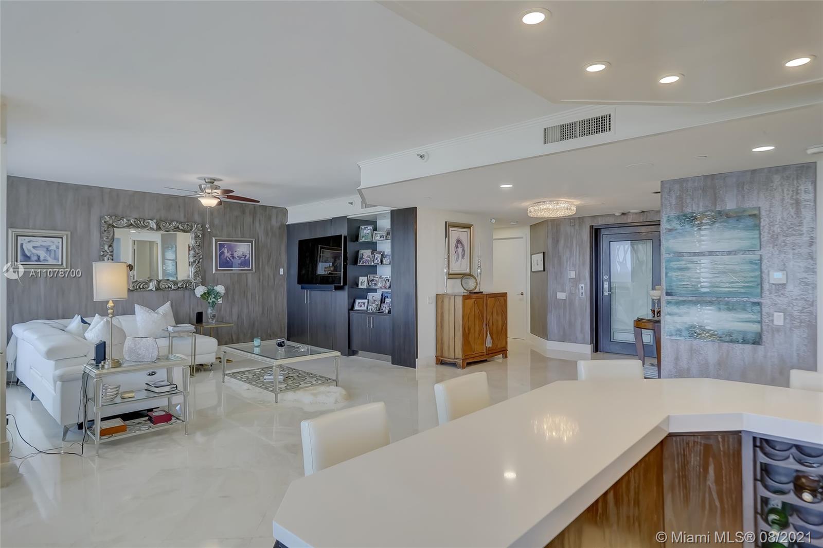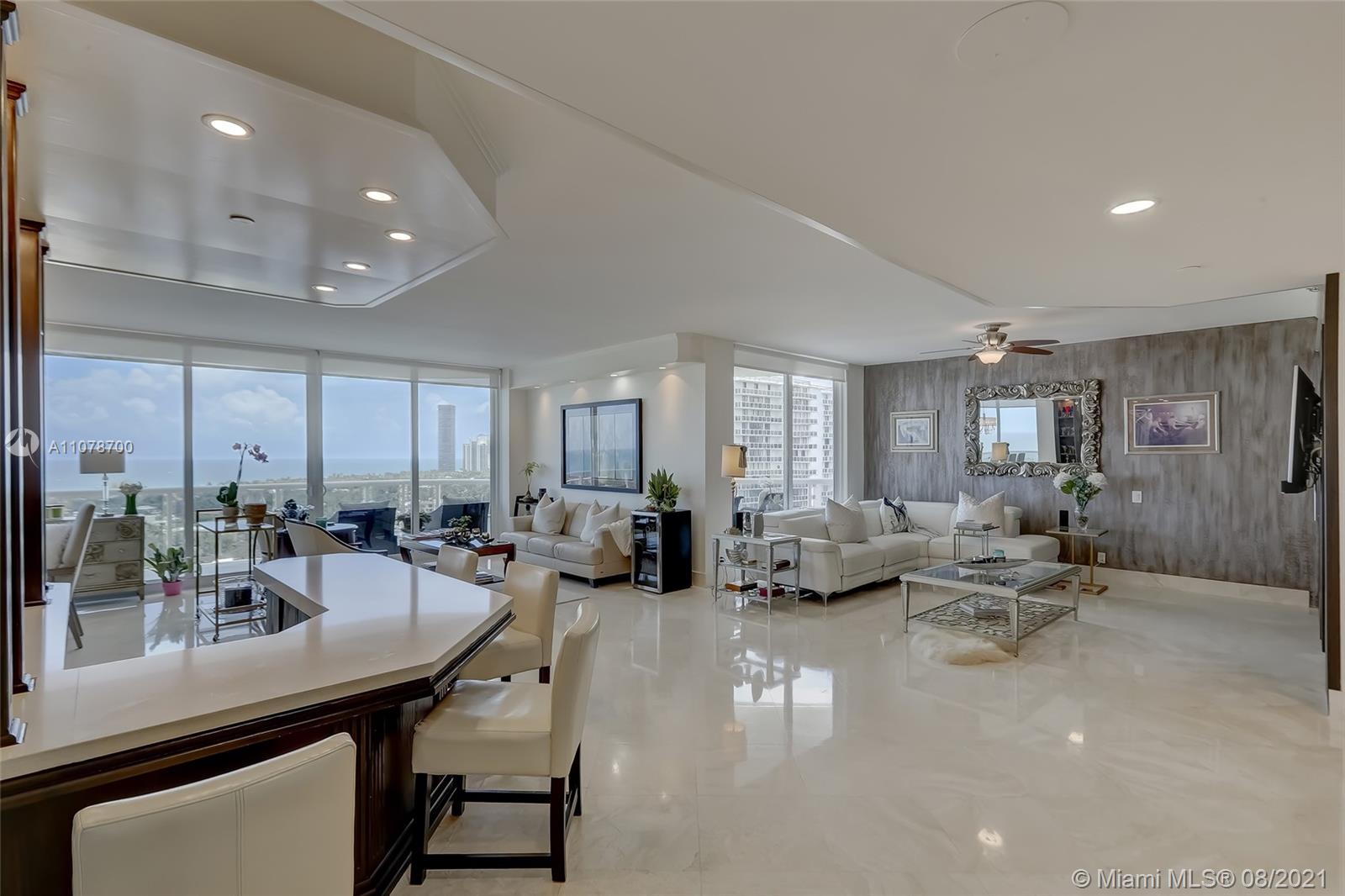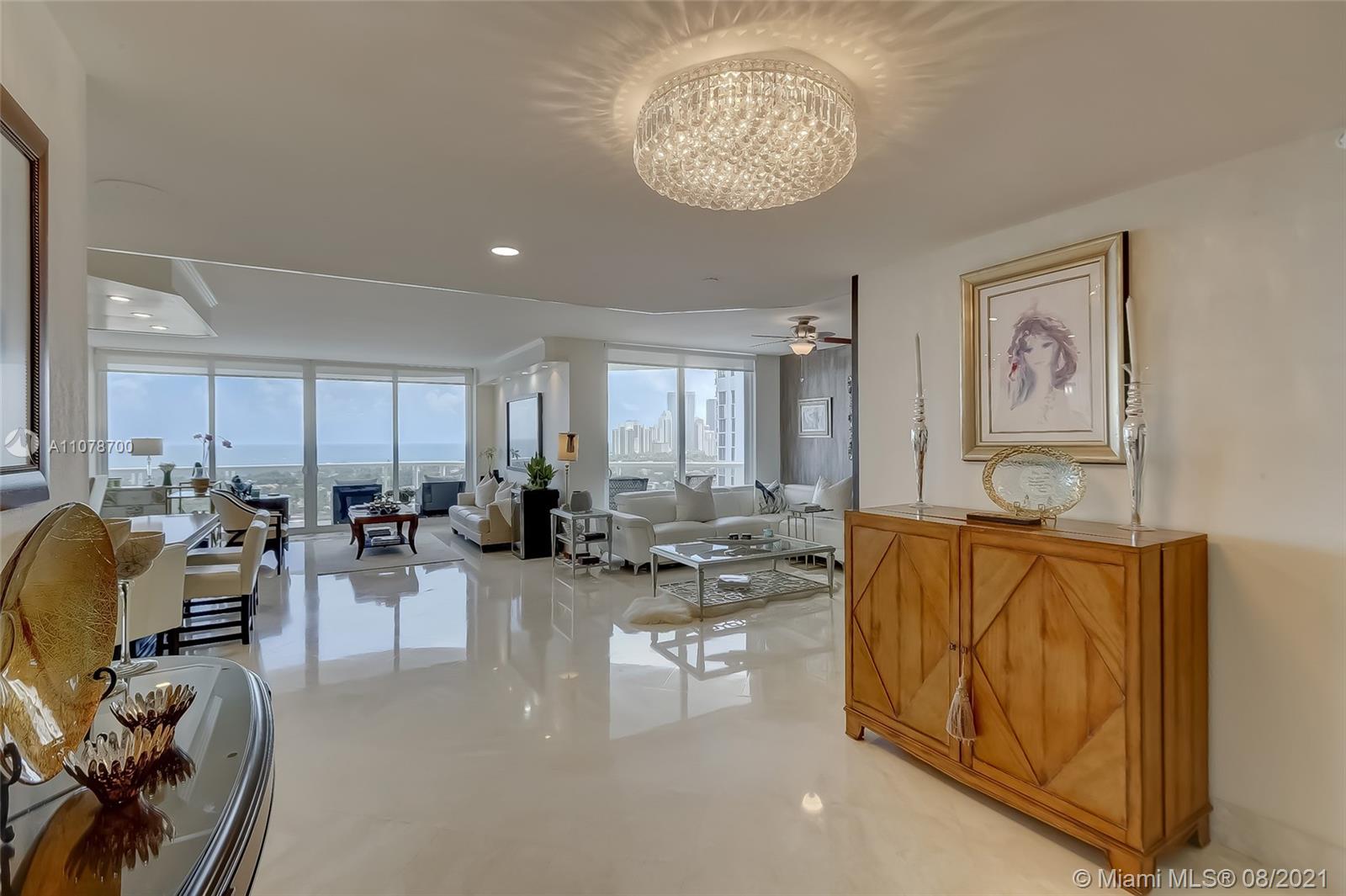 Enter this luxurious residence through your private elevator and immediately enjoy breathtaking Ocean and Intracoastal views seen from within the unit. Huge wraparound balcony accessible from every room. Direct East and SE views in the highly desirable line 02. Features marble floors throughout, Italian porcelain tile in two of the bedrooms, open and spacious concept, floor-to-ceiling hurricane impact windows. Contemporary kitchen, Sub Zero refrigerator, dual wall oven & quartz counters. Custom-made closets. The 3rd bedroom is being used as a den/home office. Prestigious One Island Place in Aventura is a resort style community: State of the art fitness center, spa w/ private treatment rooms, sauna, steam room, 2 pools, 3 hot tubs, café, 2 tennis courts. 2 marinas located walking distance.