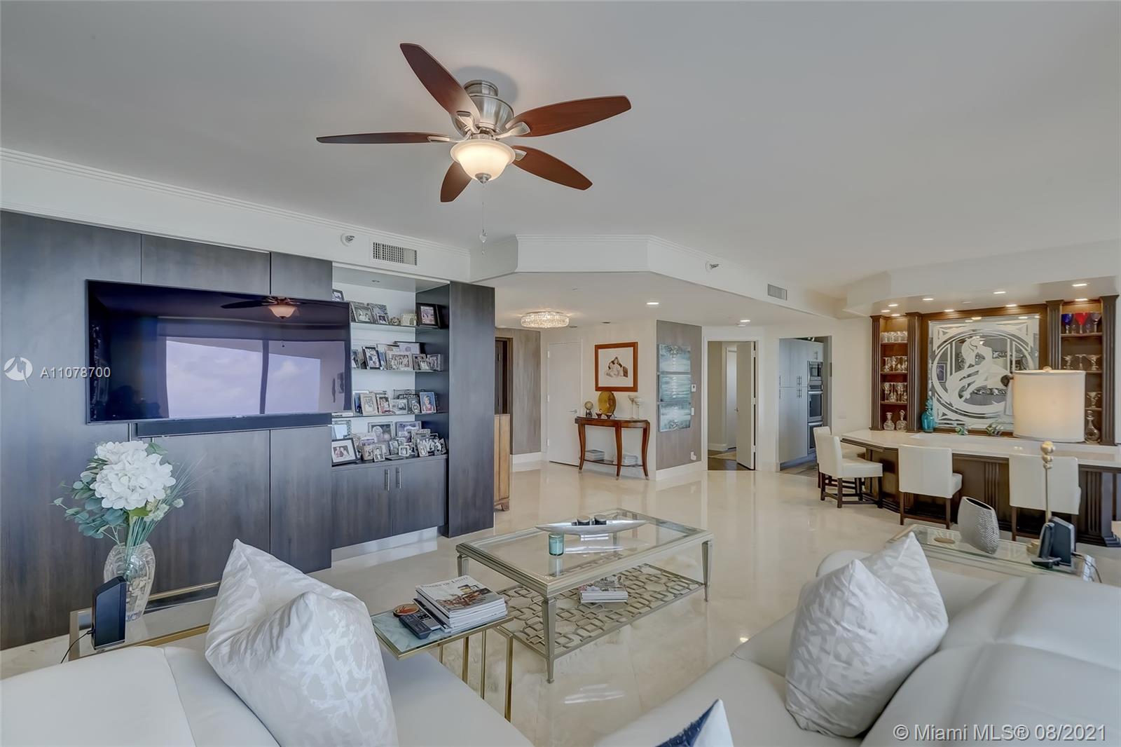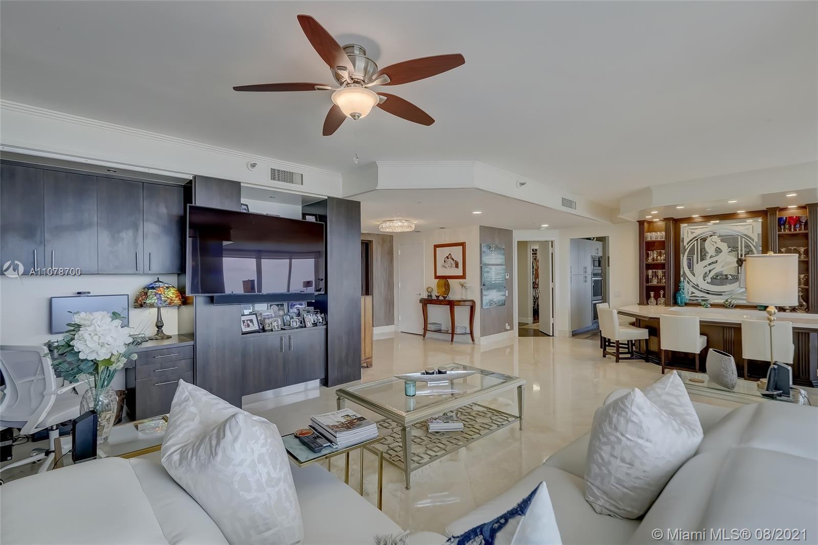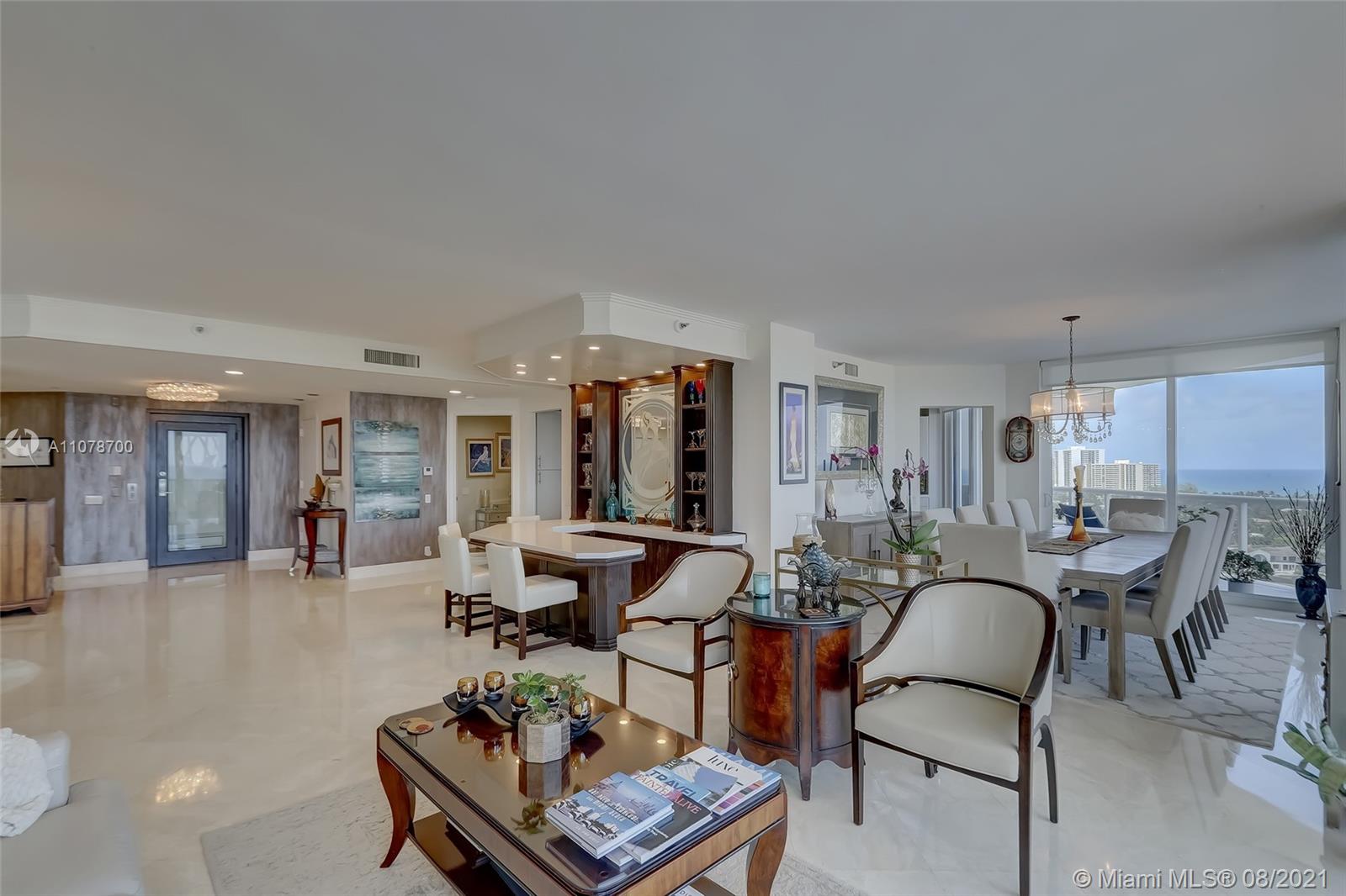 Enter this luxurious residence through your private elevator and immediately enjoy breathtaking Ocean and Intracoastal views seen from within the unit. Huge wraparound balcony accessible from every room. Direct East and SE views in the highly desirable line 02. Features marble floors throughout, Italian porcelain tile in two of the bedrooms, open and spacious concept, floor-to-ceiling hurricane impact windows. Contemporary kitchen, Sub Zero refrigerator, dual wall oven & quartz counters. Custom-made closets. The 3rd bedroom is being used as a den/home office. Prestigious One Island Place in Aventura is a resort style community: State of the art fitness center, spa w/ private treatment rooms, sauna, steam room, 2 pools, 3 hot tubs, café, 2 tennis courts. 2 marinas located walking distance.