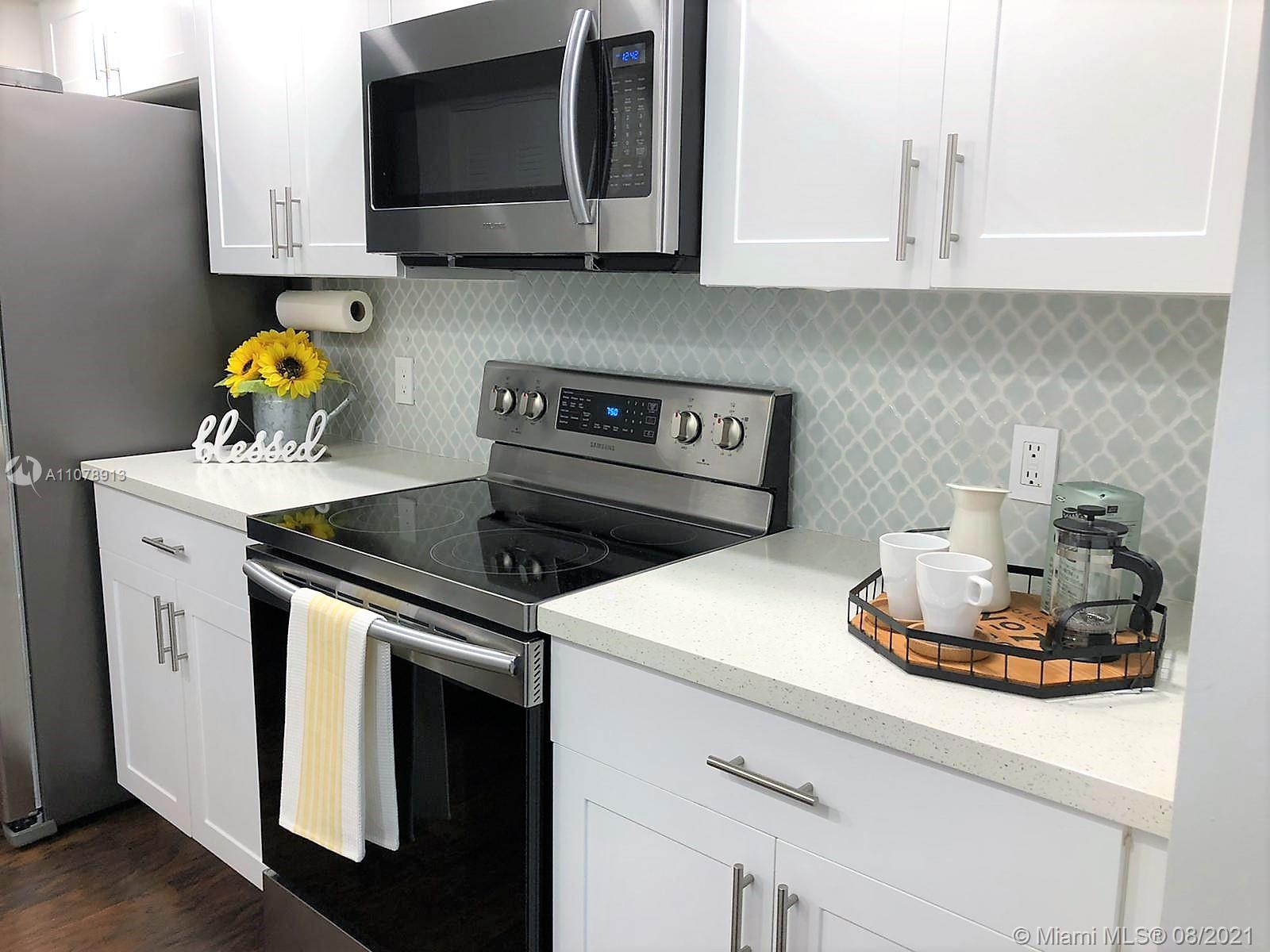 Great Opportunity! Beautiful and immaculate condo in the desired community of Century Village. Fully remodeled. Enjoy NEW kitchen with NEW cabinets, NEW quartz countertop and backsplash, NEW Samsung appliances (Double door refrigerator, Dishwasher, Stove). New laminate floor throughout, Fully remodeled bathrooms, New blinds, and New washer and dryer. LED Lights throughout, 2 walk-in closets. Unit is located right near the elevator. This property has it all! Best location for 55+ with a large Club House, pools, club health, Free Shuttle service, Golf, Lighted Tennis, Movies, Ping-pong, Theater, Shows, Dance and the list goes on! This unit won't last in the market!