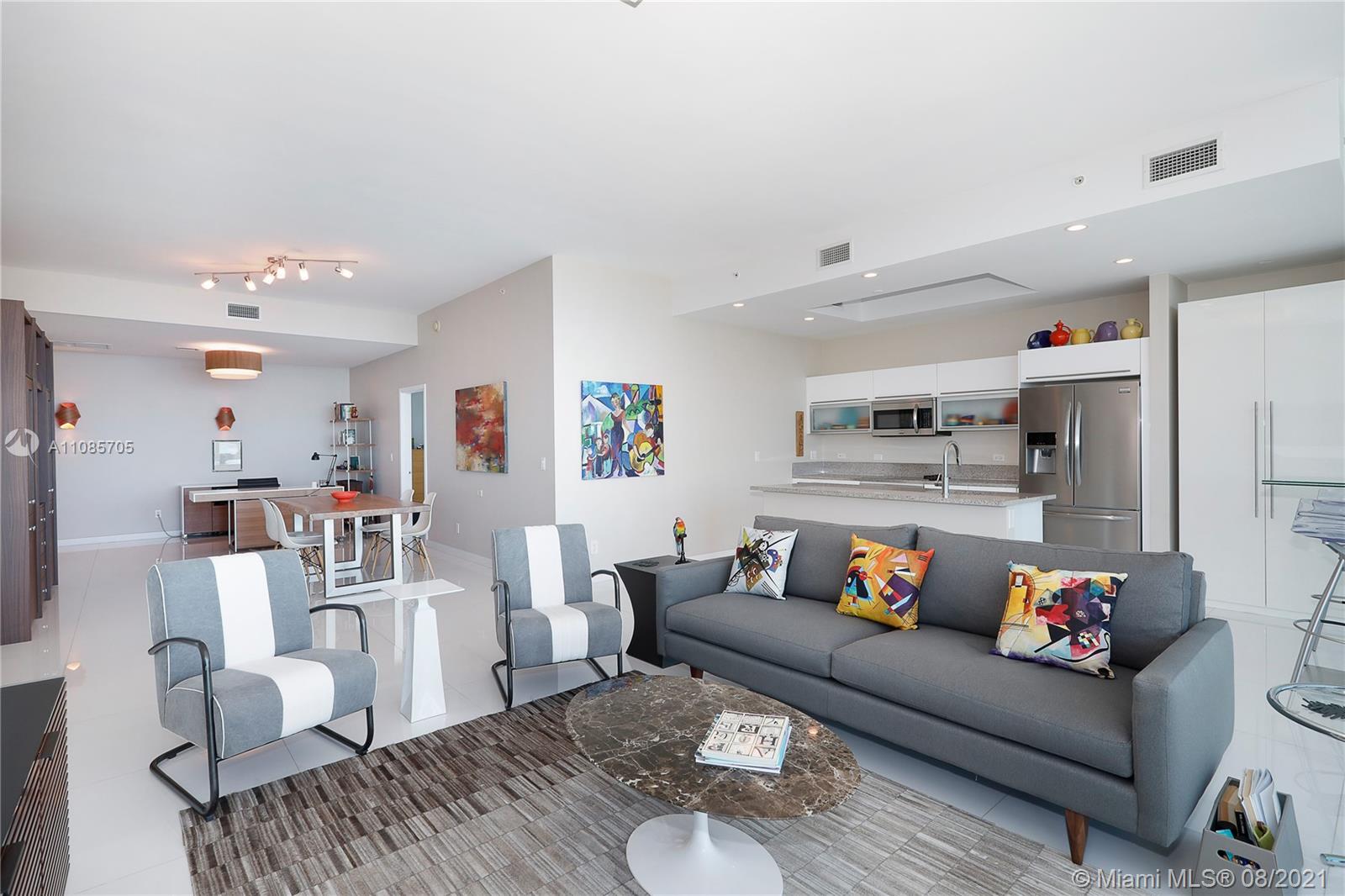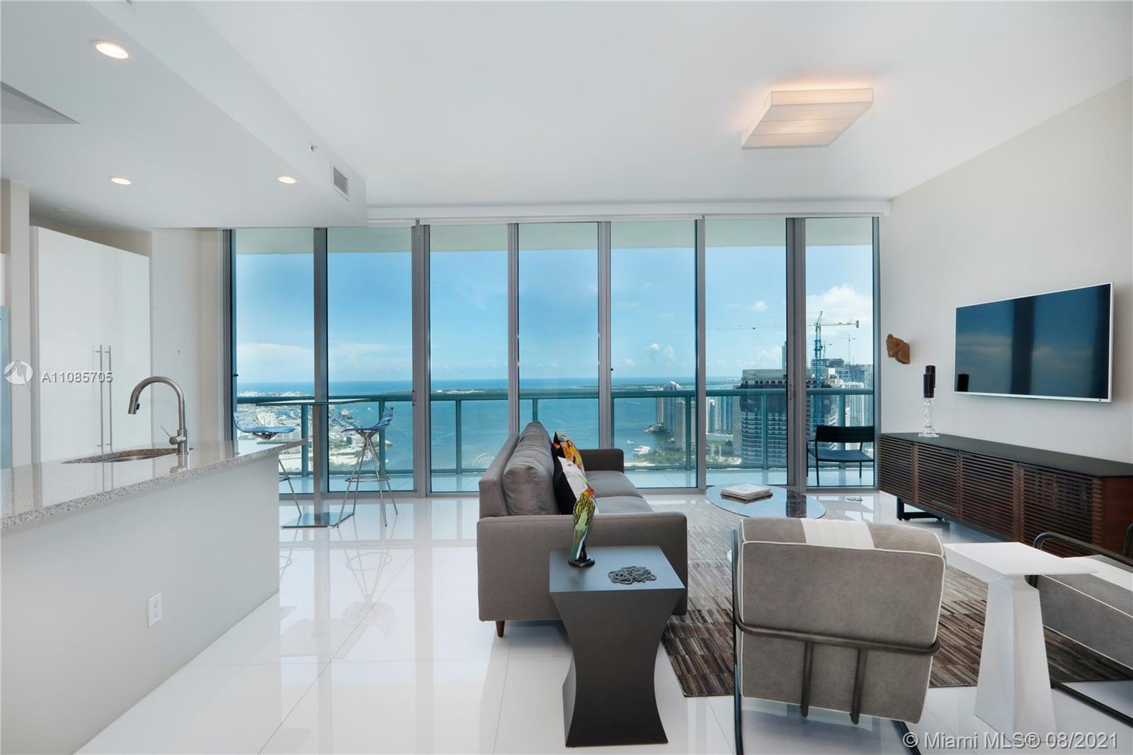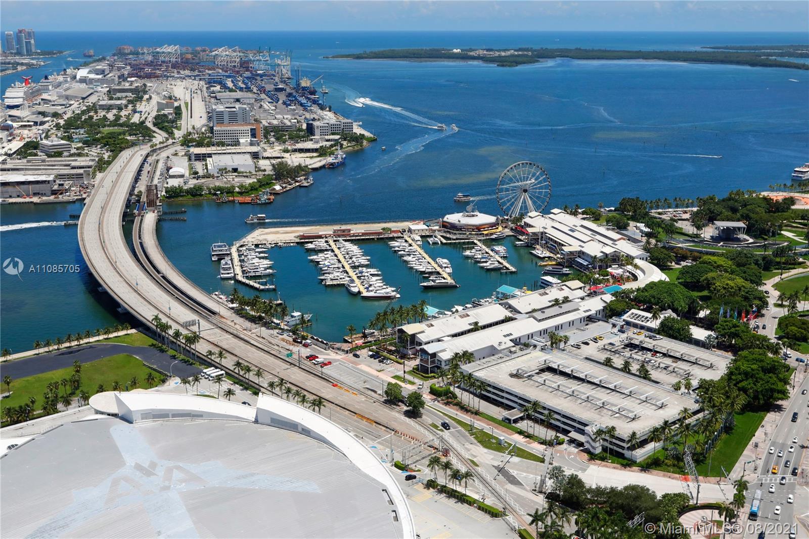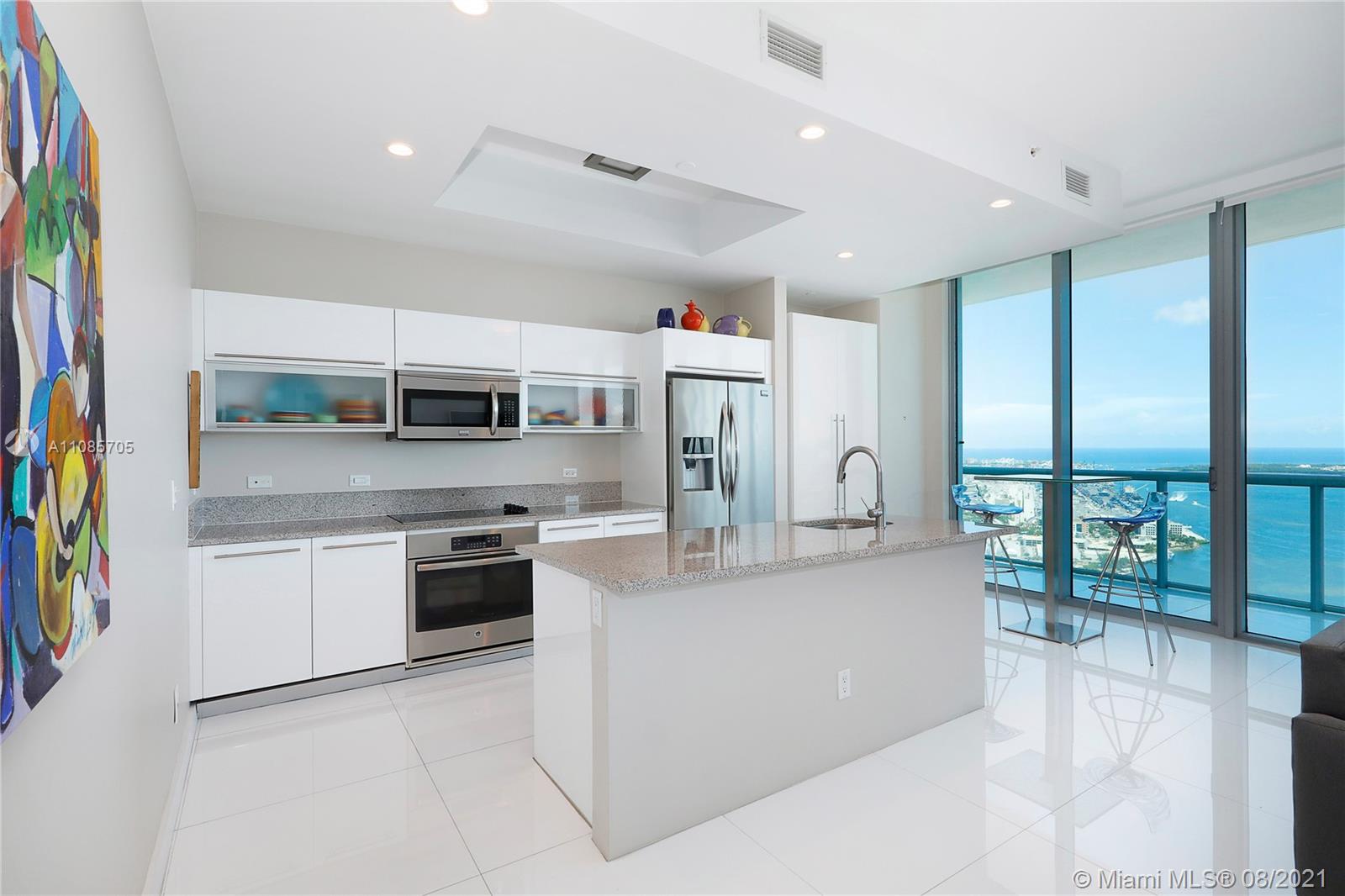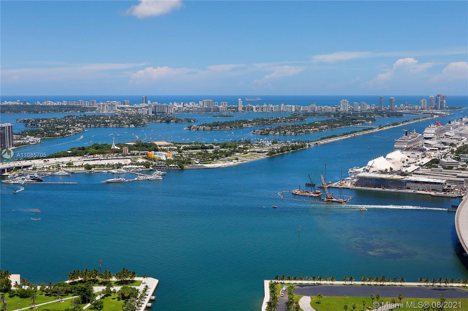 Beautiful skyloft with floor to ceiling windows framing unparalleled skyline and bay views from the 56th floor of Marinablue by Architectonica. This unit offers a spacious balcony and split floor plan with 2 master bedrooms and a half bath. Eat in kitchen, stainless steel appliances and quartz countertops. Tiled throughout with in unit washer and dryer, motorized blackout curtains, storage cage and 1 assigned parking space. Building amenities include sunset & sunrise pools, hot tubs, fitness center, sand volleyball court, business center, putting green, BBQ, 24-hour concierge and valet parking. Ideal Downtown location, minutes away from South Beach, Performing Arts Center, Design District and Major Highways.