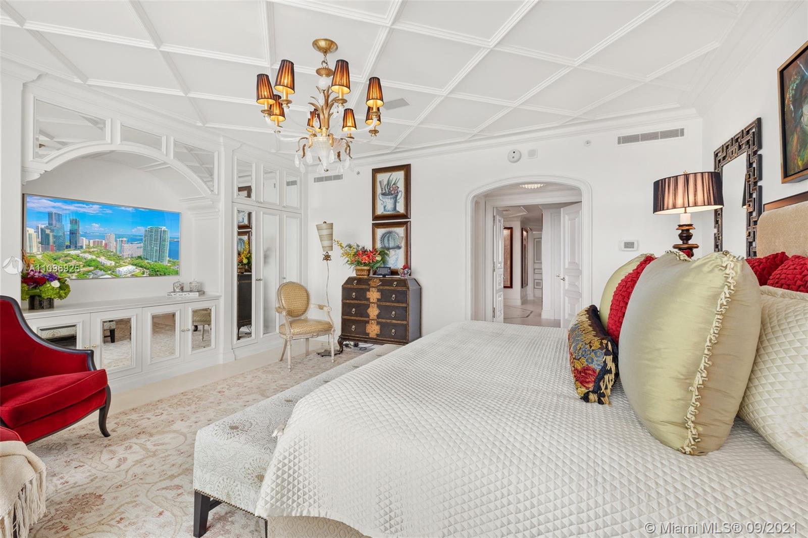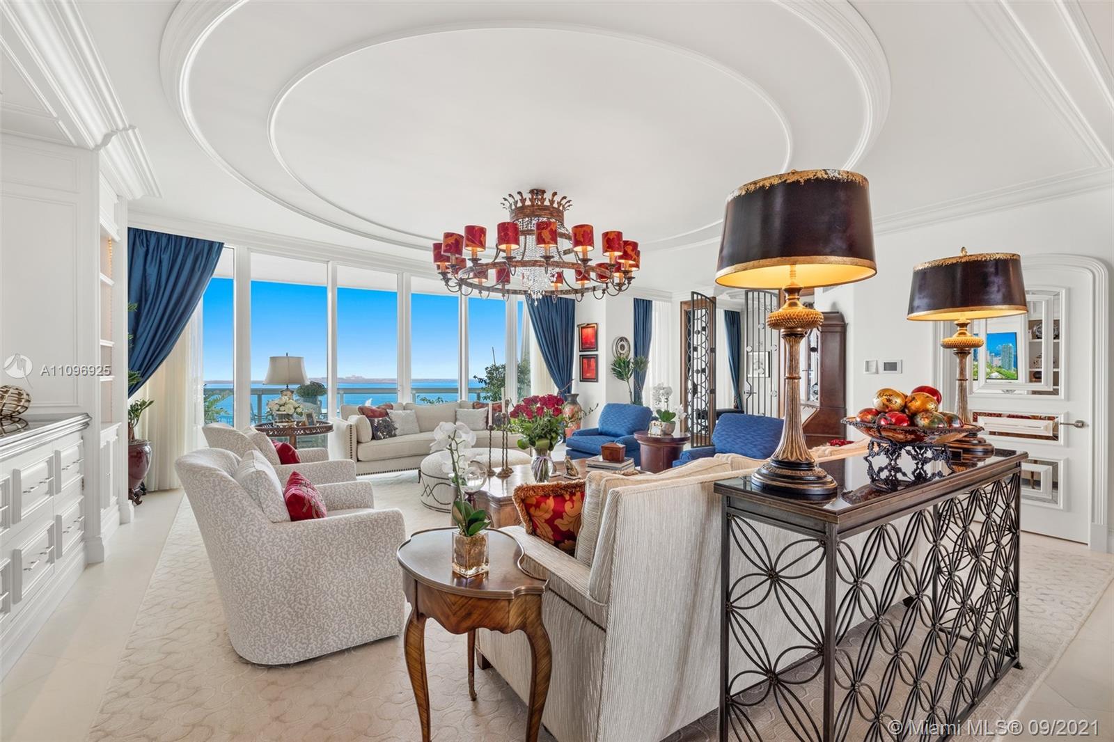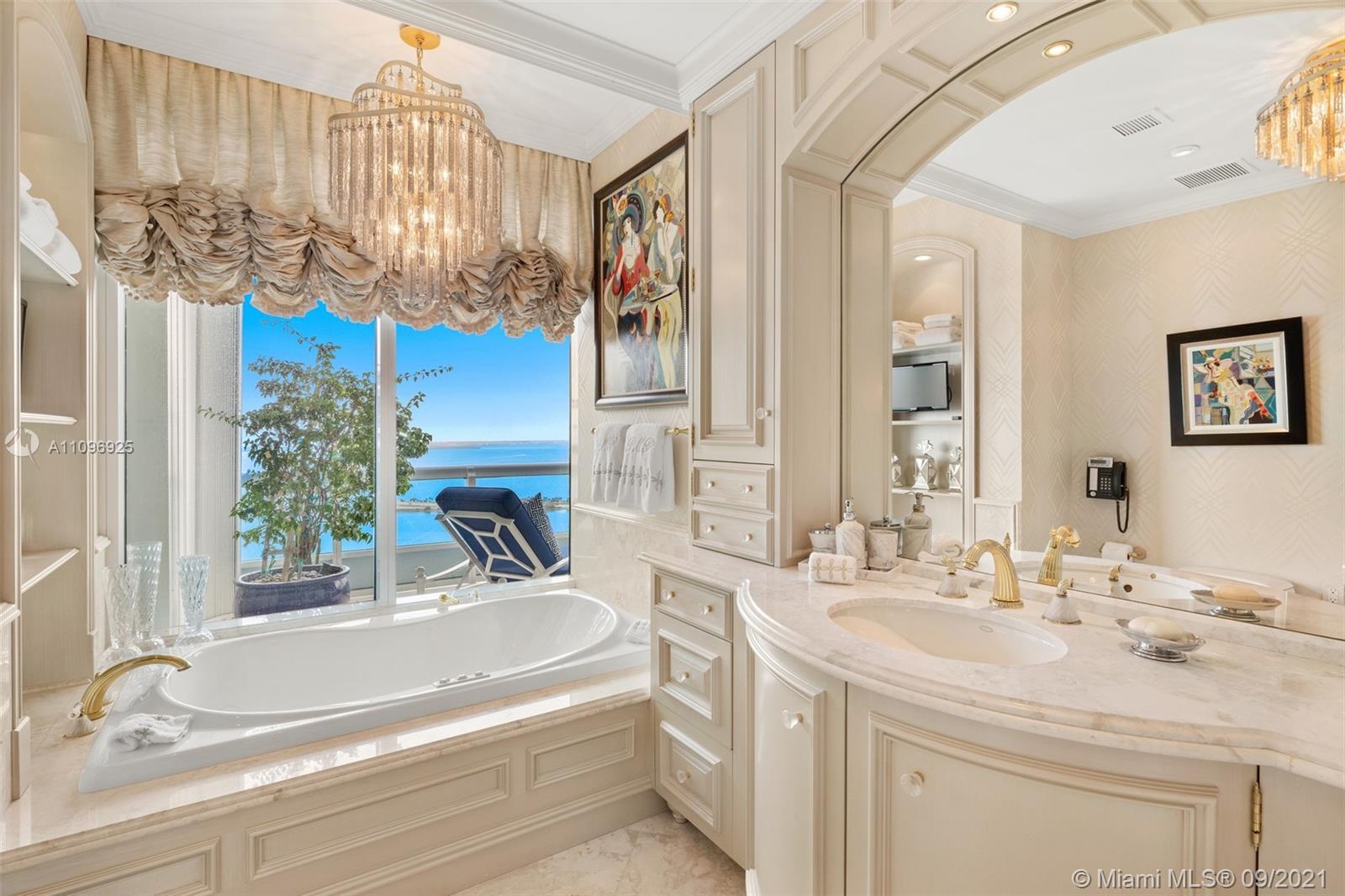 The best flow-thru plan in Santa Maria, residence 4205, sits on the 42nd floor with drop dead gorgeous views spanning from the bay to the city. Completely gutted and renovated and costing over $2 million, it is a must see. The unit offers an open concept kitchen with brand new, never used Gaggenau appliances, soundproofed interior walls, limestone floors in main areas, custom carpets in bedrooms, expensive custom millwork and surround sound system in every room. The glorious master bedroom has access to the east terrace and enjoys the most beautiful water views all the way to Key Biscayne. There is a well-appointed his and hers marble bathroom and a custom walk-in closet. The two additional bedrooms are en suite and open to the large west-facing terrace.