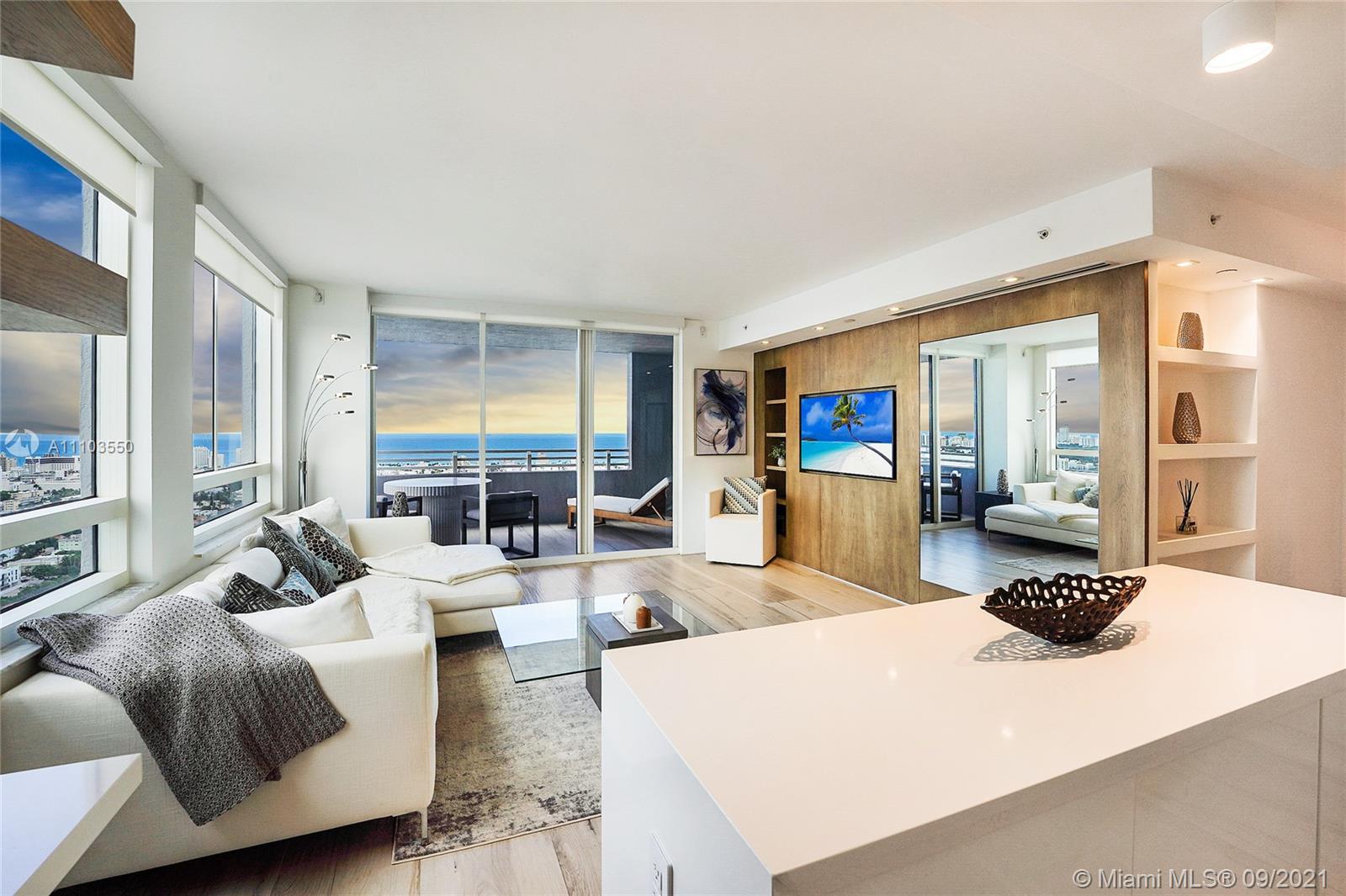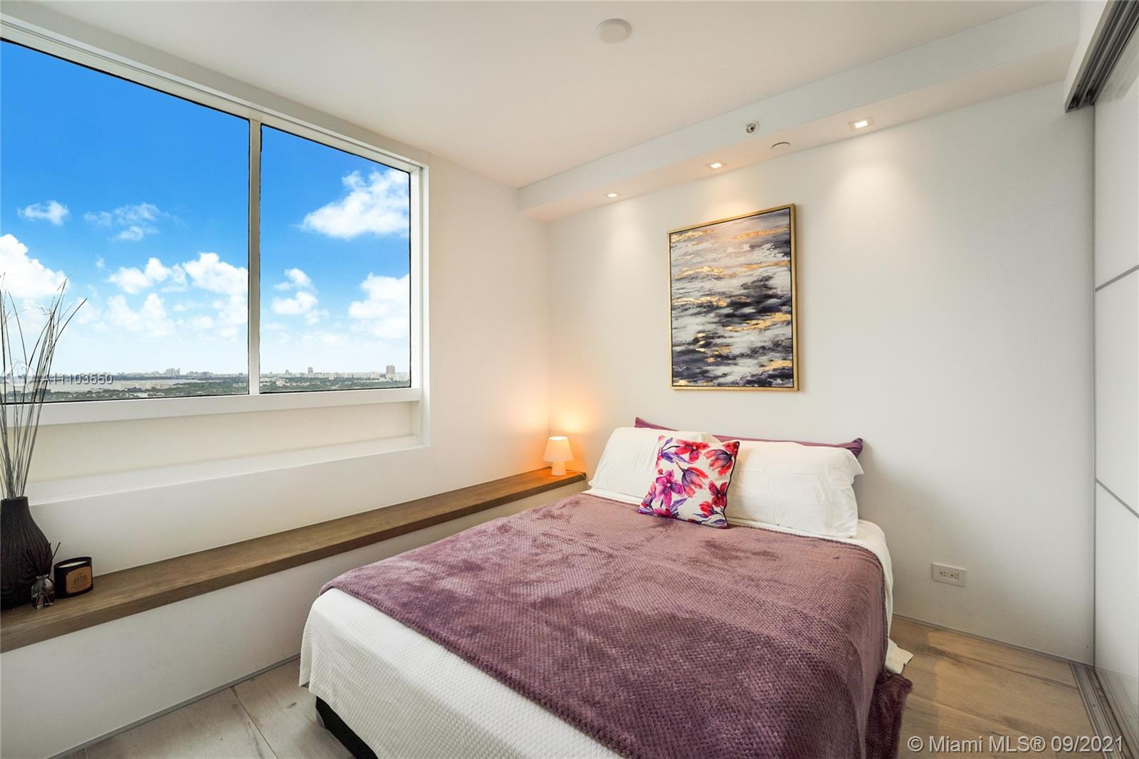 Experience the luxury of the renowned architecture and design firm Lineaire Designs and F&S Developers. This 2 bedroom, 2 bathroom condo on the 34th floor is completely renovated, featuring custom woodwork, extensive plank tiling, lacquer kitchen cabinetry, quartz counters, & modern appliances. The kitchen & living room areas have expansive city & water views, making for incredible evening and sunrise occasions. Other features include fully remodeled bathrooms, custom closet cabinetry, electric window blinds, & a large deep terrace off the living room. The Waverly is a bayfront luxury high-rise building that is full-service, including 24-hour security, front desk, valet, a bayfront pool w/jacuzzi, volleyball gym, tennis courts, business room, garage parking, & so much more.