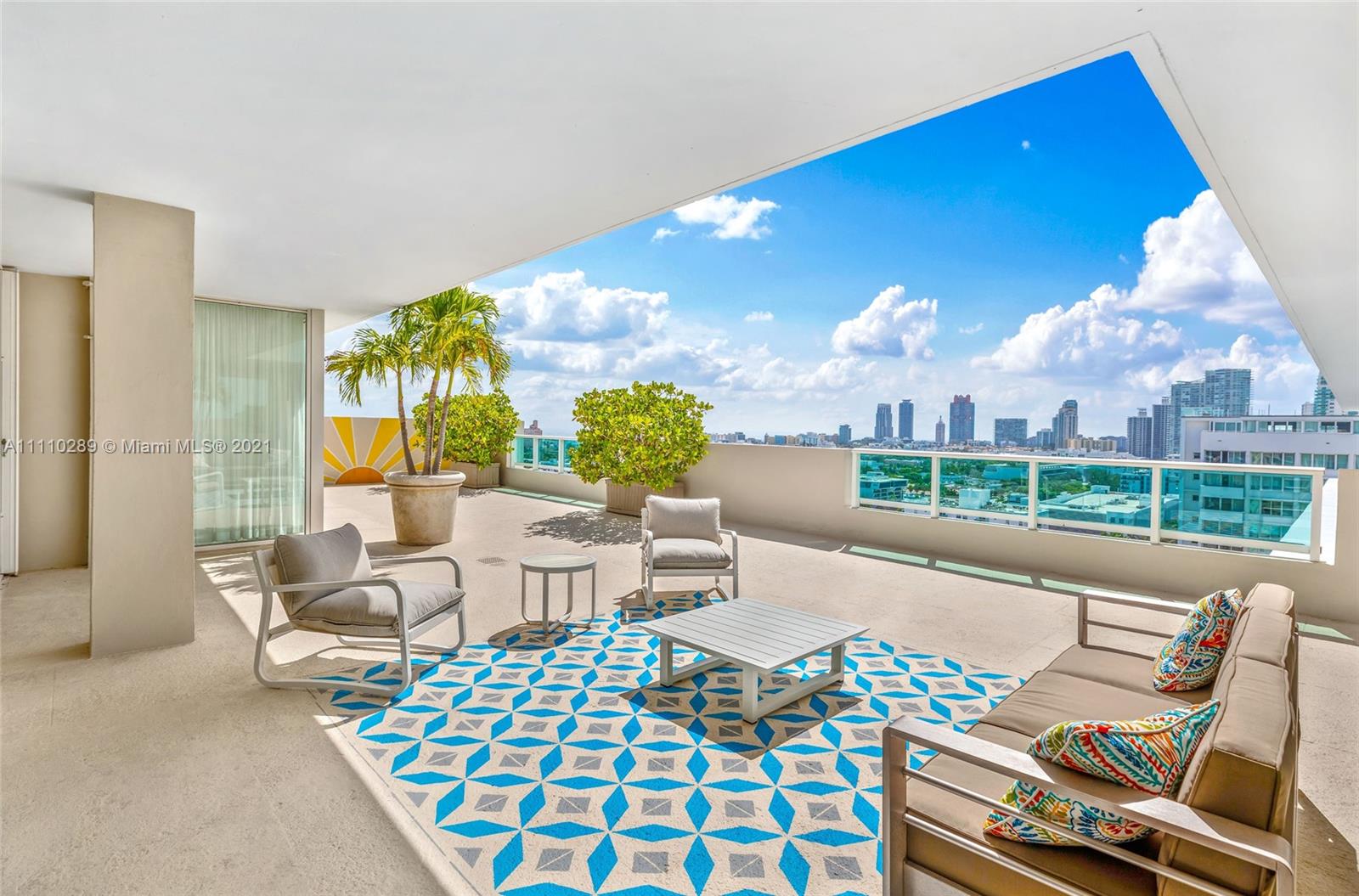 A Perfect Home in the Sky at Mirador 1200. Tower Suite Unit with almost 1200sf of outdoor rooftop boasts 1958 SF of Lavish Interior space and Open layout with Spectacular Island, Ocean and Skyline Views. PRIVATE TERRACE & Only 5 units on the Tower Suite Level. Move in Ready, Hurricane Impact Windows & Doors, 3 Full Bathrooms, Spacious Kitchen, Lots of Closets and Limestone Floors Throughout. 2 PARKING SPACES included. Additional outdoor space provides North Views of Miami Beach and Bay. Full Service Building offers vast array of amenities, Remodeled state of Art Gym, Store, Concierge, Heated Pool, Hot tub, Media/Entertainment Room. Great location just minutes to Lincoln rd, Beaches & Entertainment, Trader Joe. Whole foods, Local restaurants are at your doorstep. Best Value on South Beach!