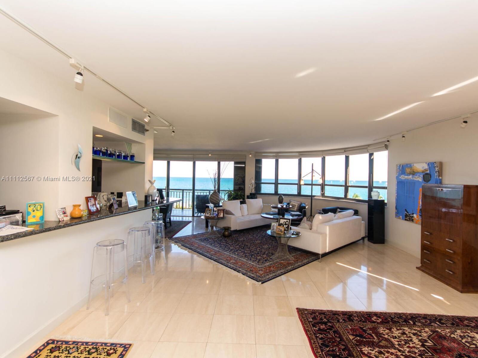 Rare Southeast Oceanfront corner with 2 large terraces and 3 bedrooms 2 1/2 baths. Unparalleled vistas of the Atlantic ocean and south. The is an open kitchen with Granite Counters, Sub Zero Refrigerator and wine cooler, dish washer, central air cond system, washer, dyer in separate laundry room. Entire apartment on sound system with speakers in all rooms, Miele Espresso Maker in kitchen, light fixture over dining room table not included Etched glass sliding glass Arte Deco doors going to office not included
