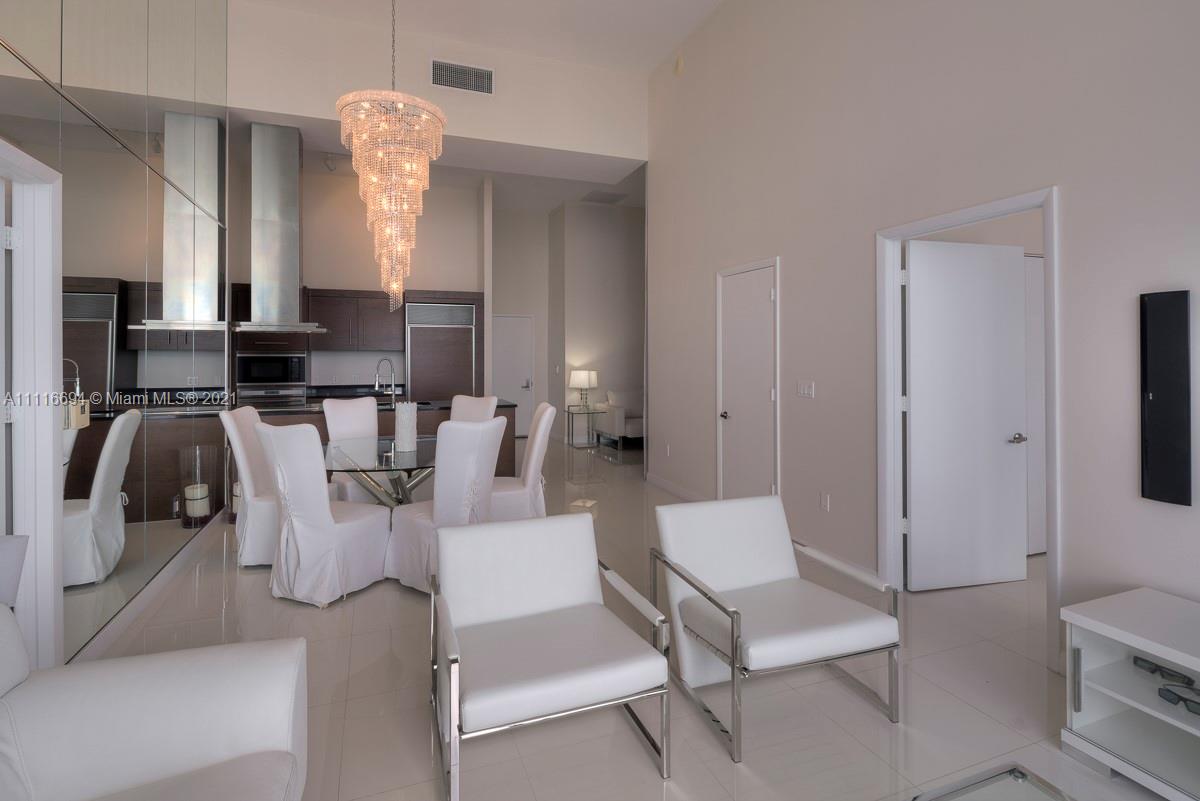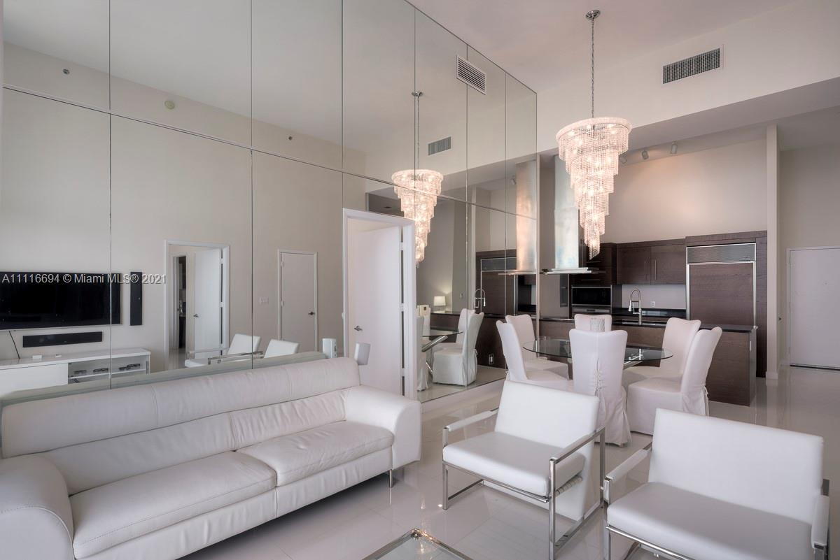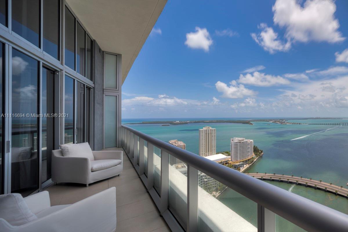 An impressive 2 Bed + Den/2 Bath condo residence w/ 1,518 interior square feet, a 220-square-foot-balcony, 16-FOOT-HIGH CEILINGS, white porcelain tiled floors, motorized shades in both bedrooms, and three crystal chandeliers. Breathtaking views of Biscayne Bay and Brickell skyline from the 41st floor. Building amenities include a 300-foot long swimming pool, 50-person hot tub, state-of-the-art fitness center, full-service spa, on-site restaurants, theater, game room, full-service concierge, valet parking, and more. Includes 1 assigned parking space.