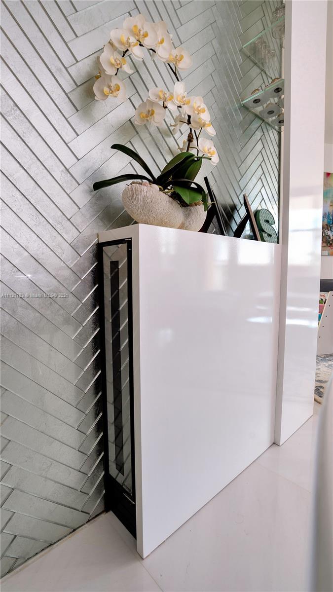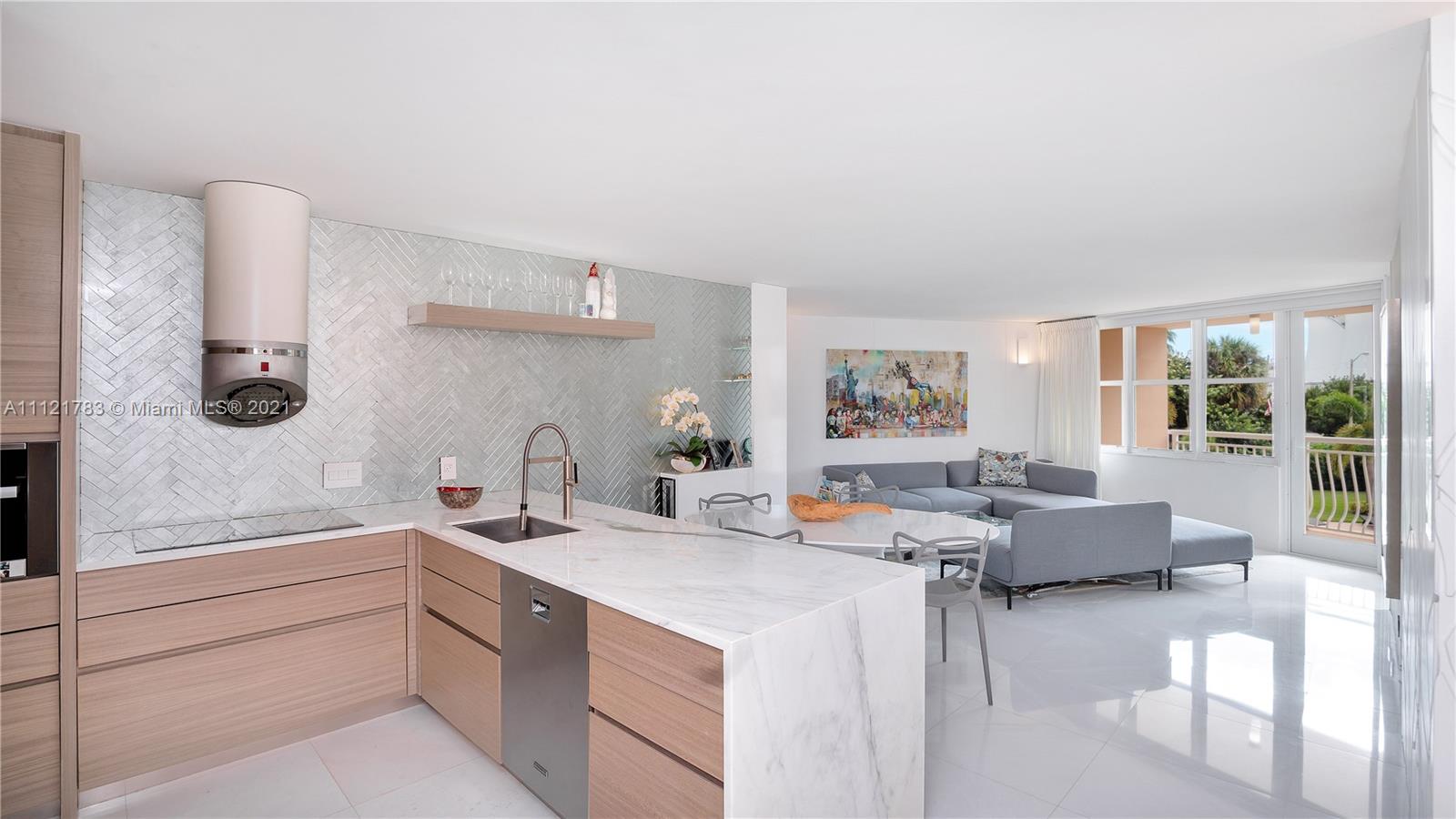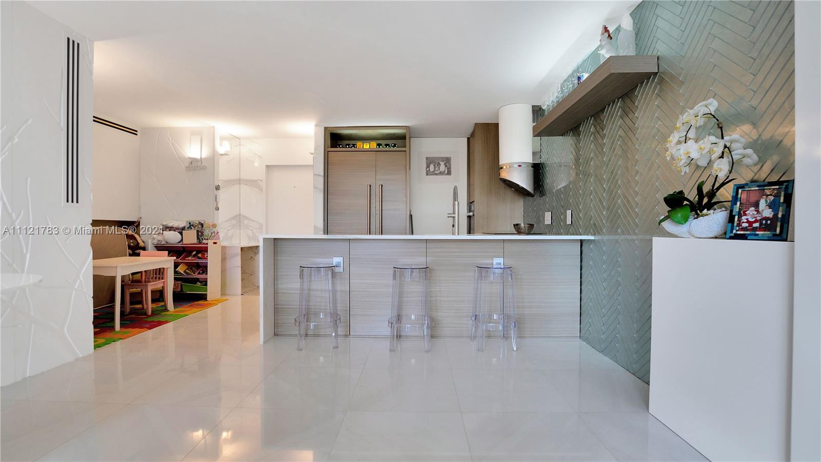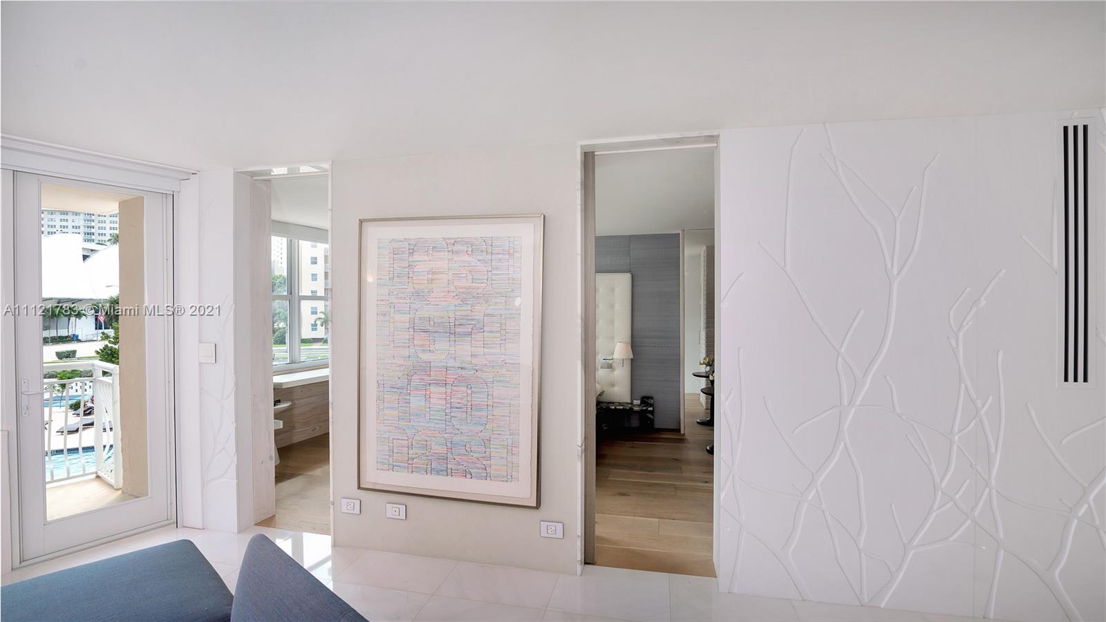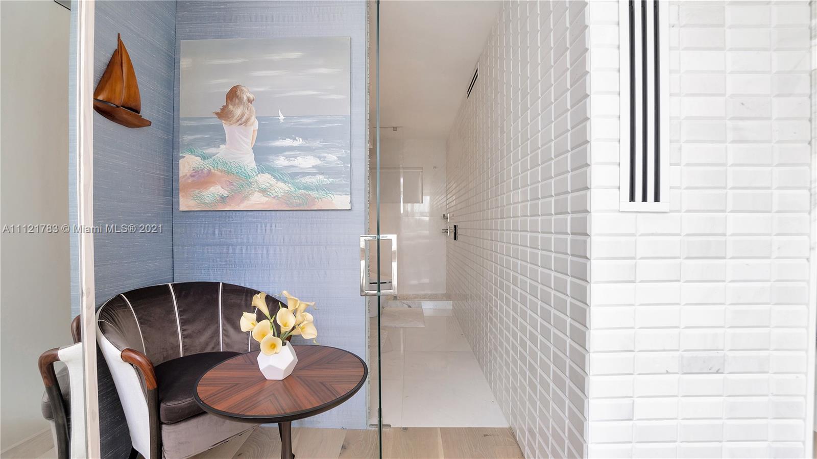 An extraordinary modern, completely custom living experience, right across the ocean, where every space was created to achieve resort-like lifestyle, this one bedroom apartment has exquisite features. The high-end custom kitchen has sub zero and Miele appliances, ceramic cook top, organic Calacatta Italian marble counter top, water fall designed to accommodate 3-4 bar stools and a sophisticated herringbone backsplash wall covered with glass silver tile selected by an Ann Sacks designer and 2 wine cooler refrigerators. Top of the line bathroom, double custom organic marble vanity, highly crafted shower space and Japanese toilet. White floor marble and white oak floor, automated shades, linen custom curtain, balcony looking over the pool, hurricane impact windows with UV protection.