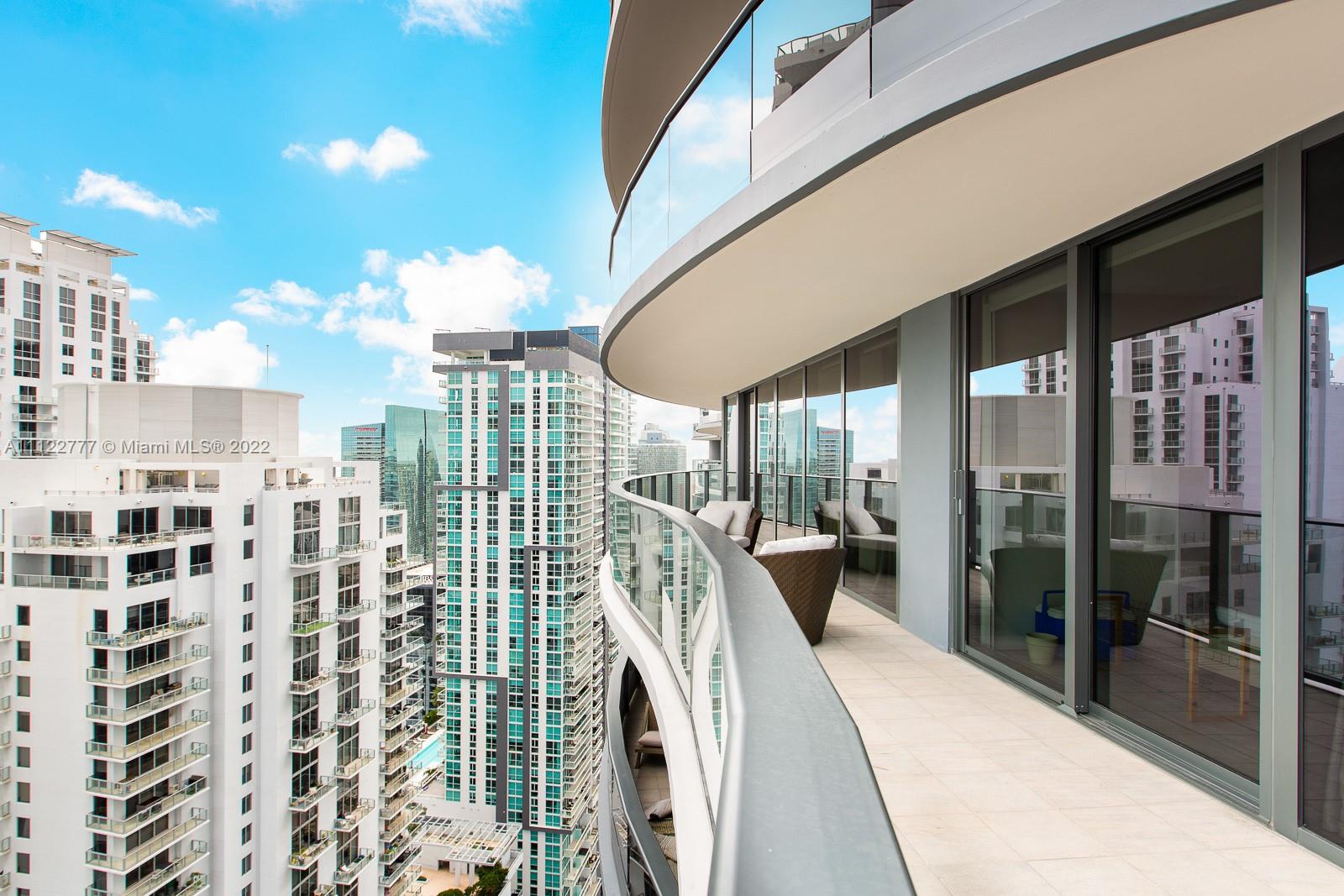 Magnificent skyline views complete this brand new condo in the unique architectural icon developed by Ugo Colombo. With 1,236 Sq.Ft., its glass walls and elliptical balconies wrap around the 2 bedrooms and 2.5 bathrooms, open kitchen with Miele appliances, and living/dining room area. The imported Italian marble floors, accent walls, custom-designed cabinetry create a sophisticated style for easy living. This unit has a spacious washer and dryer room with 2 parking spots. The amenities include a spa, gym, 2 pools, theater, lounge, billiards room, personal concierge, children's pool, and playroom, plus a secure parking garage with electric vehicle charging stations. Walking distance to all Brickell has to offer. This unit is ready to move in upon closing, No tenant in place.