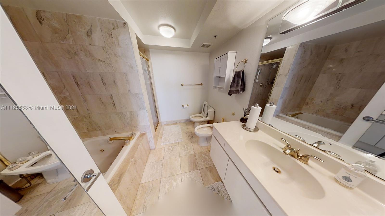 One bedroom + guest 1/2Bath in Sunset Harbour South Tower. Balcony Faces East. Tile flooring throughout. Separate Shower & Bathtub in master. Washer/Dryer closet. Bldg amenities: Bay walk, marina, fitness center, 2 pools, 1 assigned parking P1030 & valet parking.