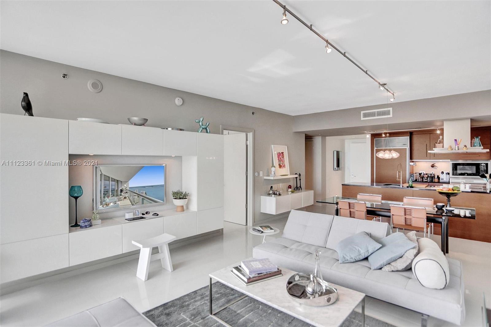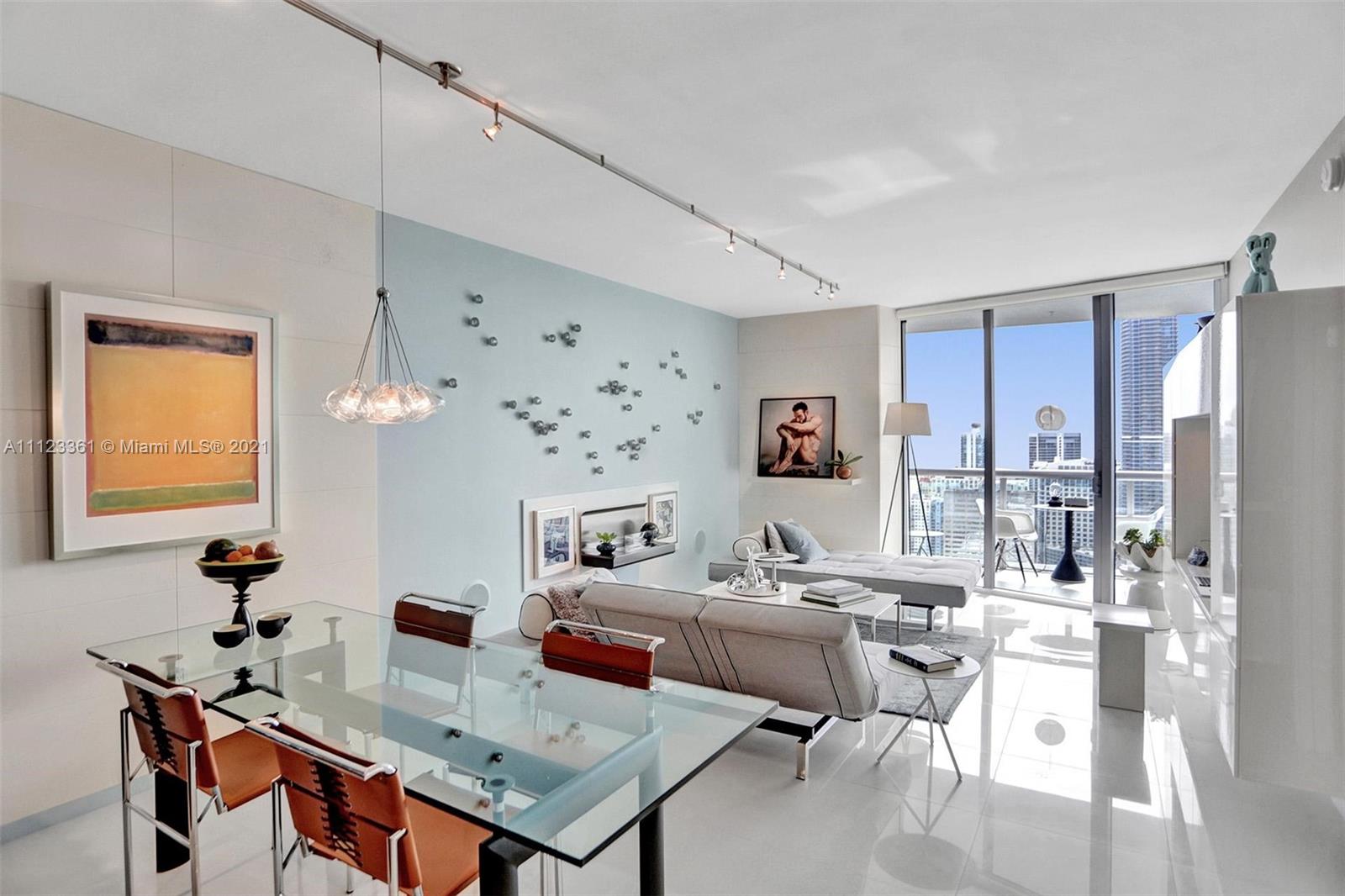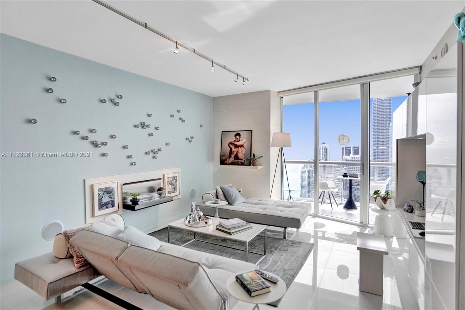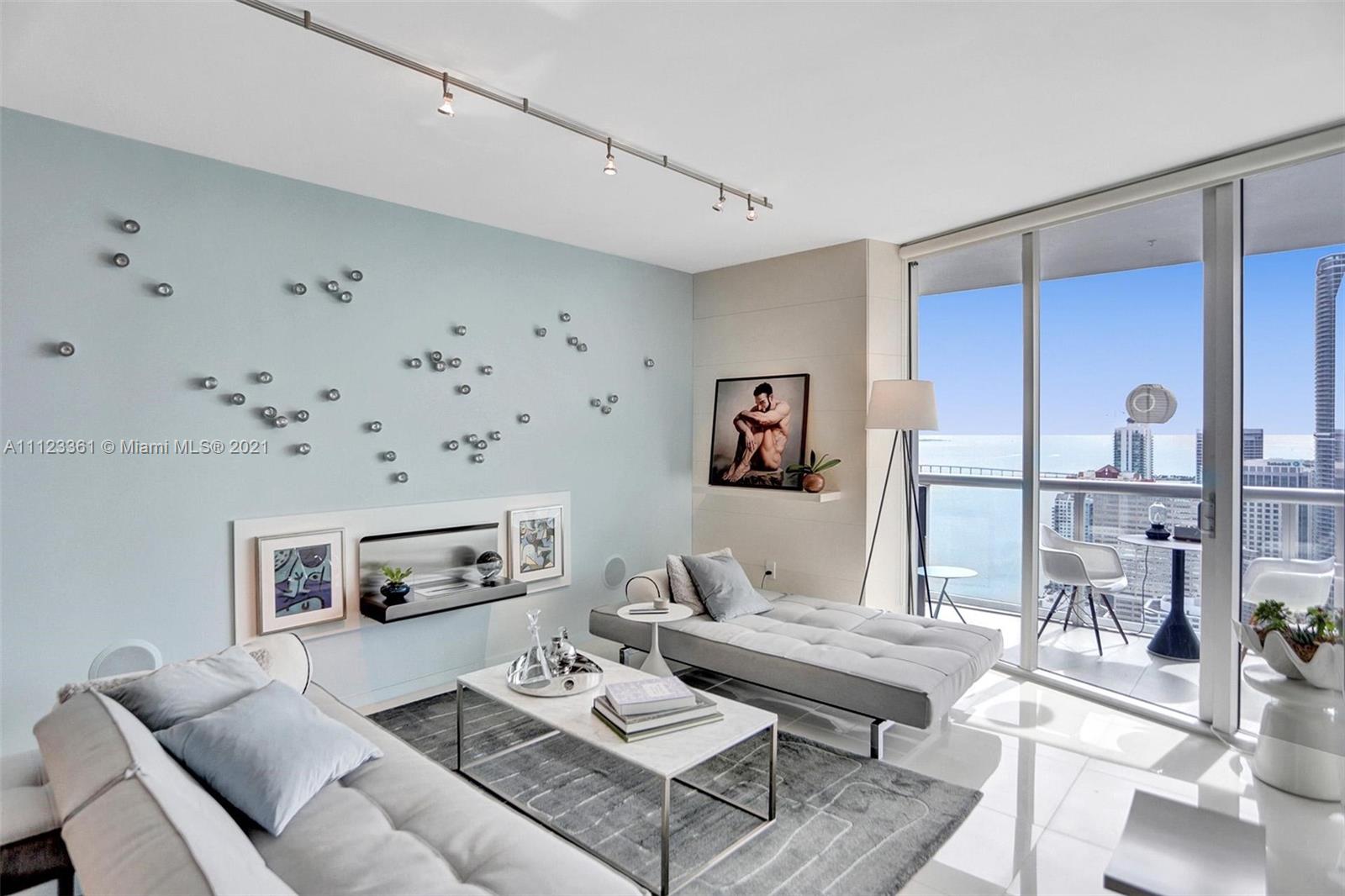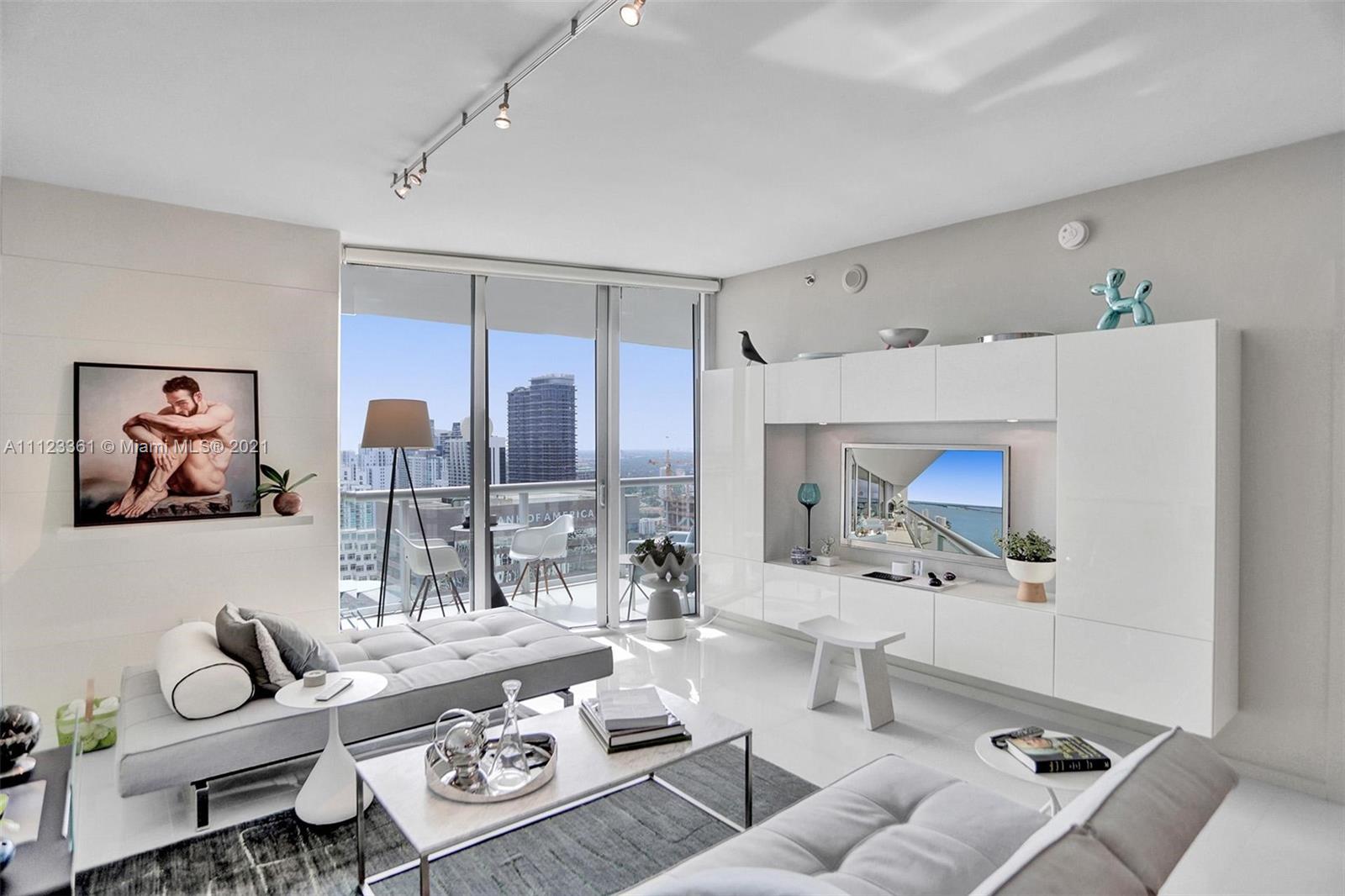 Beautifully designed and professionally decorated! There is no other unit like it! This residence offers incredible high floor bay and magical city views along with amazing finishes and tech automation! Features include beautiful 24X24 interior white glossy porcelain floors -flat finish on the balcony. Custom media built-ins with storage, open kitchen with high-end appliances, Lutron controlled light switches, track lighting and dining room light fixture by tech lighting, nest thermostat, built-in wall speakers, built-in ethanol fireplace, wireless outdoor Sonos speaker, led light strip on balcony. Bedroom has walk-in closet with custom built-ins, en-suite bathroom with double sinks and mirrors. 2 TV’s and 2 DVD’s also included. Live at one of the most desirable addresses in Miami.