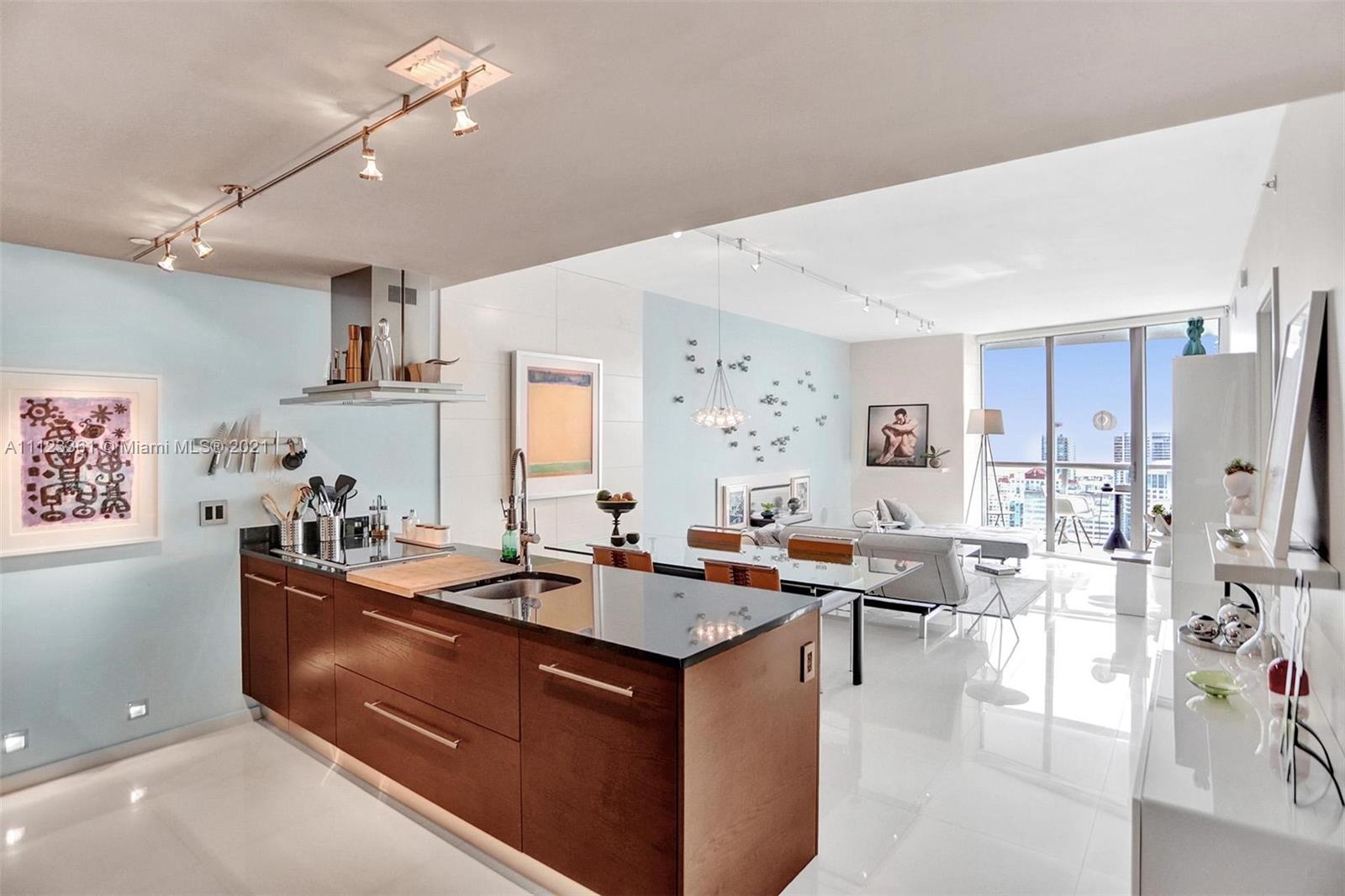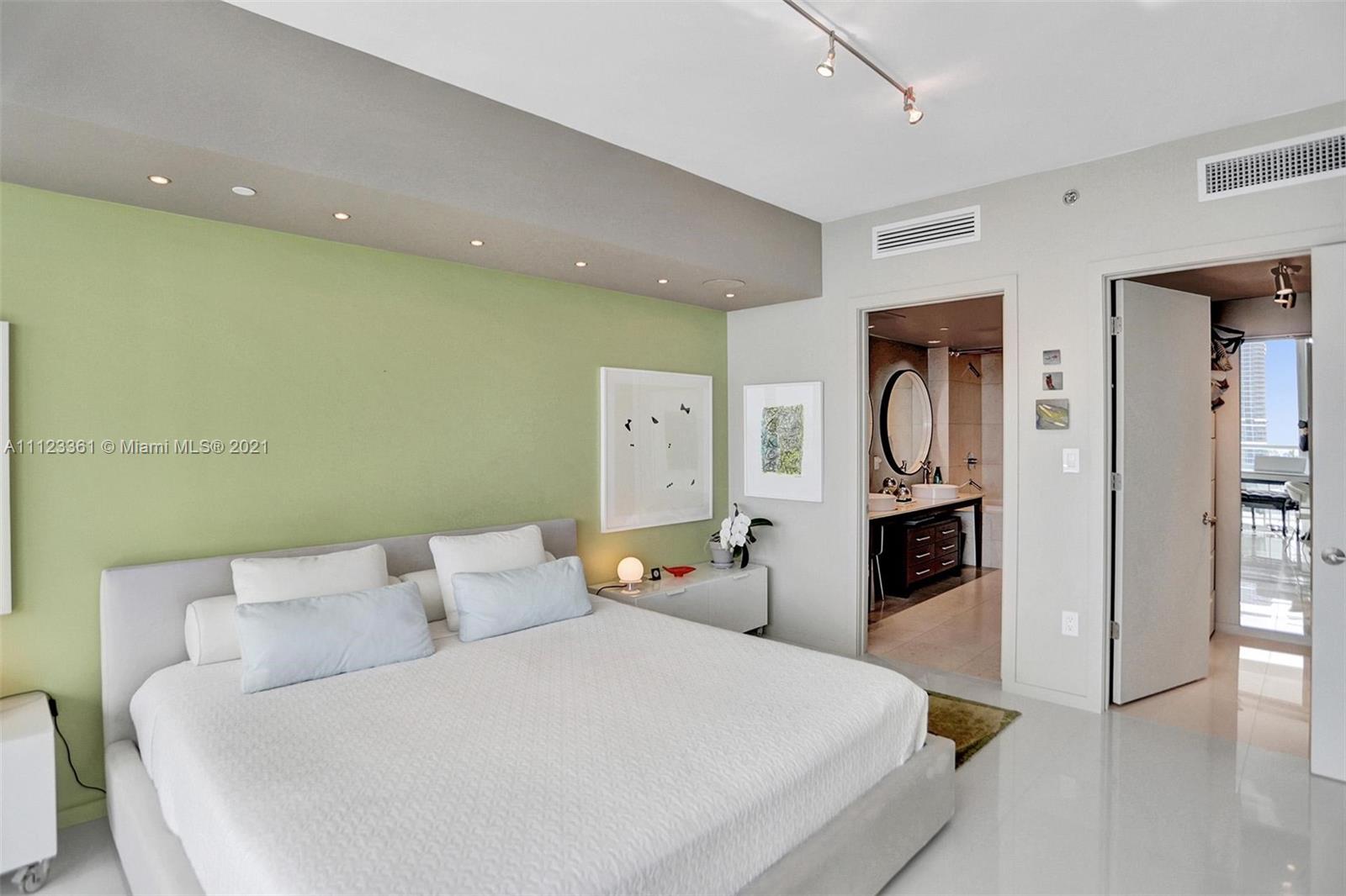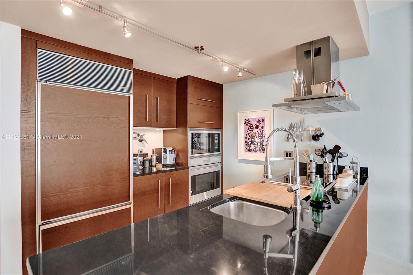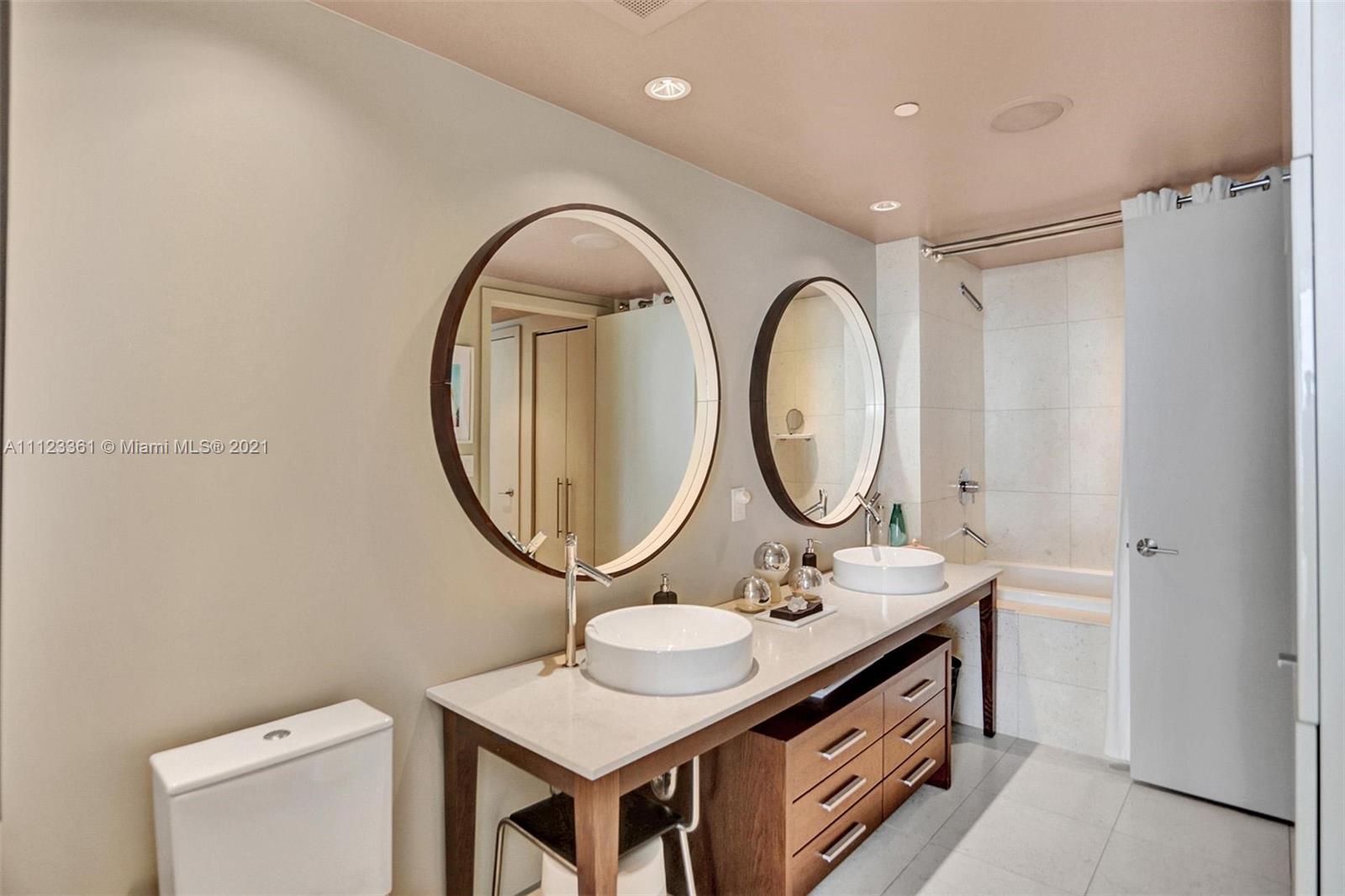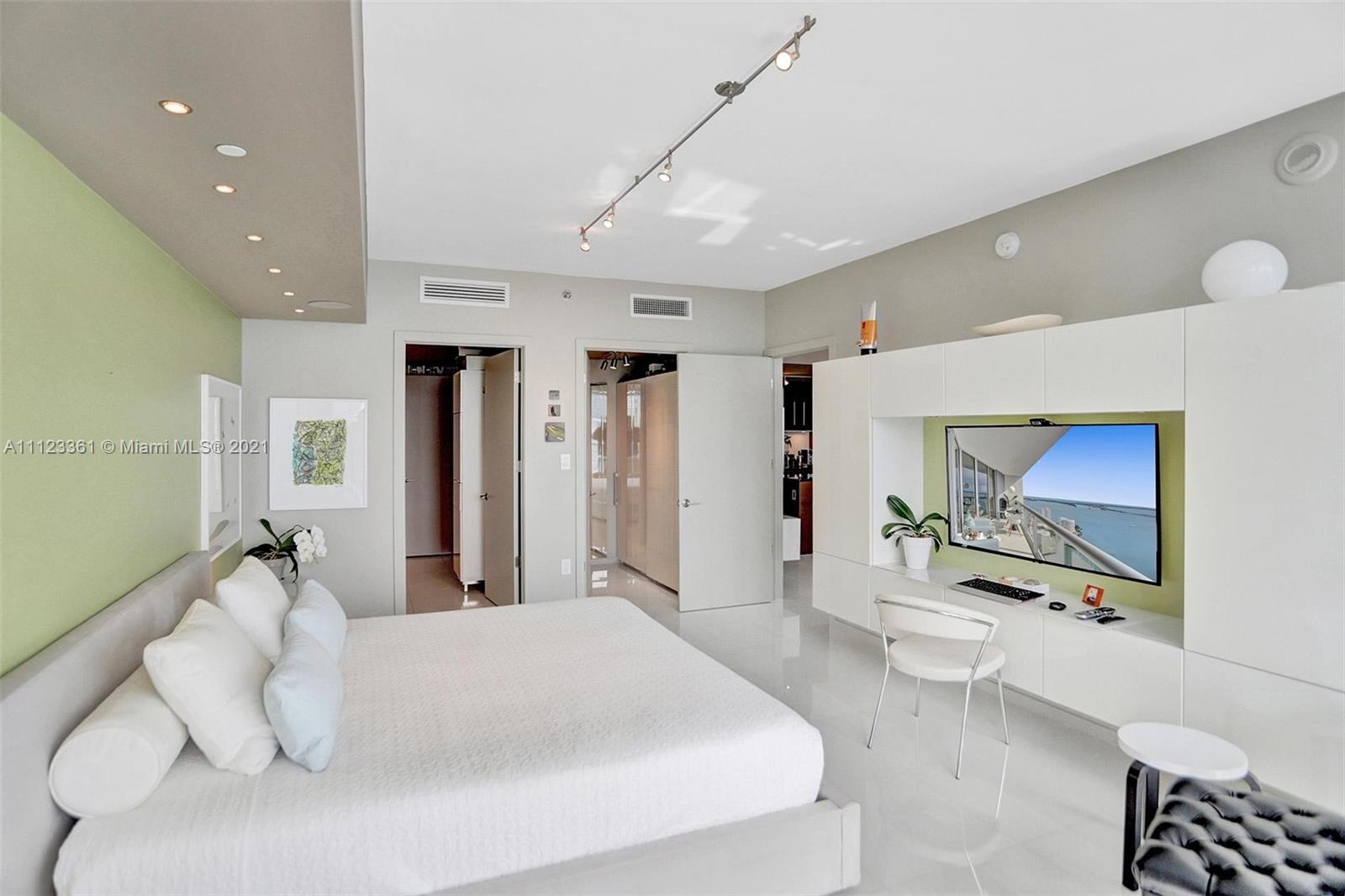 Beautifully designed and professionally decorated! There is no other unit like it! This residence offers incredible high floor bay and magical city views along with amazing finishes and tech automation! Features include beautiful 24X24 interior white glossy porcelain floors -flat finish on the balcony. Custom media built-ins with storage, open kitchen with high-end appliances, Lutron controlled light switches, track lighting and dining room light fixture by tech lighting, nest thermostat, built-in wall speakers, built-in ethanol fireplace, wireless outdoor Sonos speaker, led light strip on balcony. Bedroom has walk-in closet with custom built-ins, en-suite bathroom with double sinks and mirrors. 2 TV’s and 2 DVD’s also included. Live at one of the most desirable addresses in Miami.